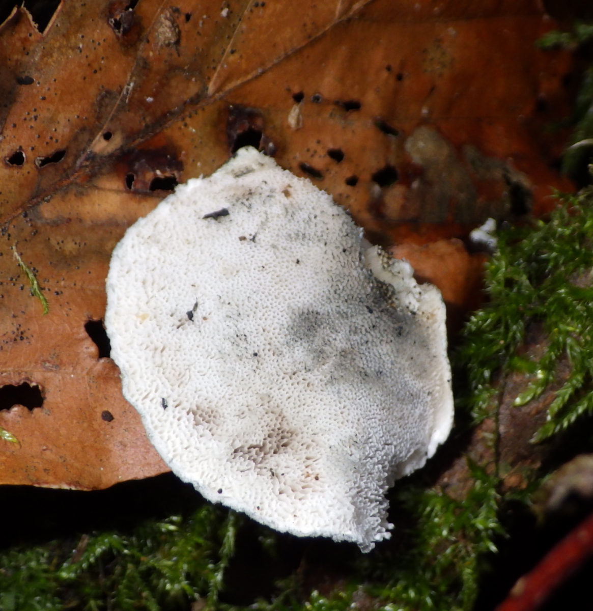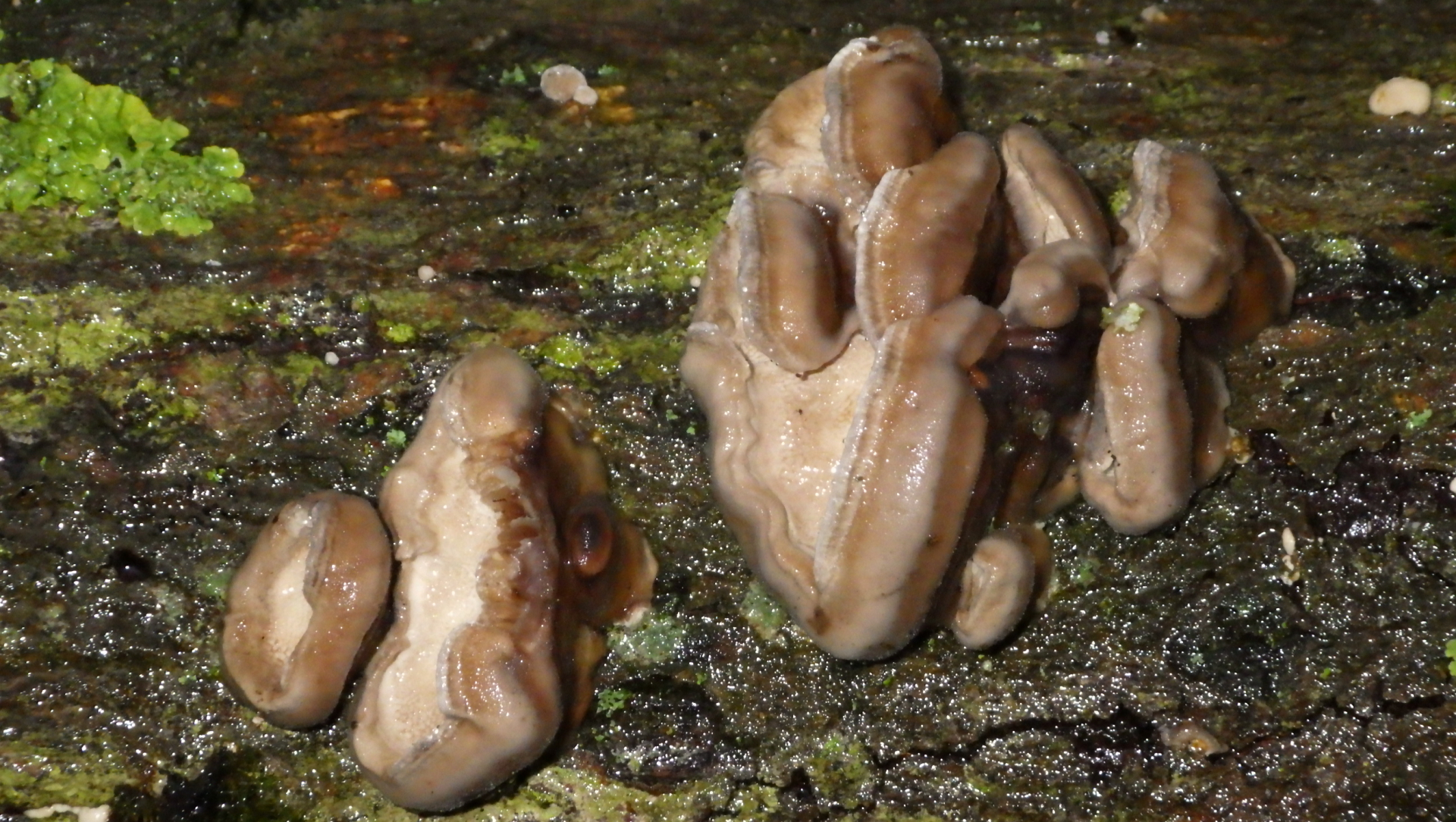 Ich würde am ehesten, wie weiter oben, auch Trametes hirsuta vermuten. Junge Fruchtkörper können so aussehen. Die Zuwachskanten passen auch dazu.