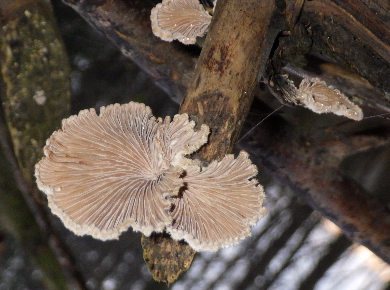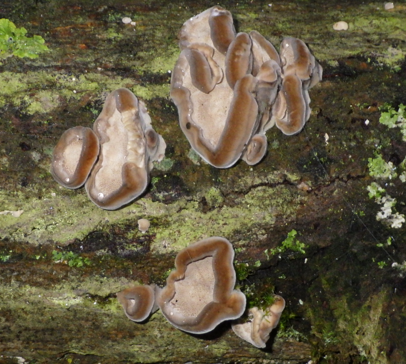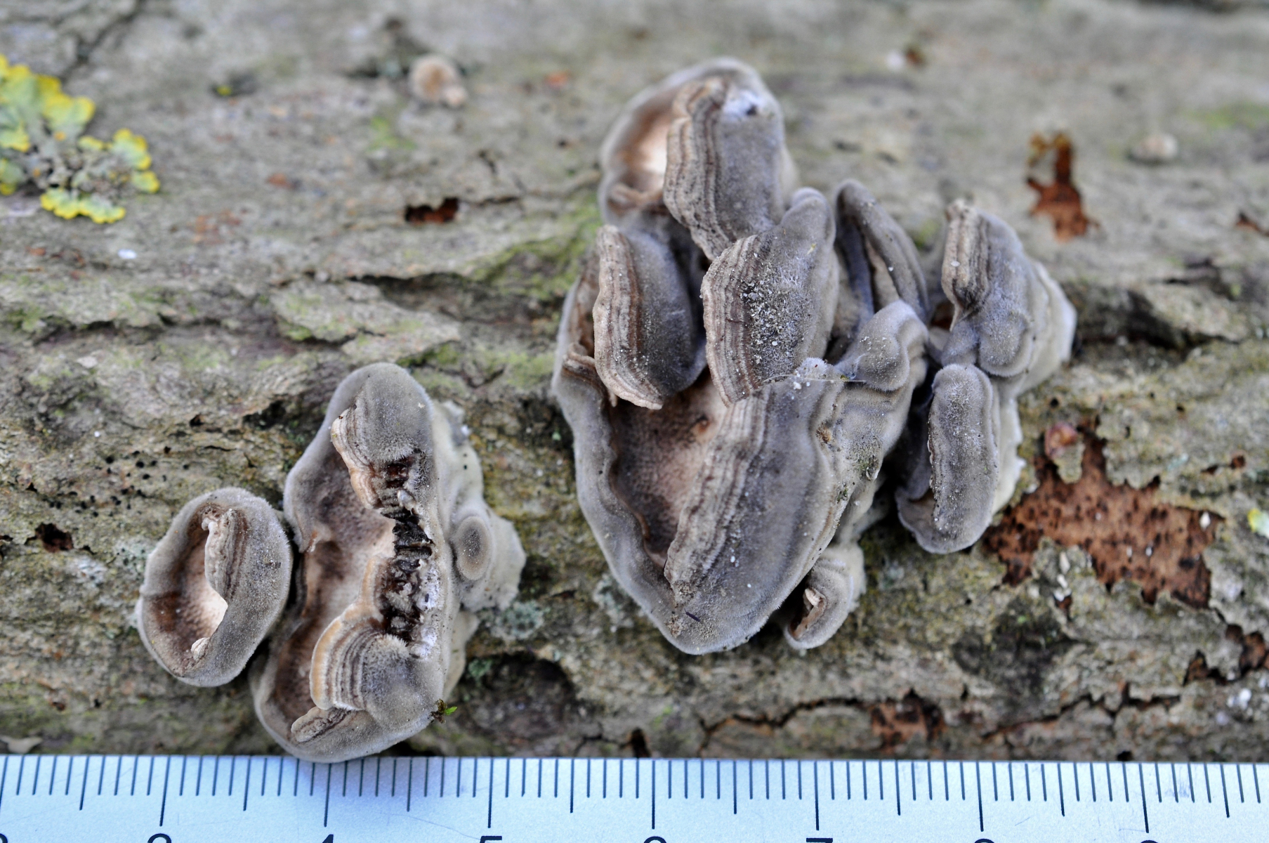 Bei den letzten ist es wohl so, daß der Stamm seine Lage verändert hat wärhrend dem Wachstum der Fruchtkörper. Da schließe ich mich aber auf jeden Fall Werners Gedanken an: So sehen junge Striegelige Trameten (Trametes hirsuta) aus.