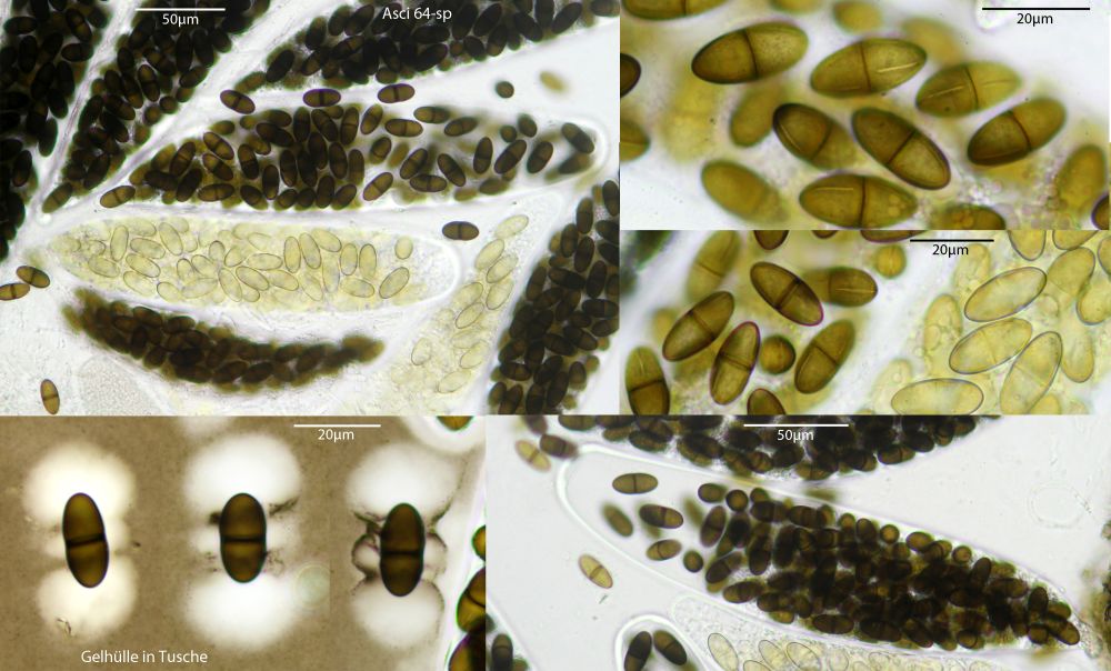 Hier nun die Gelhüllen in Tusche sichtbar gemacht. Sieht etwas anders aus als in der Originalbeschreibung, aber in Wasser sieht man auch die großen Teile an den Sporenenden auch nur sehr schwer, bei manchen Fotos von Sporen in den Asci kann man es sehen, wenn man weiß worauf man schauen muss. Bei einzelnen freien Sporen hat man da keine Chance. Die Aufteilung der Hülle erinnert mit der Dreiteilung an die von Trichodelitschia minuta: