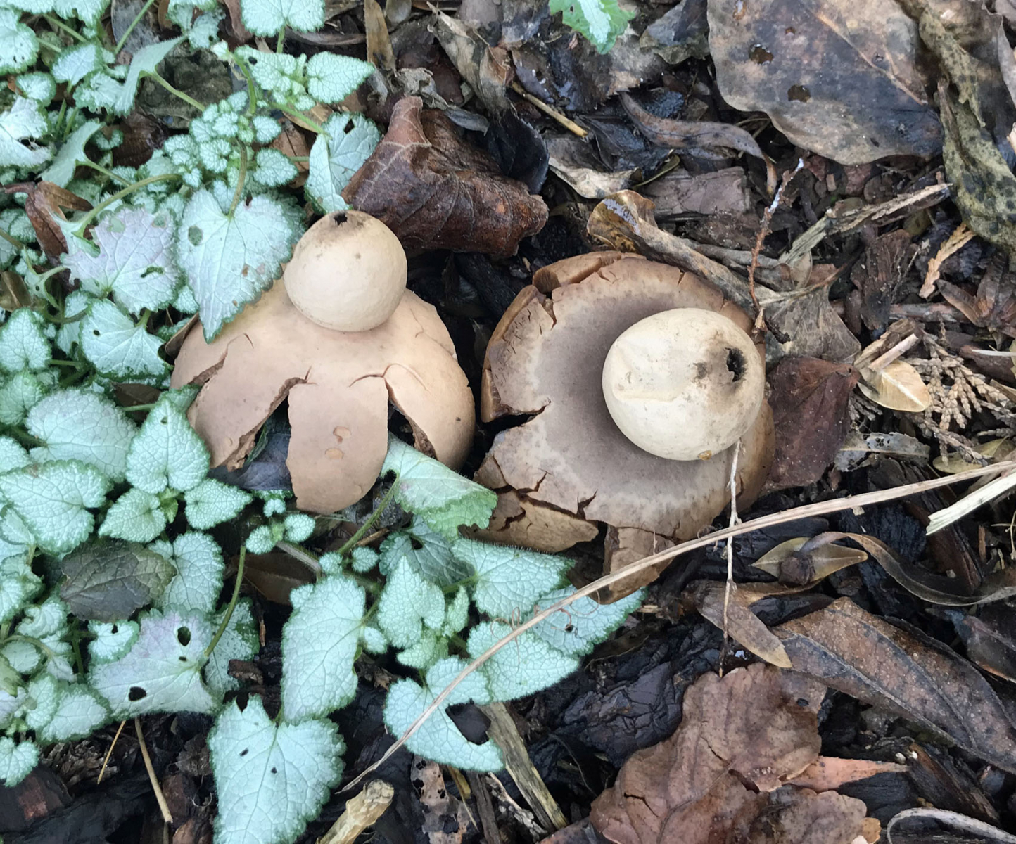 Auf den ersten 3 Fotos sehe ich den Halskrausenerdstern- Geastrum triplex. Der sieht im noch geschlossenen Zustand wie eine Zwiebel aus, d.h. nicht völlig kugelig, sondern mit einer ausgezogenen Spitze. Das sieht man auf den ersten beiden Fotos bei den jungen Fruchtkörpern gut. Die Halskrause bildet sich erst wenn der Fruchtkörper vollständig ausgebreitet ist oder schon älter ist wie bei Foto 3. Auch hat Geastrum triplex ein gehöftes, gewimpertes Peristom, d.h. um die Mündung ist ein Hof (auf Foto 1+2 zu sehen.) und das Peristom ist fransig.