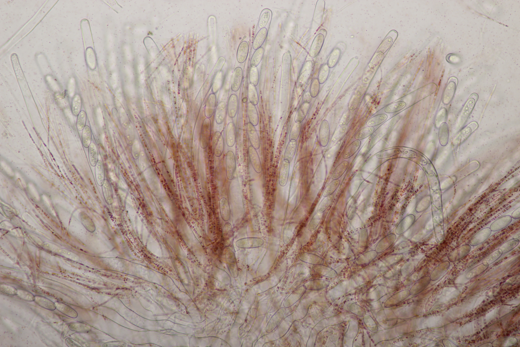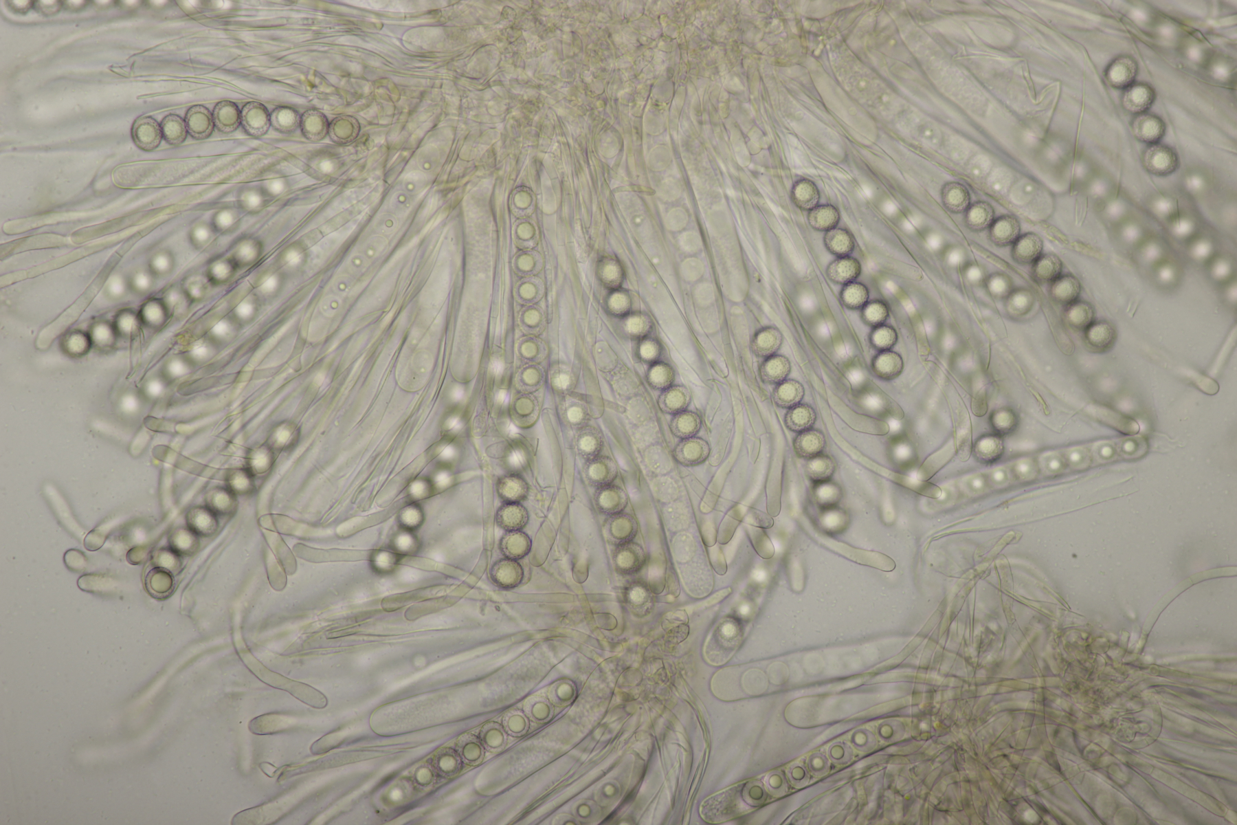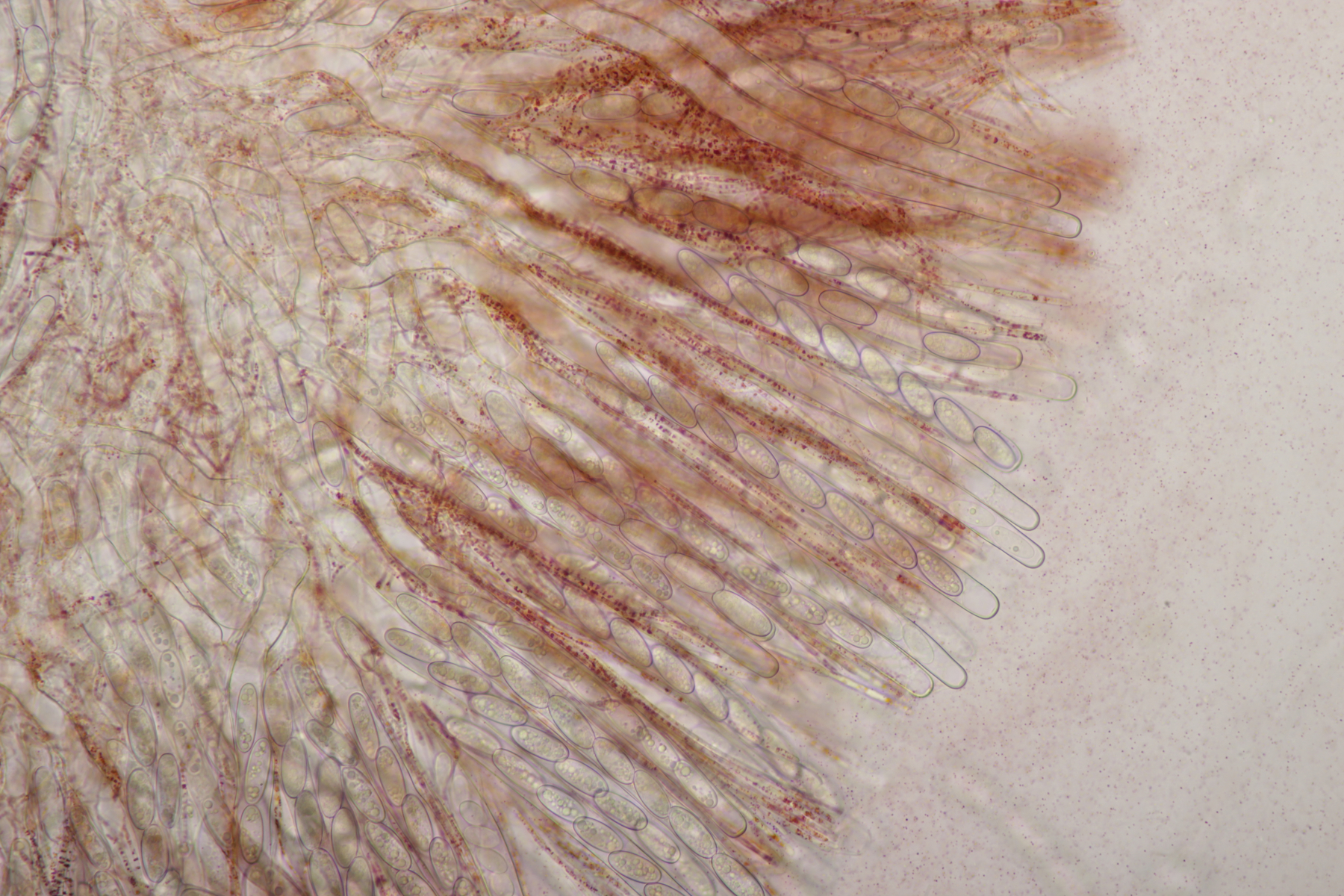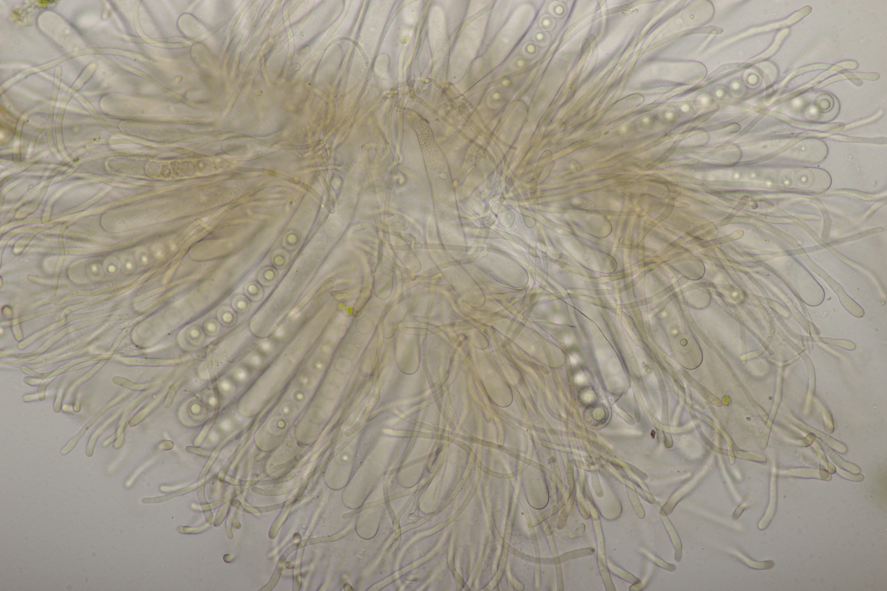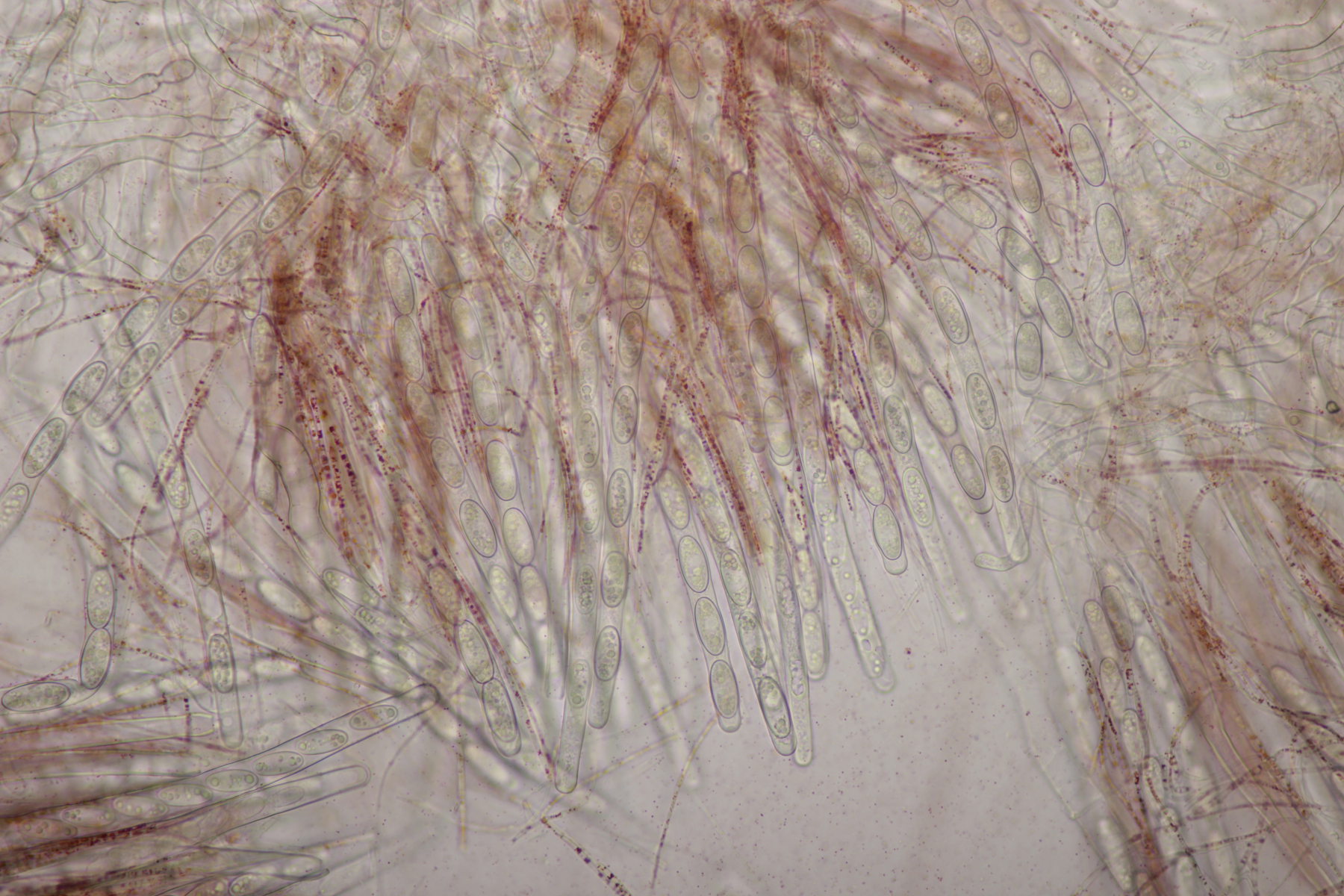 mit den Sarcoscyphas habe ich so meine Probleme. Wichtig ist aber die weiße Ausenschicht. Die Haare müssen bei Austriaca stark gekräuselt sein. Wenn sie glatt sind/gerade, dann wirds interessant. Bisher waren bei meinen Sichtungen immer die Haare gekräuselt, so dass ich bei der Bestimmung kein Problem hatte. Ich sage das, weil ich die Sporen von S. austriaca nicht so schmal zylindrisch kenne. Hast du dir auch die Außenseite mal angesehen? Auf den Fotos sehe ich nur Asci.