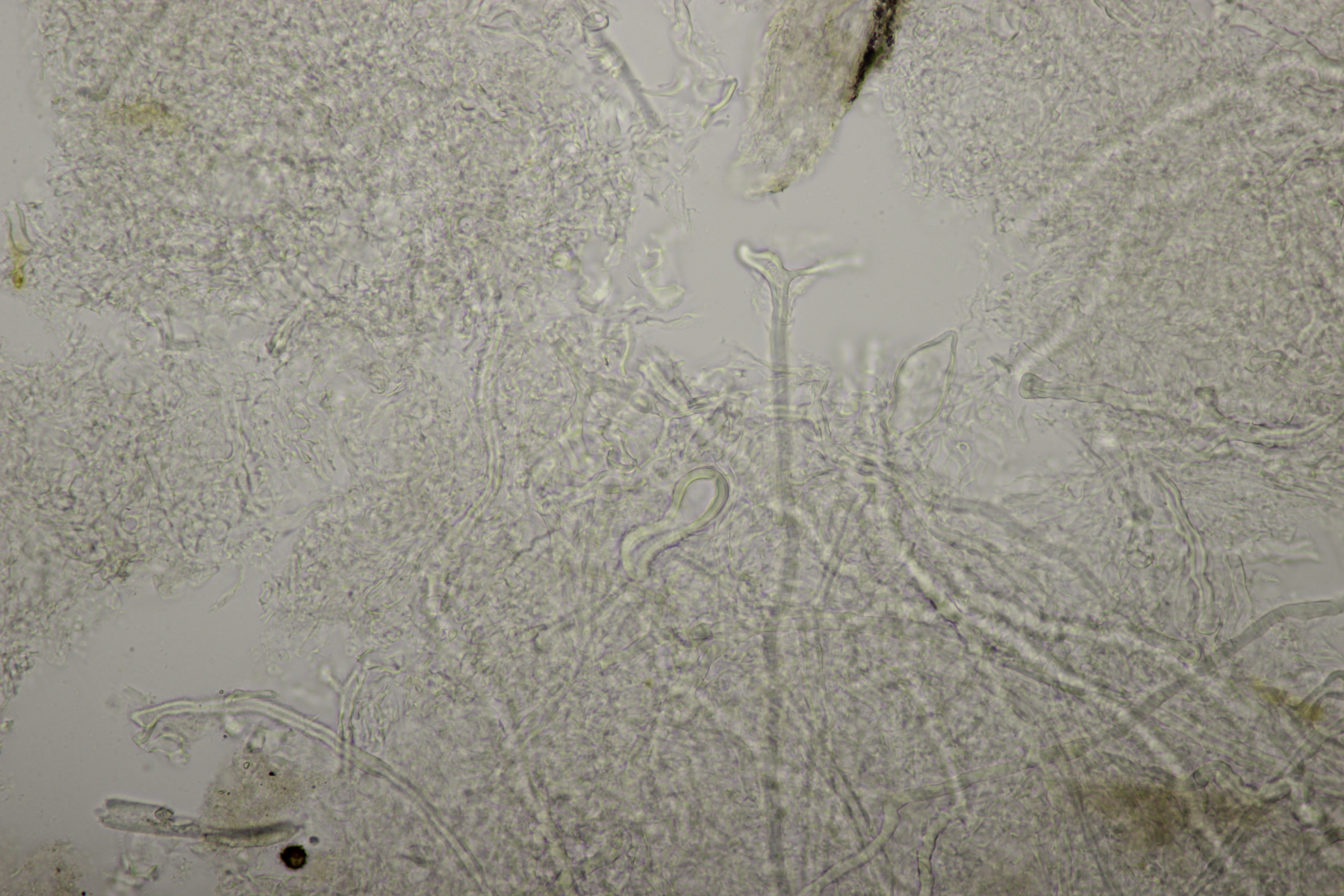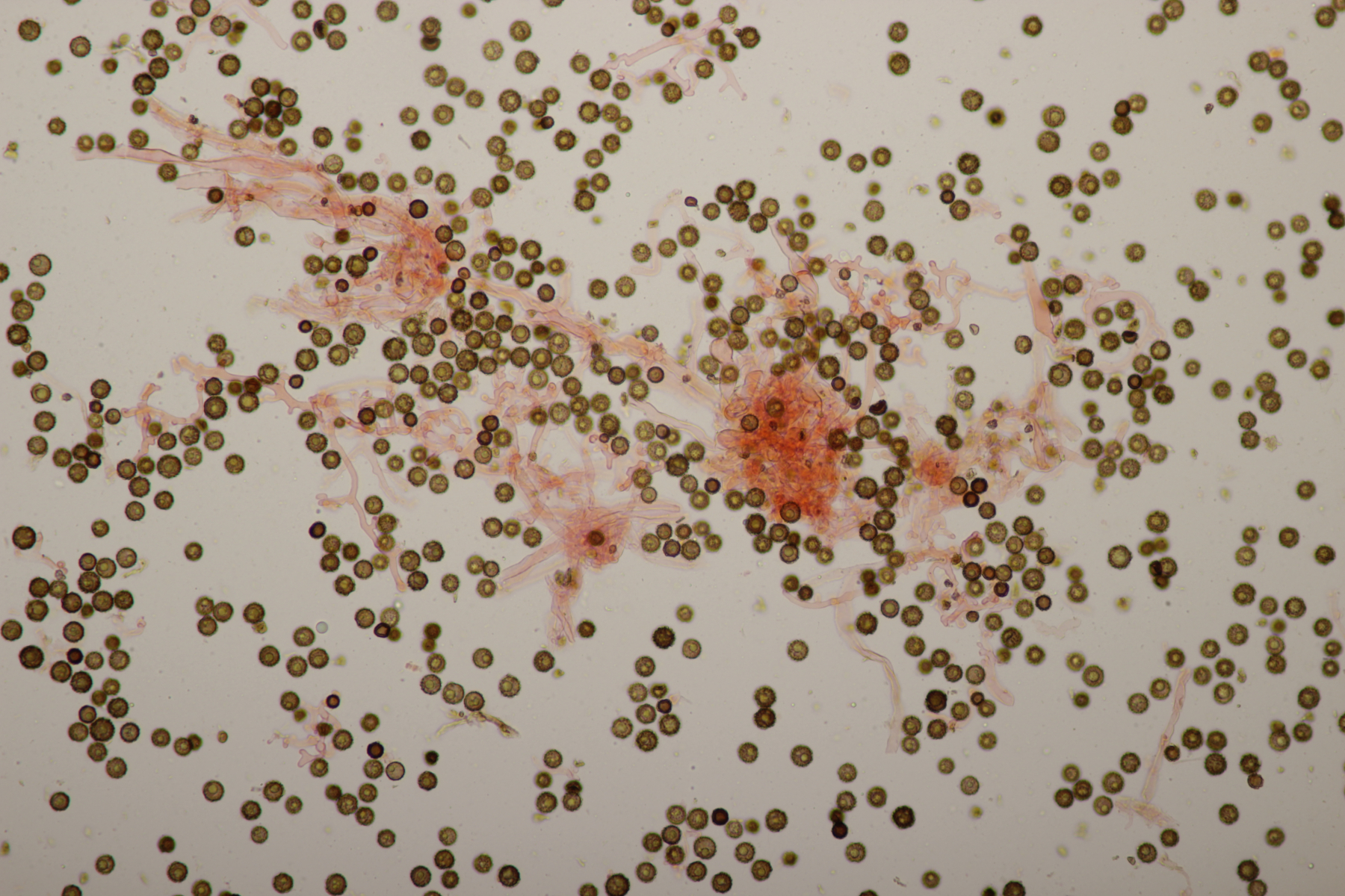 11. Hier bin ich ratlos. Zuerst hatte ich ja auf einen unförmigen Ascomyceten getippt, aber im Mikroskop gab es dann nur einige sehr dickwandige Hyphen. Hat da jemand eine Idee?