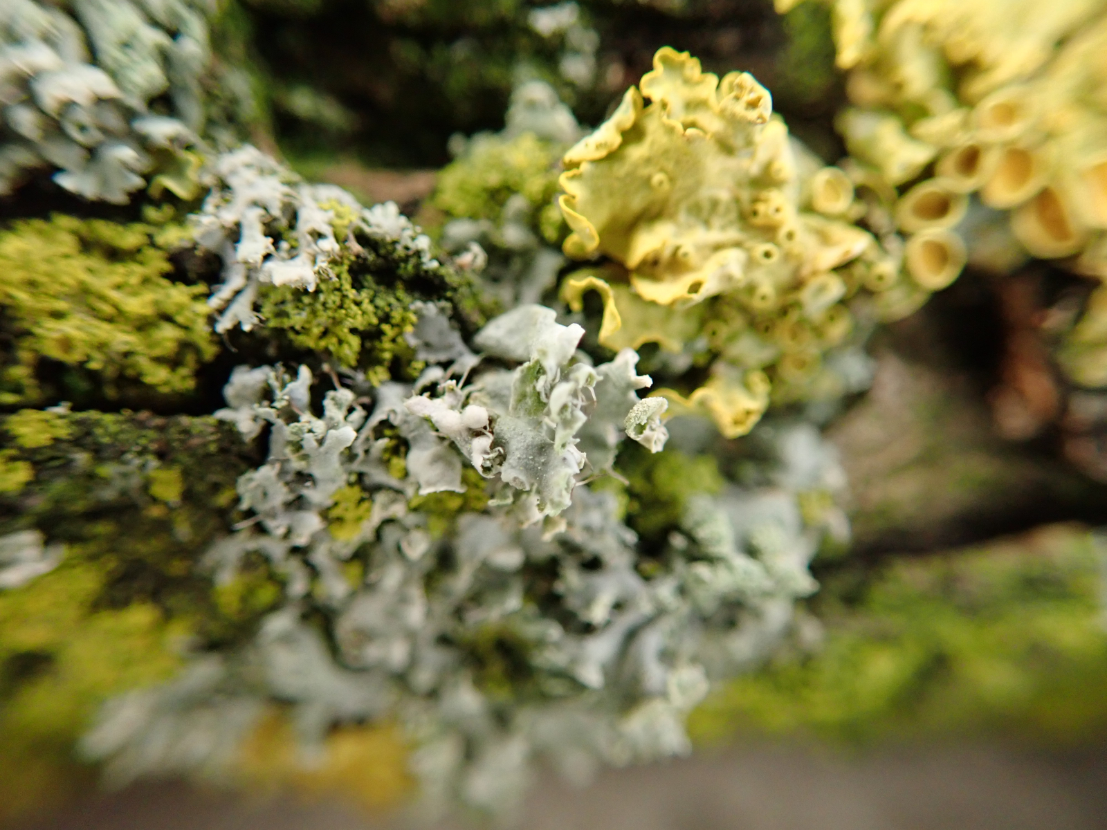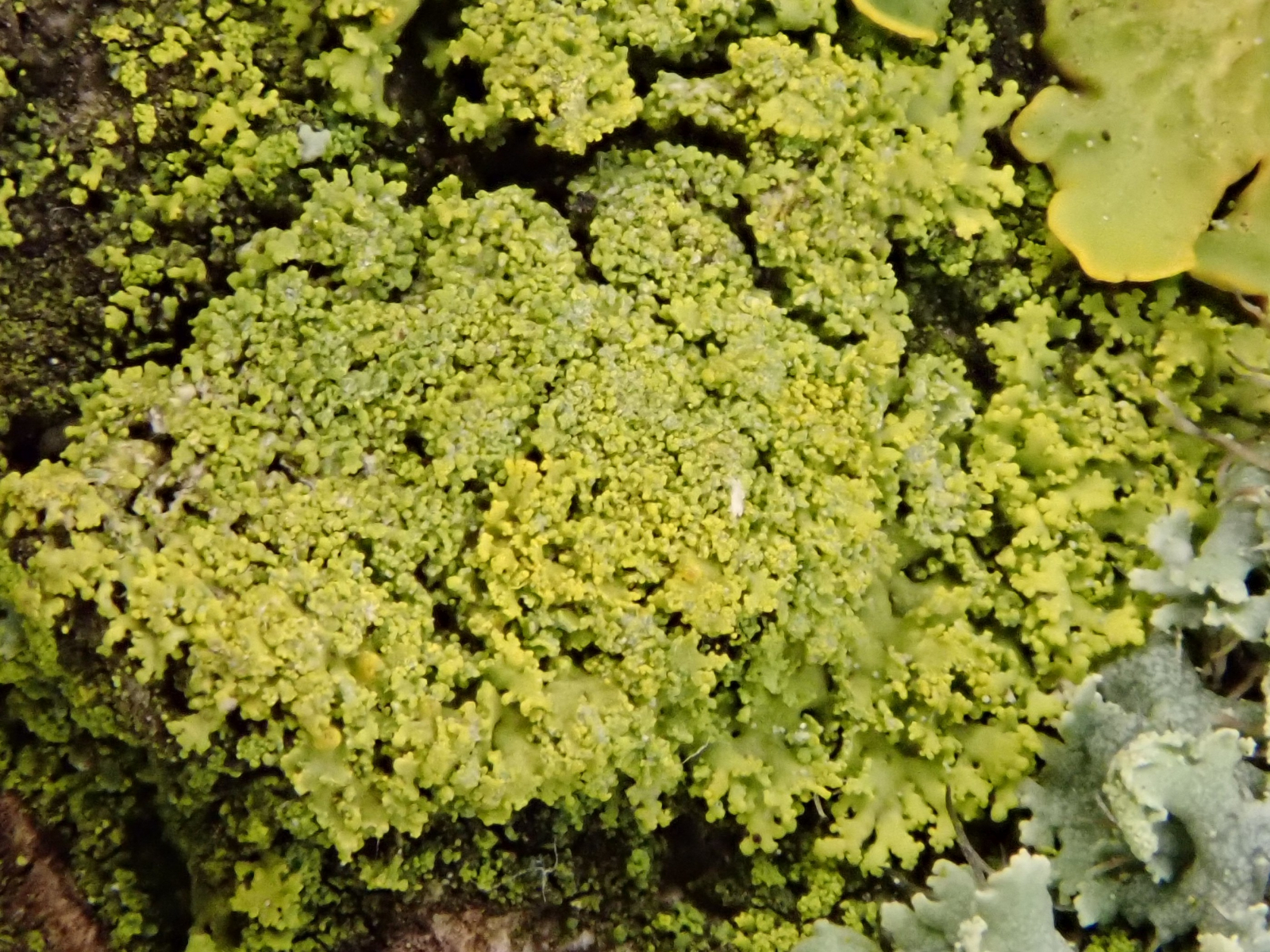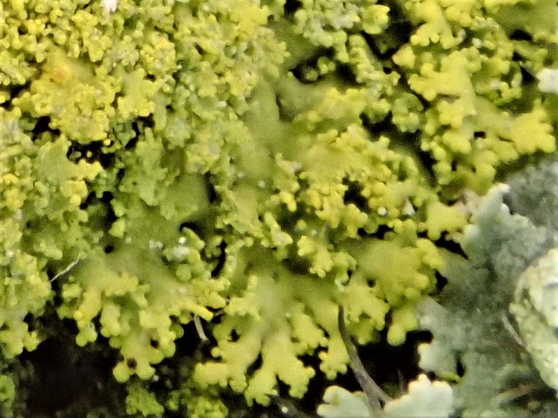 Hier sind noch Bilder von dem gelbgrünen Gebrösel, von dem ich dachte, es wäre nichts, oder vielleicht der Anfang der richtigen Flechten.