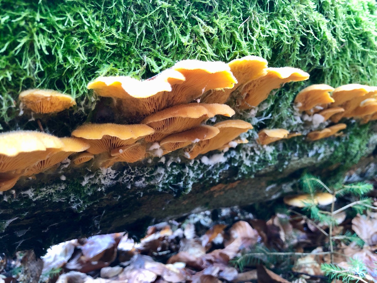 5 Hier das Highlight des Tages. Ein alter gespaltener Buchenstamm mit Orangeseitlingen und Striegeligen Schichtpilzen.