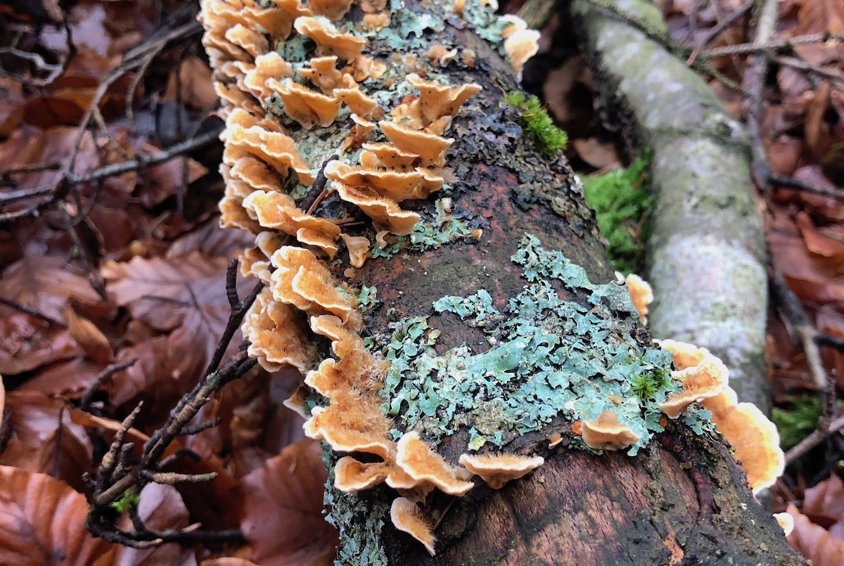 5 Hier das Highlight des Tages. Ein alter gespaltener Buchenstamm mit Orangeseitlingen und Striegeligen Schichtpilzen.