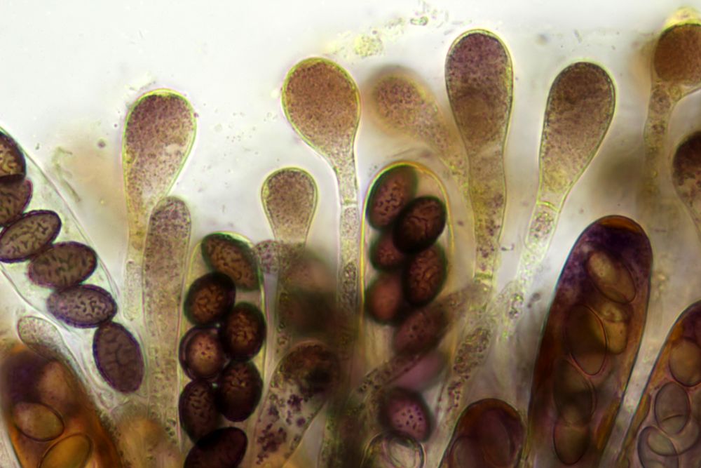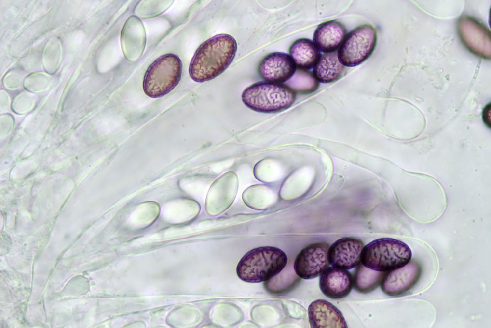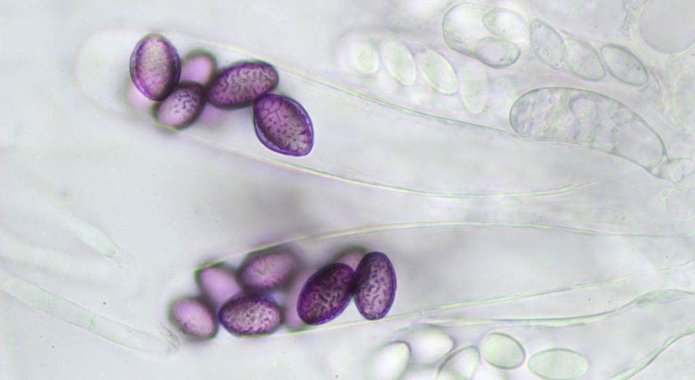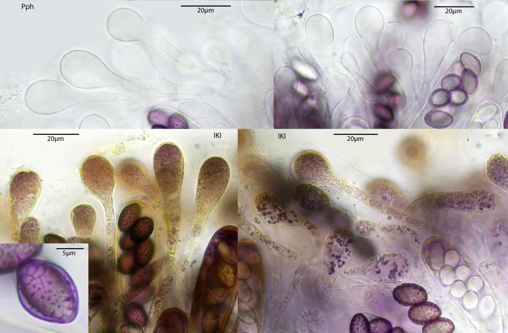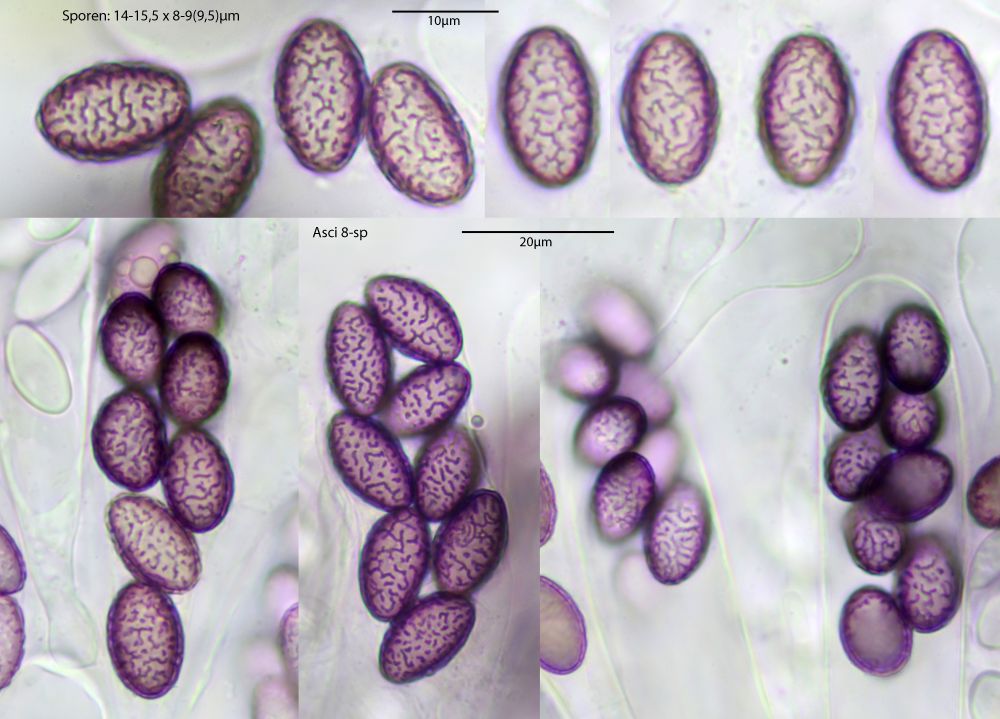 Hier nun die Bilder, sehr auffällig die knittrig ornamentierten Sporen mit Epispor und die apikal stark verdickten Paraphysen, die mit Lugol schön violett verfärben.