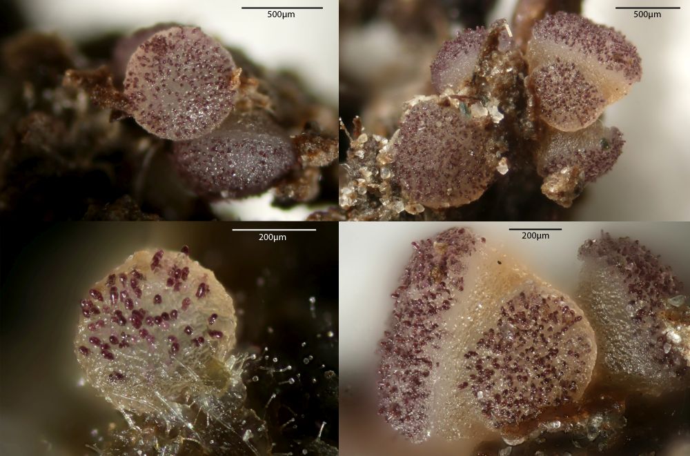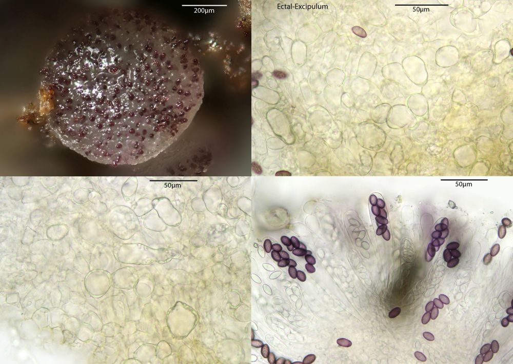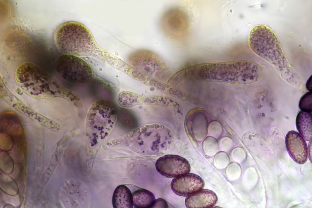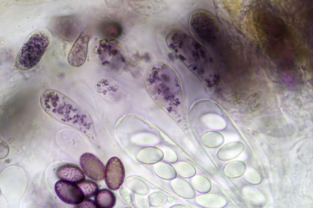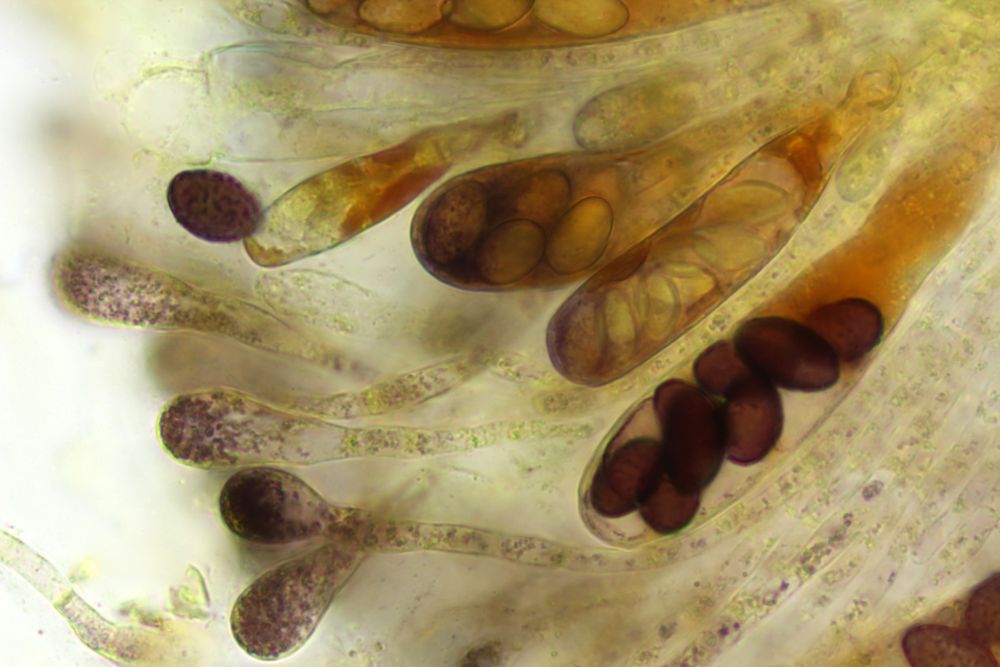 Hier nun die Bilder, sehr auffällig die knittrig ornamentierten Sporen mit Epispor und die apikal stark verdickten Paraphysen, die mit Lugol schön violett verfärben.