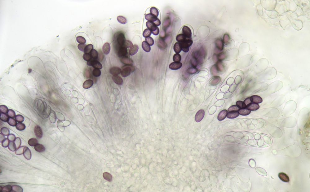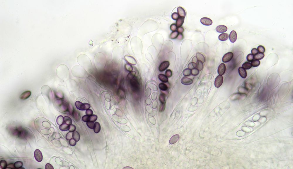 Hier nun die Bilder, sehr auffällig die knittrig ornamentierten Sporen mit Epispor und die apikal stark verdickten Paraphysen, die mit Lugol schön violett verfärben.