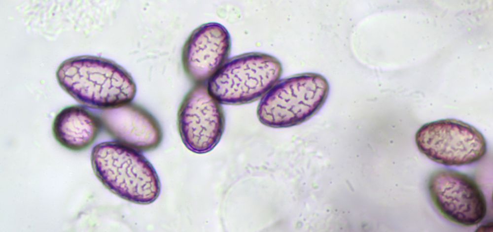 Nunn ist die Art ja kaum zu verwechseln, allerdings fiel zunächst Torsten auf und mir dann auch, dass die Sporenornamente in Van Brummelen irgendwie anders gezeichnet sind, so fast wolkenförmig-verklumpt. Nun hat die Art ja ein Epispor und das könnte vielleicht wenn es etwas verschrumpelt so aussehen, aber auf allen Fotos, die ich kenne sieht man das eher mit unregelmäßigen Linien wie hier auch. Weiß jemand vielleicht näheres dazu?