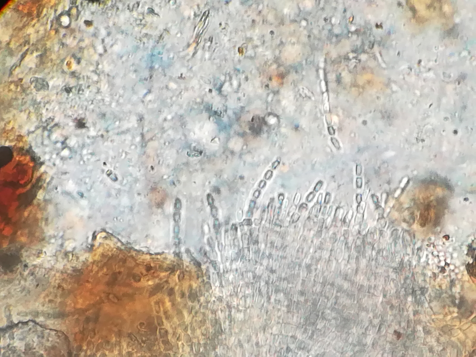• Solche Winzlinge sind ja immer recht schwierig zu bestimmen, da meist sehr merkmalsarm, aber vielleicht habe ich ja Glück und jemand hat eine zündende Idee? Die Sporen sind länglich, bestehen aus einer Art "Kammersystem" mit 8 "Kammern" und messen 35 - 37 x 1,5 - 2 um. Anbei noch ein paar Bilder: