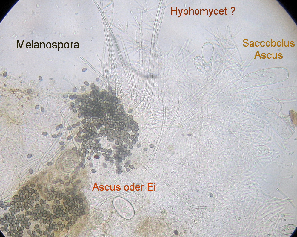 Saccobolus spec. zusammen mit einer (Melanospora)minima und einem unbekannten Hypho.