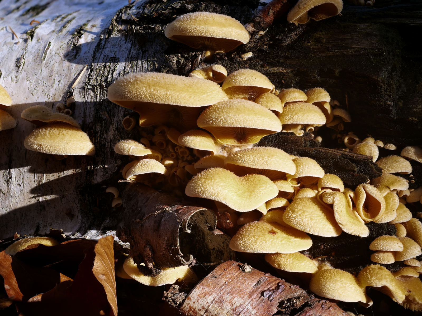 Hallo, ja die schöne Gruppe saß an einem stark verotteten liegenden Birkenstamm und hat sich dort bis Ende Dezember recht gut gehalten. Zwei Meter davon lag noch so ein Stamm und an diesem habe ich paar Wochen früher diese prächtigen Steifen Korallen gefunden.