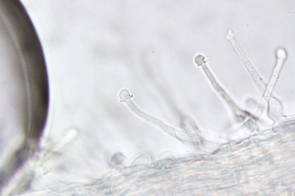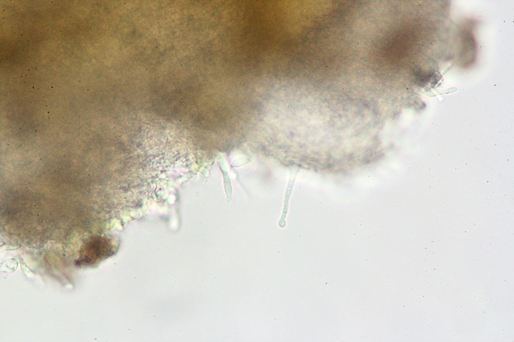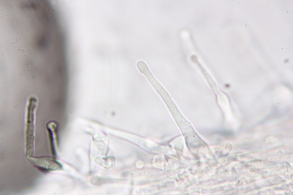 Dieser Basidiomycet hat am Stiel zahlreiche Kaulozystiden, am Hut Pileozystiden (sehen gleich aus wie die Kaulos) und durch Zufall konnte ich eine Ansammlung von Sporen entdecken.