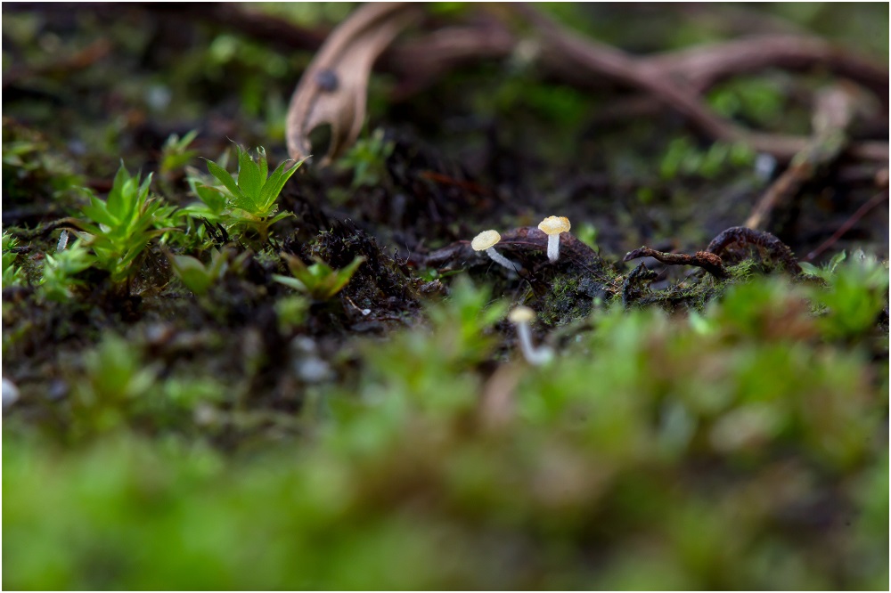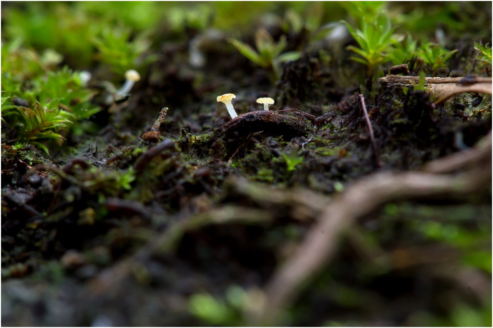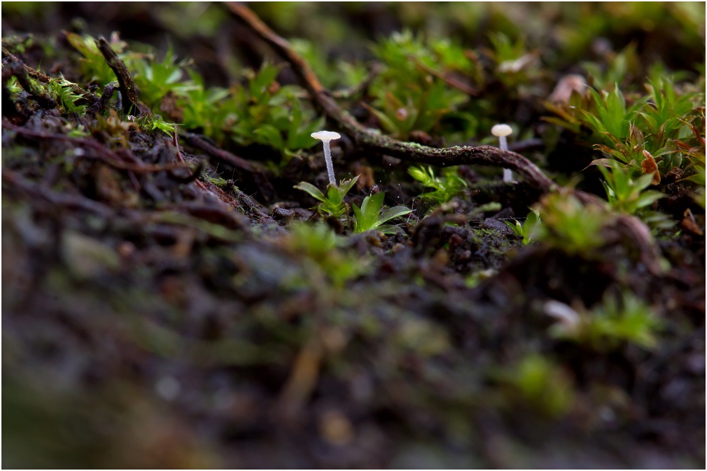 Unbekannter Basidiomycet (2mm groß) auf Wurzeln von Dicksonia antarctica (Gewächshaus-Fund) >>>>Hemimycena mauretanica var. microcephala