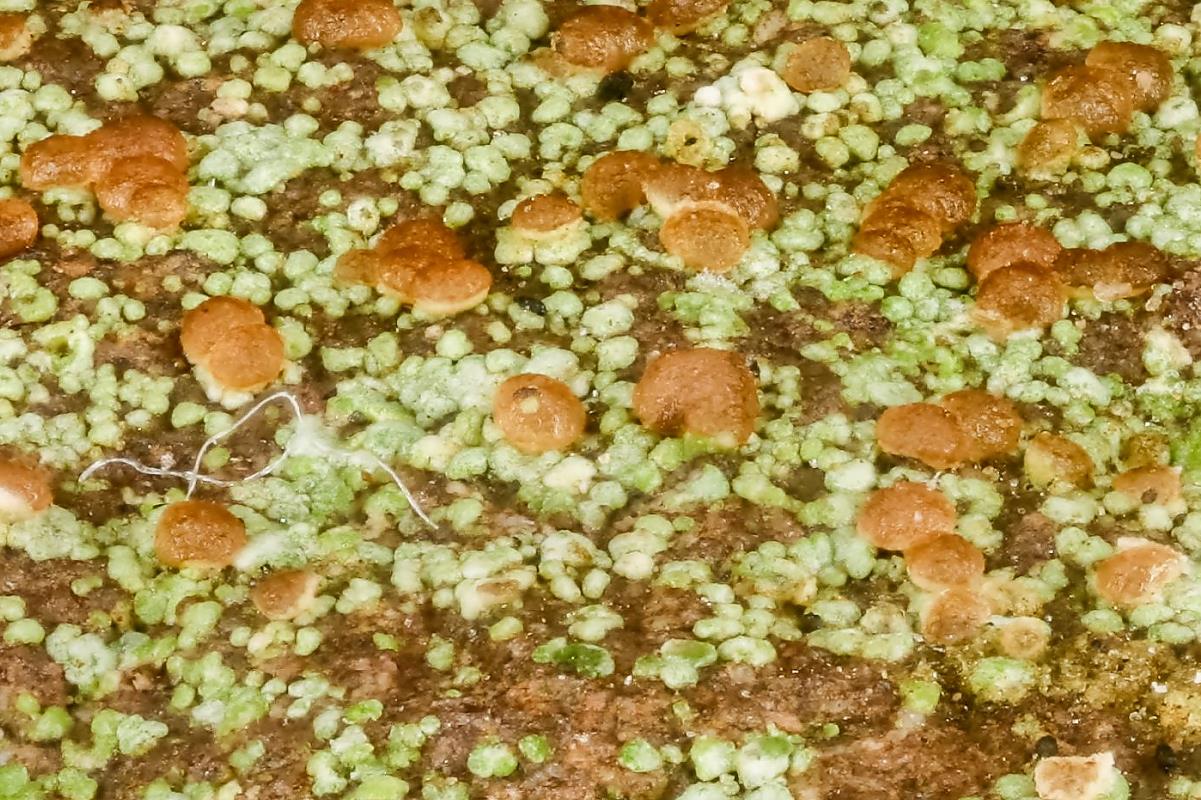 Ich bin neu im Forum und komme als Laie gleich mit einer Bestimmungsfrage, die wohl nicht die einzige bleiben wird. Und zwar geht es um eine Flechte, die ich auf einem Sandstein fand, der im Wald an einer Wegböschung lag, zeitweise aber auch etwas Somme bekommen dürfte. Ich dachte bei den roten Apothecien erst an Baeomyces rufus, aber die hat ja doch gestielte Apothecien und ein ganz anderes Lager. Habe ein Foto mit einem Ausschnitt von 1,8 cm gemacht, danach noch eines mit einem Ausschnitt von 5,5 mm und zwar schräg, um darzustellen, daß die Apothecien nicht gestielt sind. Läßt sich mit den Fotos die Art bestimmen?