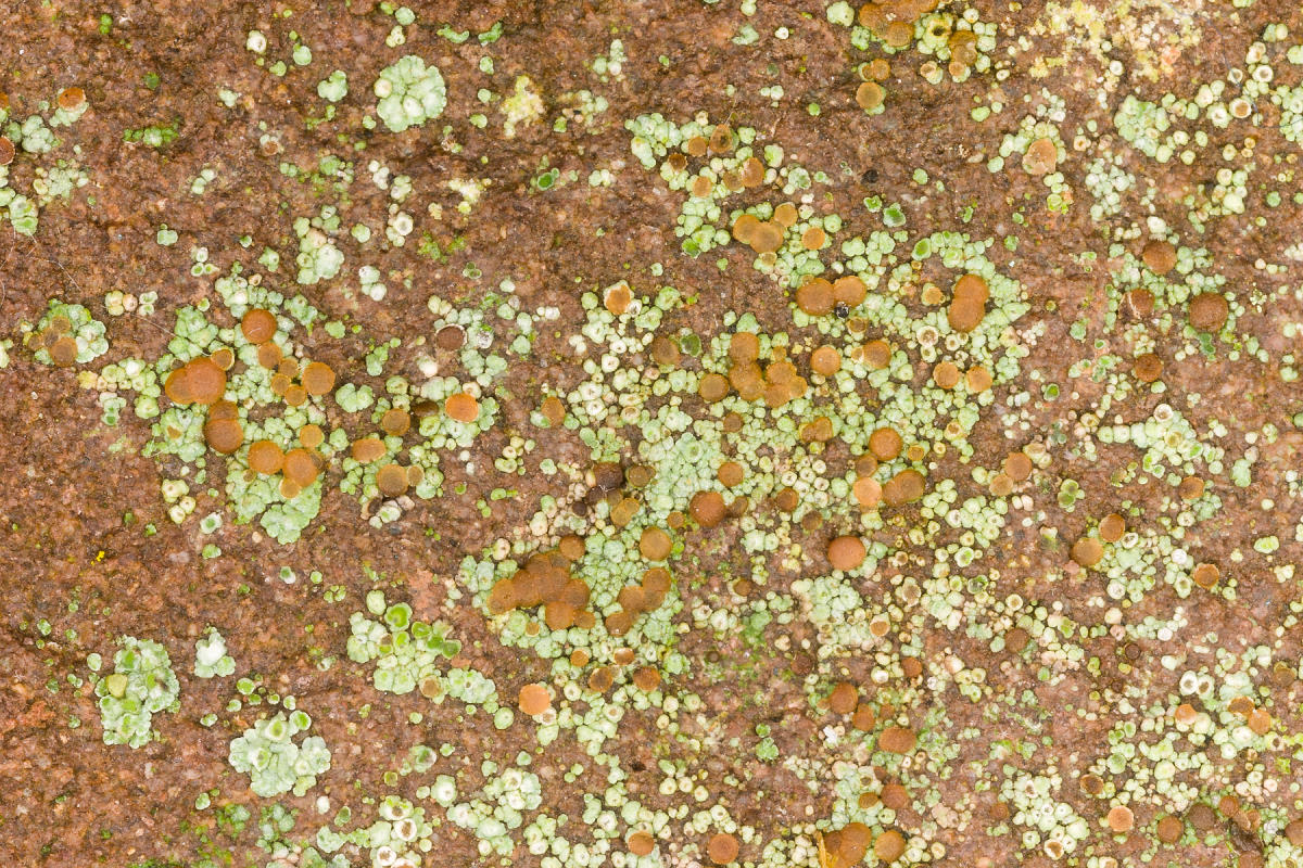• Vielen Dank für die Bestimmung! Die Flechte fiel mir durch die - mit bloßem Auge - grünen Flecken auf. Wegen meiner Rot-/Grün-Schwäche sah ich die Apothecien erst, als ich mir zu Hause zum Fotografieren den Stein genauer ansah. Es handelt sich um den rötlich-grauen Wesersandstein. Daher die Farbe. Die Fotos dürften durch Verwendung des Ringblitzes und ein dafür ermitteltes Profil eigentlich keinen Farbstich haben.