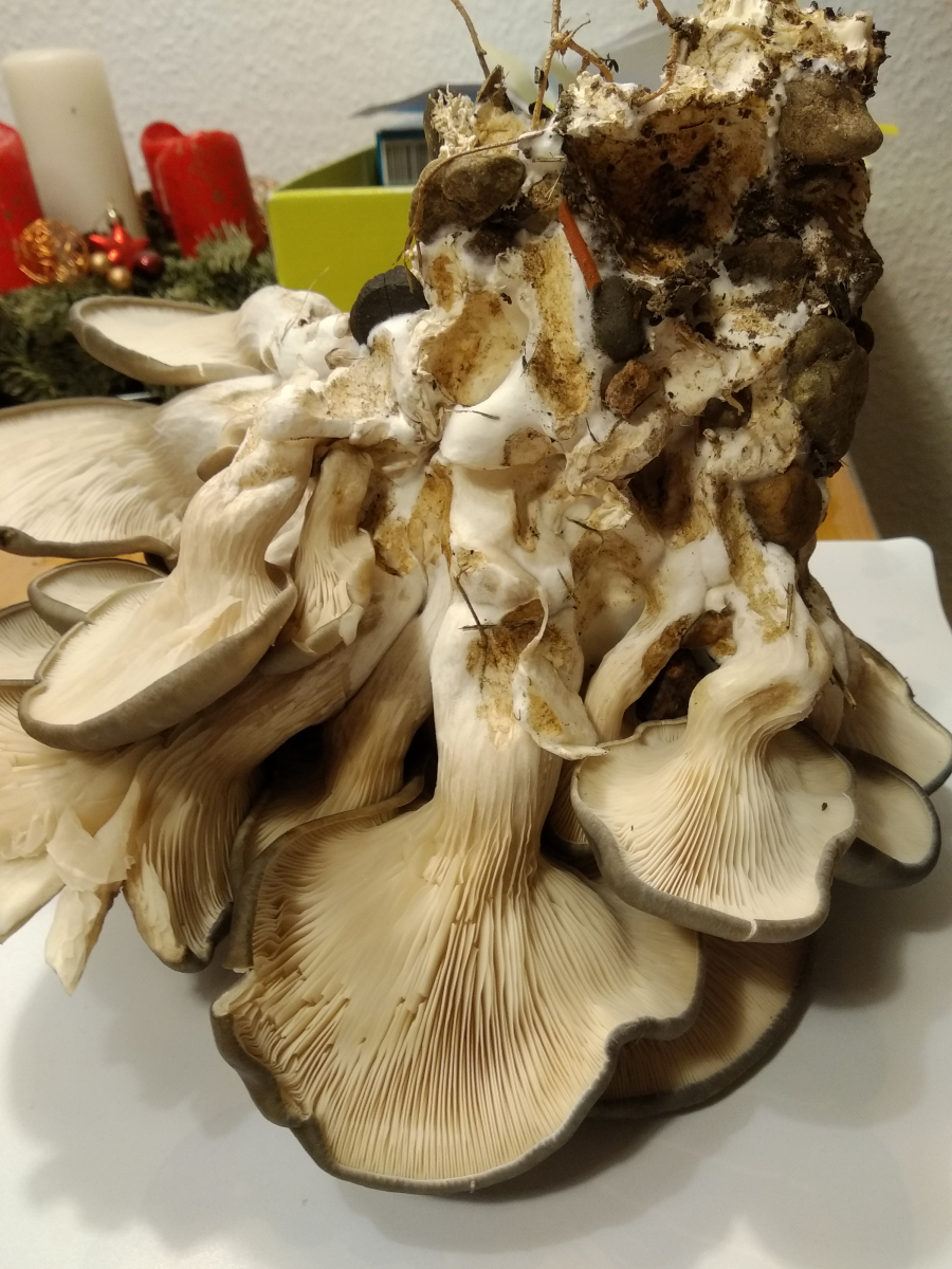 • So, heute war die zweite Ernte dran :gfreuen: . Meine Frau hat übrigens die Theorie, dass ich die im Grunde selber "gepflanzt" habe. Alle FK wachsen nämlich genau unter der Abtropfkante der Balkone. Auf unserem hatte ich vor ein paar Monaten Austernseitlinge liegen, die ich nicht mehr verarbeiten wollte. Hätten die ausgesport, hätte der Regen die Sporen genau dorthin gewaschen, wo jetzt die Leckerbissen stehen. Wer weiß... :grolleyes: