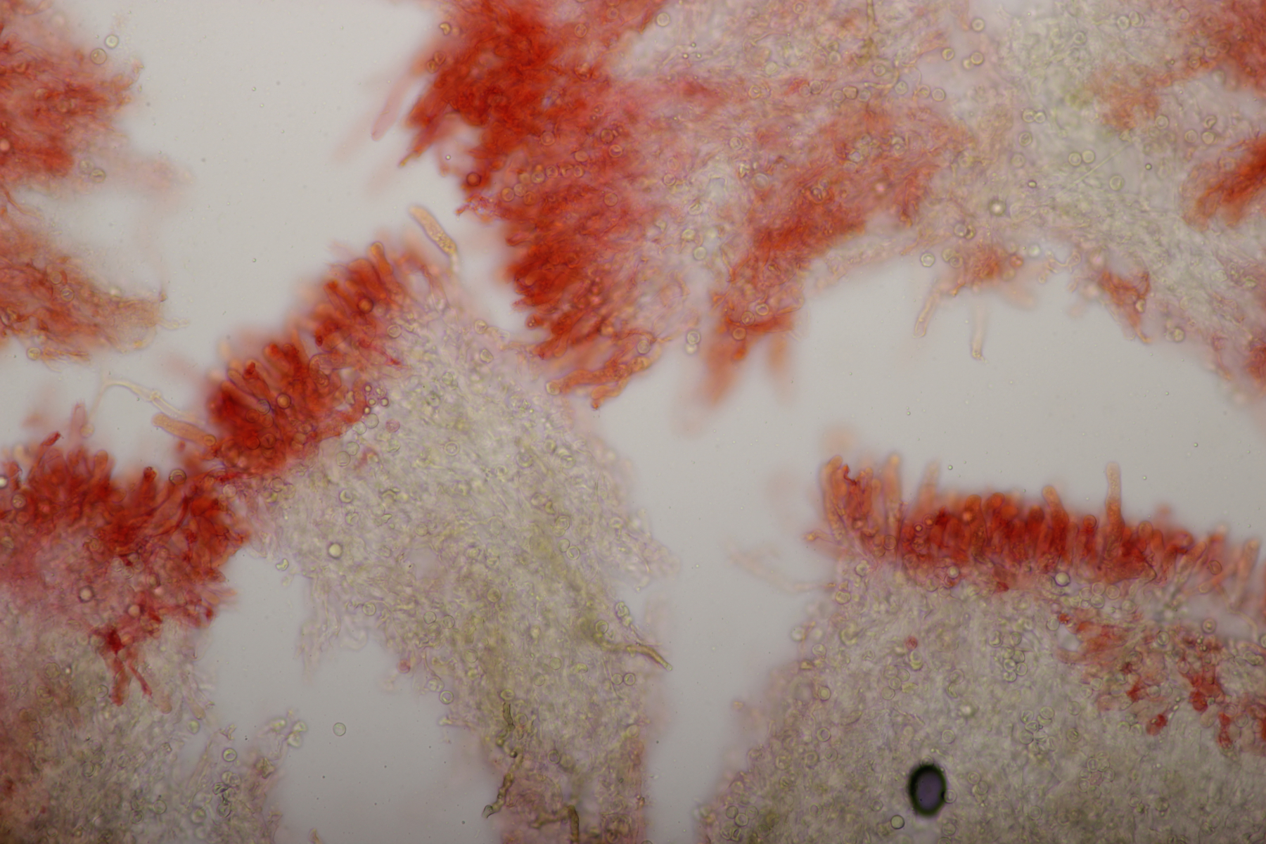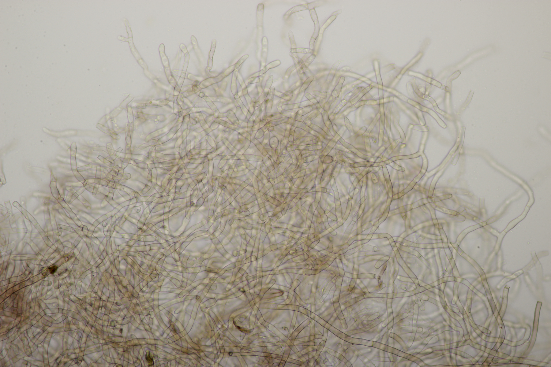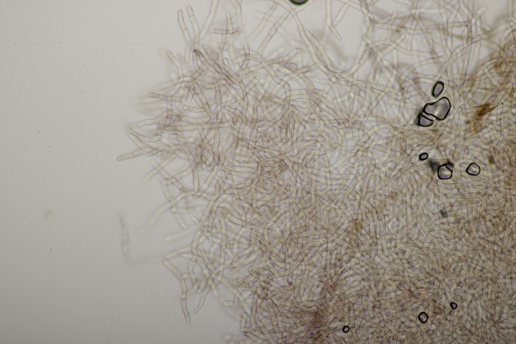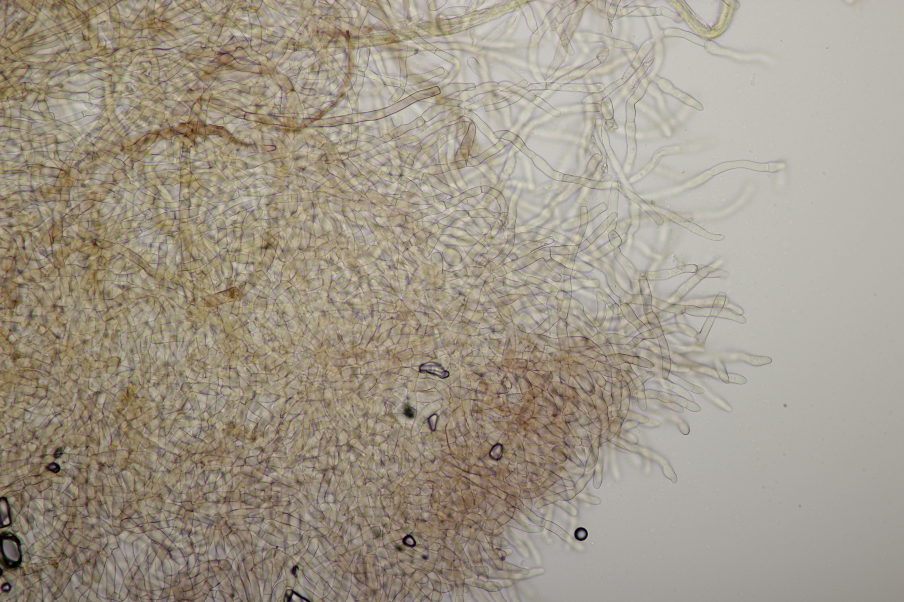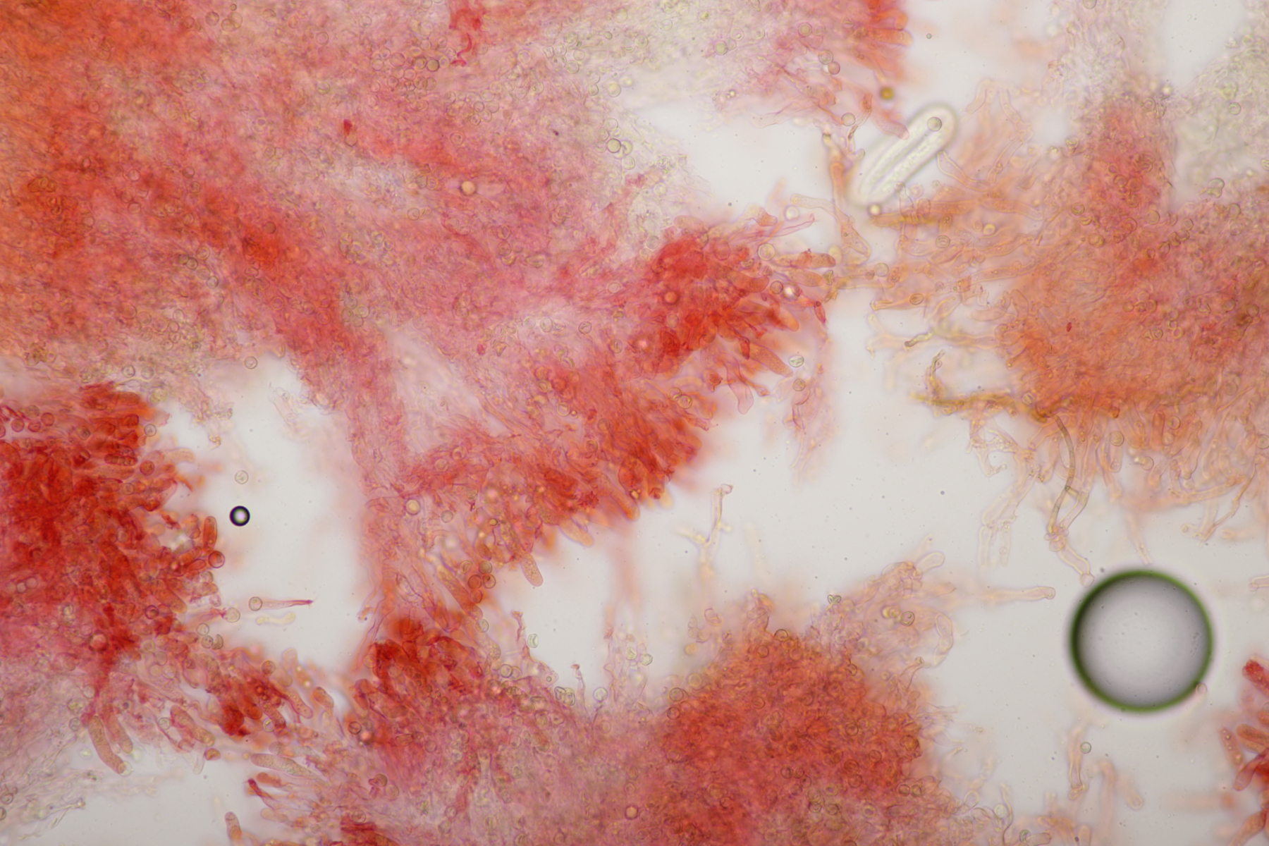 7. Vuilleminia auf Salix. Sporen (22.1+-1.7) µm x (6.1+-0.4) µm, Q=3.7+-0.3. Ich meine auch Zystiden zu sehen, die ich am ehesten als zylindrisch beschreiben würde. Mit der Sporengröße käme ich dann bei V. coryli aus, die wohl auch an Salix geht.