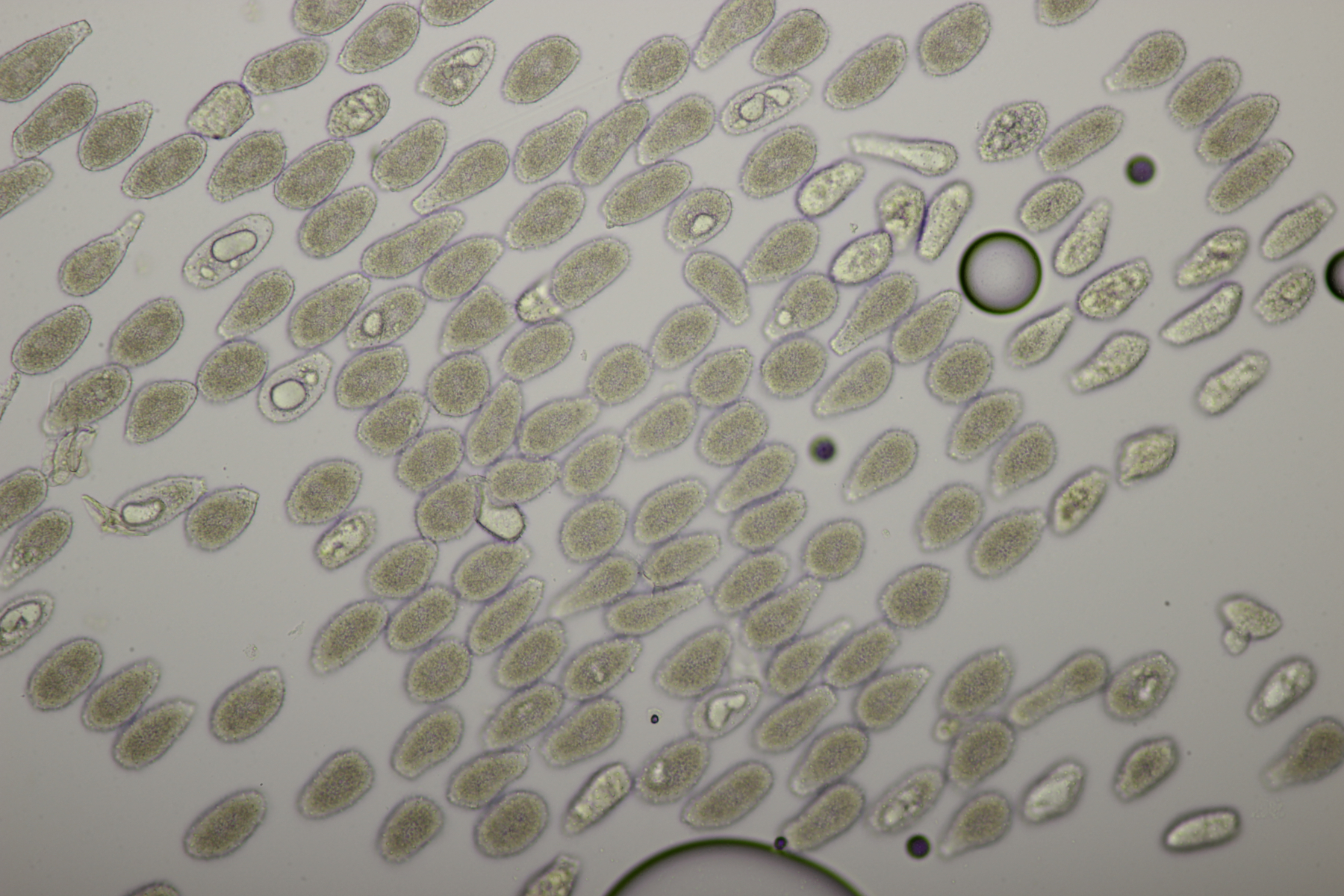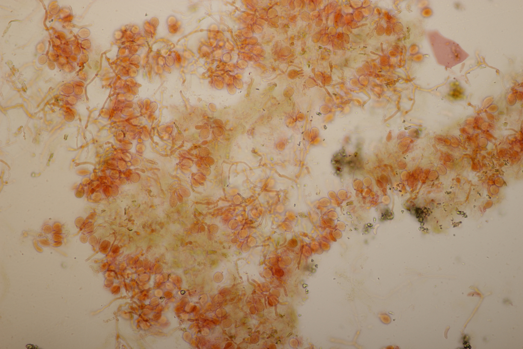 3. Im Wald dann ein gezielter Griff an den Farn und ein Wedel voller Rost: Milesina kriegeriana ex Dryopteris dilatata. Sporen zwischen 35 und 40 µm.