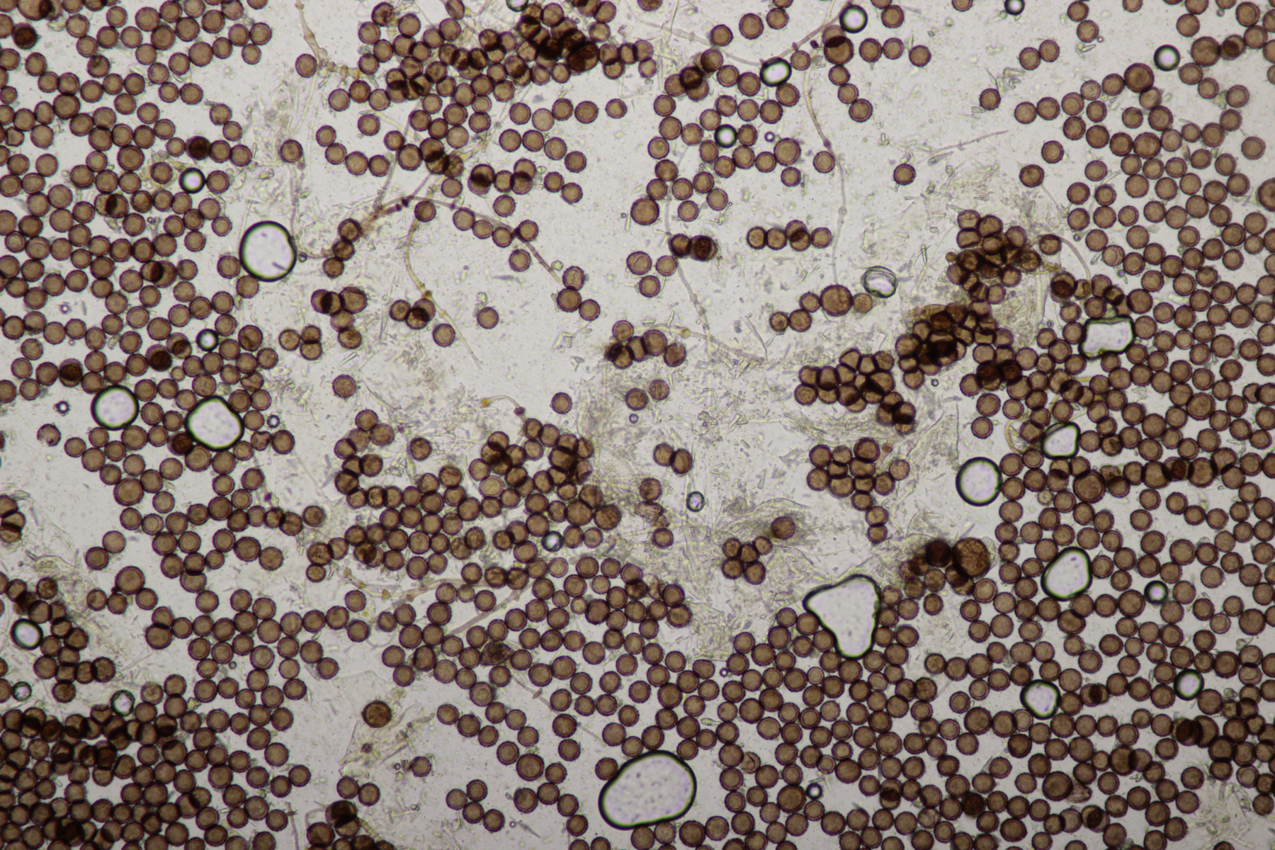Nummer 4 war für mich durch die Kombination aus vollends unverklumpten feinwarzigen Sporen mit leicht ovaler Form sowie Sporengröße (12,4-13,3 x 10,8-11,5 µm) und Capillitium-Form Badhamia panicea. Eine rotbraune Stielbasis, die die Art ja z. T. hat, konnte ich leider keine erkennen.