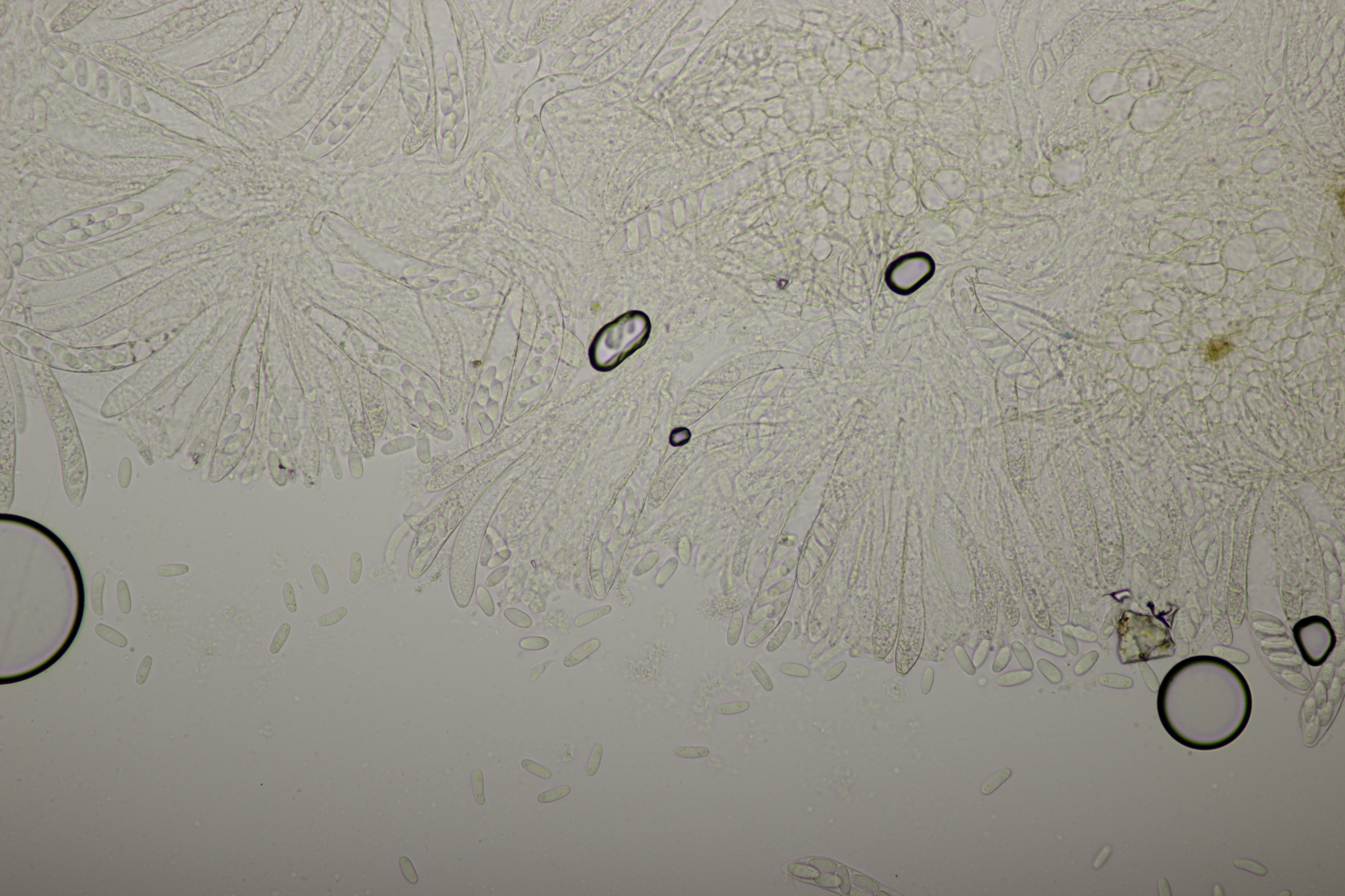 Ich habe in der Zwischenzeit noch mal die beiden Ascomyceten genauer unter die Lupe genommen. Zunächst einmal die Nr. 7 vom Riesenbärenklau. Ingo W hatte bei FB nachgefragt, ob die Fruchtkörper Stiele haben. Das fällt mir etwas schwer zu sagen. Jung sind scheinbar extrem kurze Stiele vorhanden, die dann aber im Alter unter dem Fruchtkörper komplett verschwinden. Ich habe auch insgesamt 2 Sporen finden können, die zweifach septiert sind. Es sieht so aus, als wäre die Spore erst in der Mitte septiert und dann noch mal eine der beiden Hälften in deren Mitte septiert. Die Asci hatten Haken. Ich habe auch noch Material im Kühlschrank.