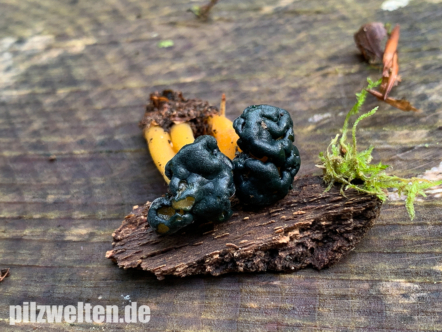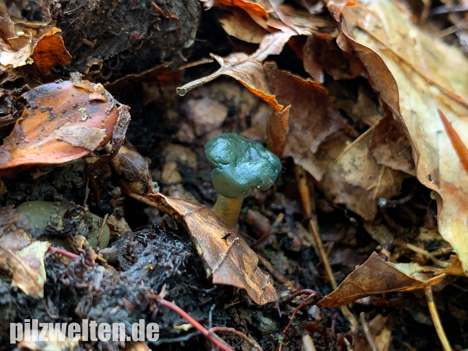 3. Mitten in der Hauptsaison, an einem steilen Abhang im Buchenwald - Schwarzgrünes Gallertkäppchen, Leotia viscosa