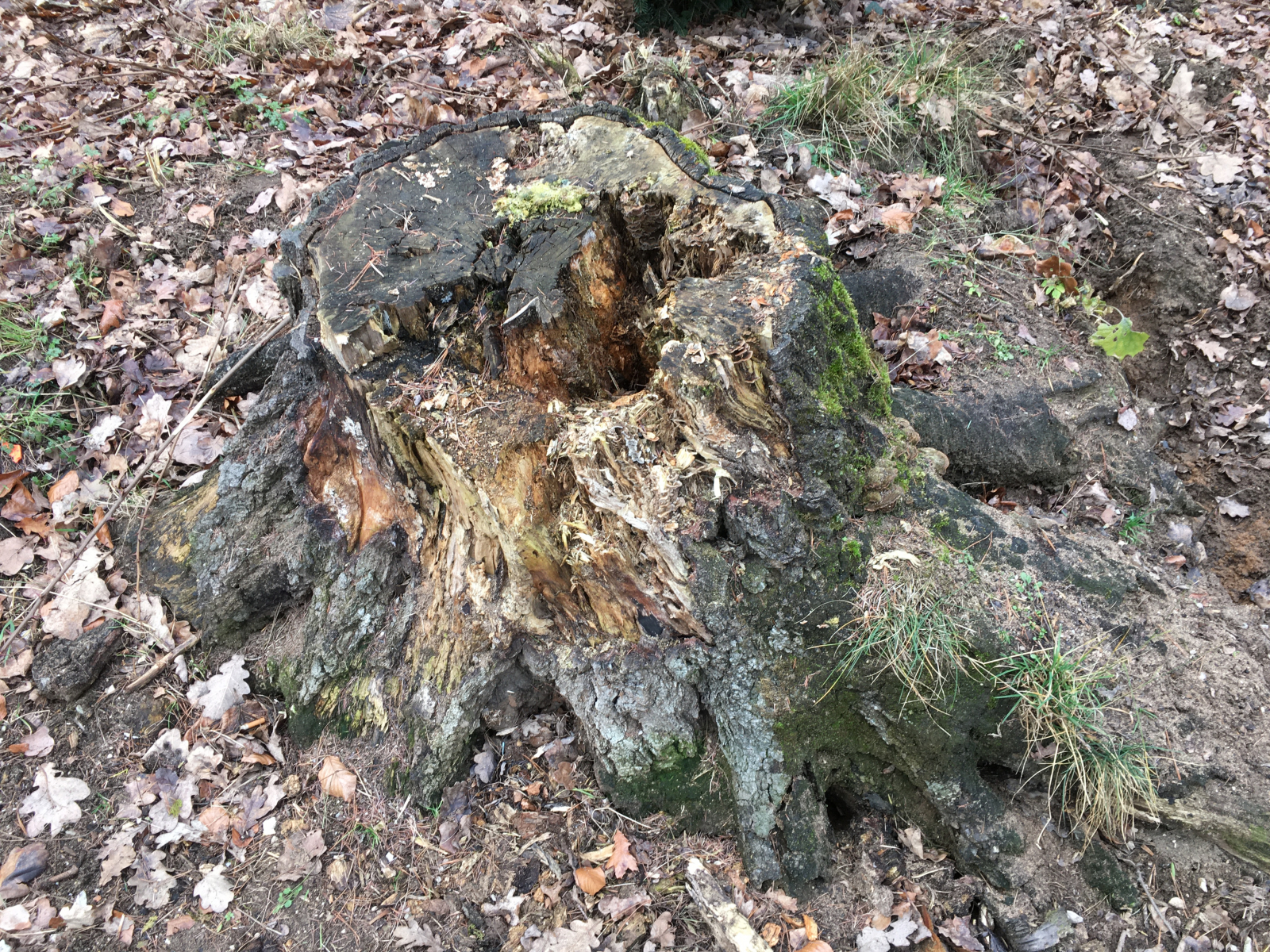 meine erste Frage bezieht sich auf den folgenden morschen Baumstumpf: ich halte ihn am ehesten für den sterblichen Rest einer Eiche.