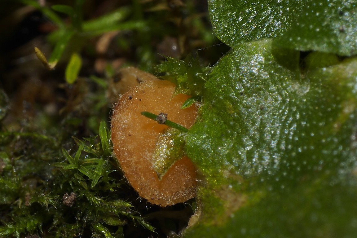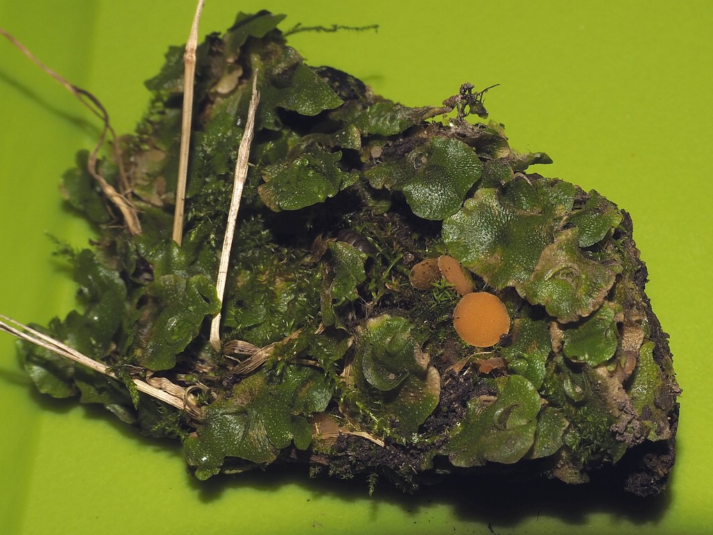 Dein Moos ist eine Lunularia cruciata, weshalb die O. ithacaensis wegfällt, aber es gibt einen Fund von mir von einer ähnlich aussehenden Octospora ithacaensis, die auf Lunularia cruciata wächst (Siehe hier).
