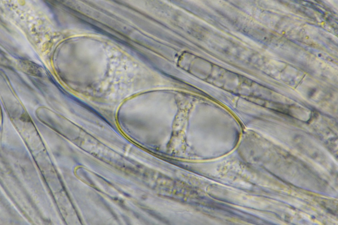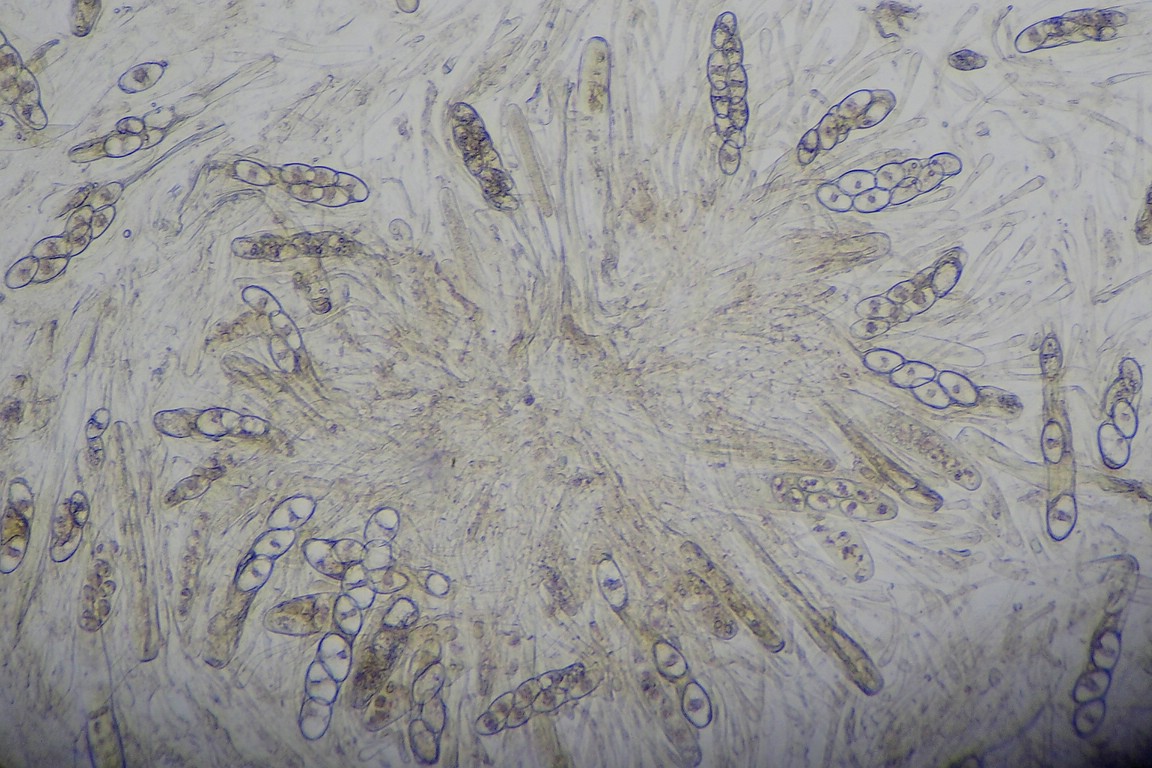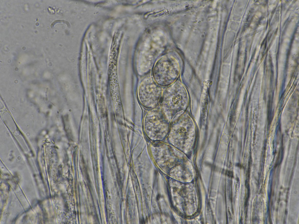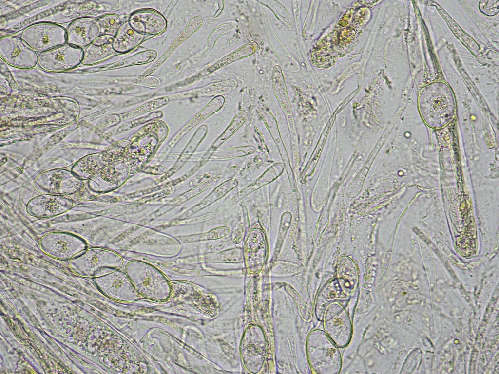 Wenigstens makroskopisch passt das alles schon ganz prima, finde ich. Bei meinen ersten mikroskopischen Gehversuchen wurde aber leider schnell klar, daß die Sporen noch nicht reif sind. Es waren auch so gut wie keine frei schwimmenden Sporen auffindbar.