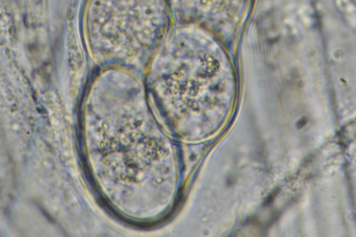 Einige wenige Sporen wirkten auch, als hätten sich schon die zu erwartenden 2 Öltröpfchen gebildet: