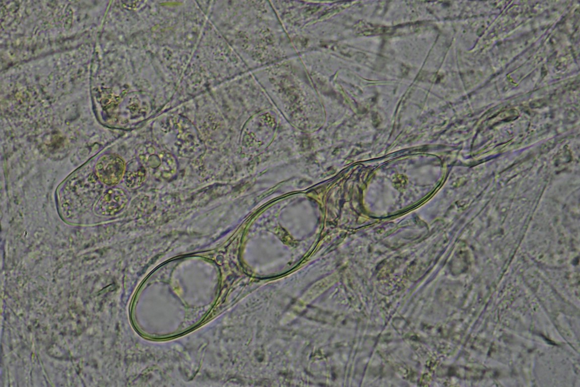 Hier zwei erste Übersichtsaufnahmen. Wenn ich es richtig sehe fällt auf, daß, wie es auch bei O. ithacaensis zu erwarten wäre, die Sporen manchmal uni- und manchmal biseriat angeordnet sind.