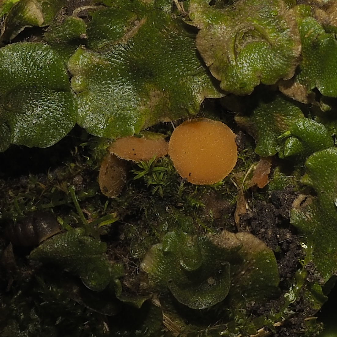 Dieser Pilz ist auf Lunulara cruciata (Mondbechermoos) und auf Marchantia polymorpha (Brunnenlebermoos) zu finden, wächst gerne auch neben dem Moos und kann auch in weiß erscheinen.