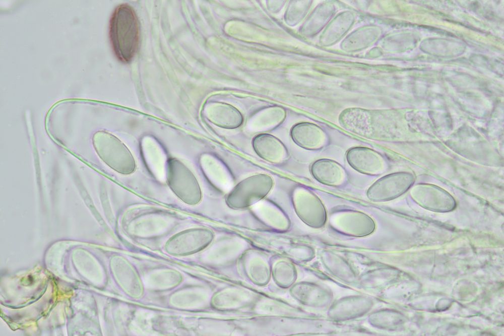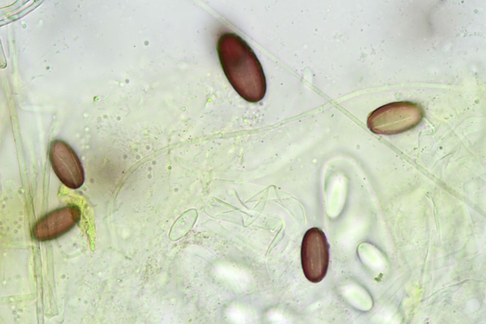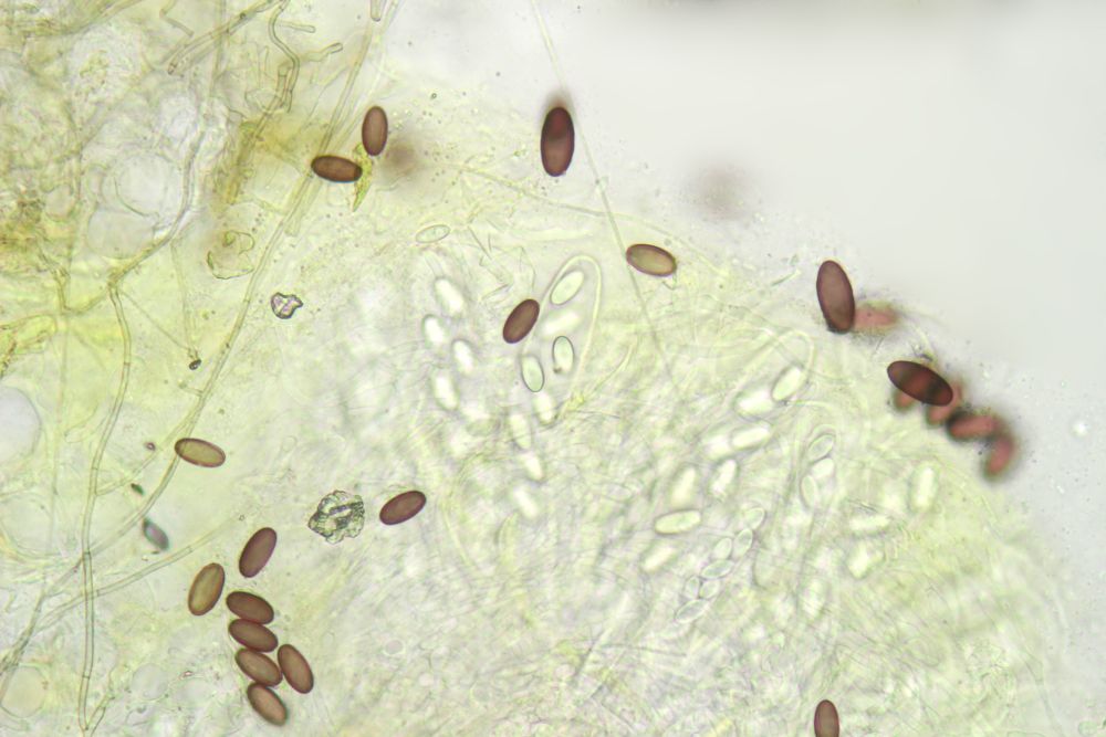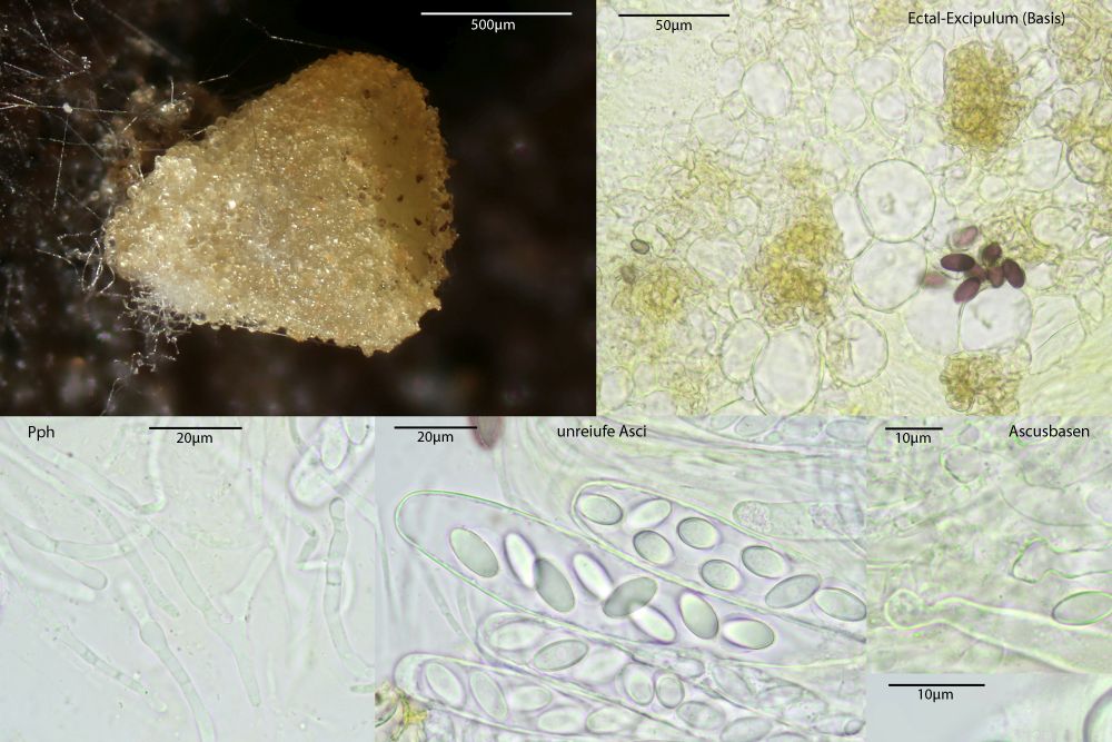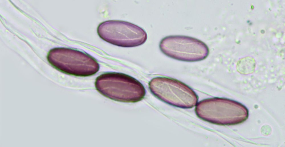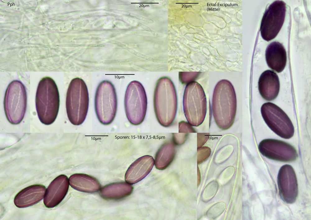 In jedem Fall ist das was, das ich noch nicht vorher gesehen habe. Passt eigentlich alles auf Ascobolus michaudii, nur die Sporen sind zu klein, v.a. zu schmal. Ob das nun am Reifegrad liegt, kann ich nicht sagen, aber auch dunkelviolette Sporen werden nicht größer. 17- 22 x 9,5- 12 nennt Van Brummelen, der hier hat 15-18 x 7,5-8,5µm. Möglich aber, dass das noch im Rahmen liegt, das kann ich mangels Vergleichsfunden aber nur schwer beurteilen. Daher im Moment Ascobolus cf michaudii. Eine wirkliche Alternative wüsste ich aber auch nicht und die Ornamente scheinen schon recht charakteristisch. Doch wer weiß, was da in Afrika noch alles existiert.