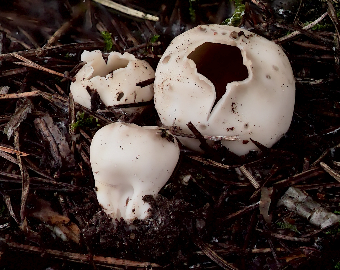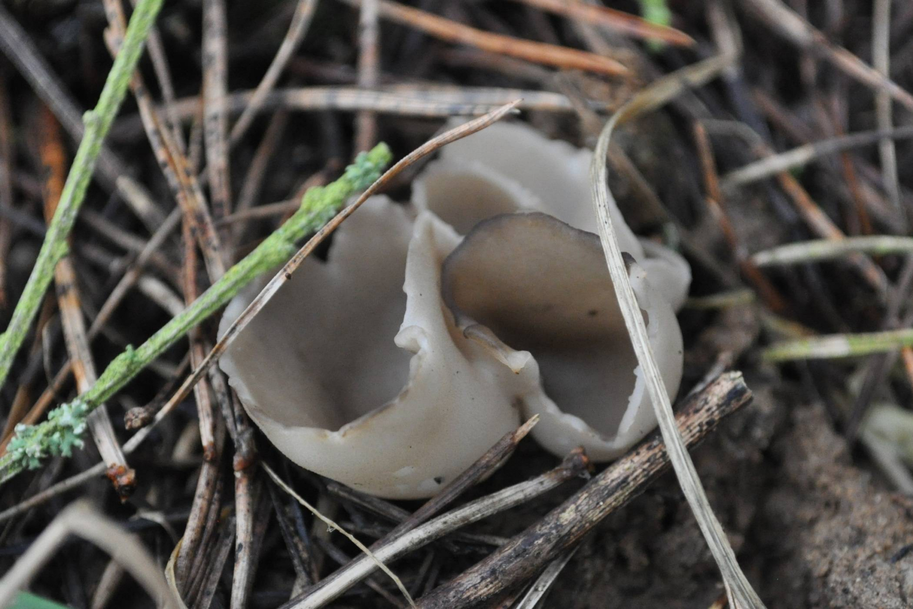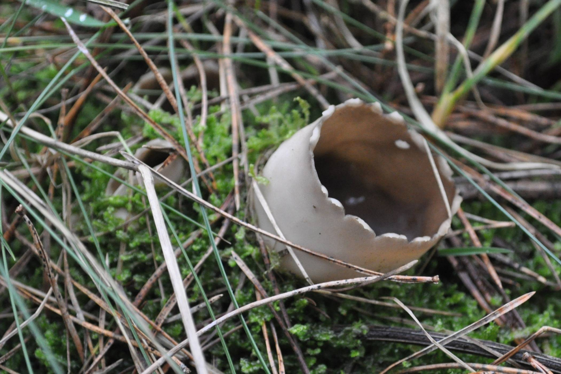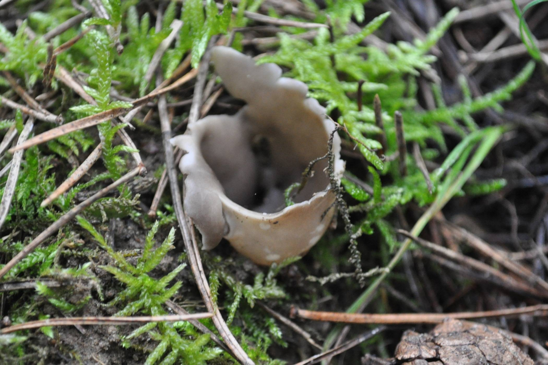 Wie wär's mit Sarcosphaera coronaria (Kronenbecherling)? Bei Reife klappt der ja schon so auf, und die Violettöne sind dann acuh bisweilen nicht mehr ausgeprägt.Eine Geopora verhält sich meistens ja etwas anders, weil die Fruchtkörper sich mehr im Erdboden entwickeln, also auch beim völligen Aufklappen das Zentrum des Bechers unter dem Niveau der Bodenoberfläche liegen müsste.