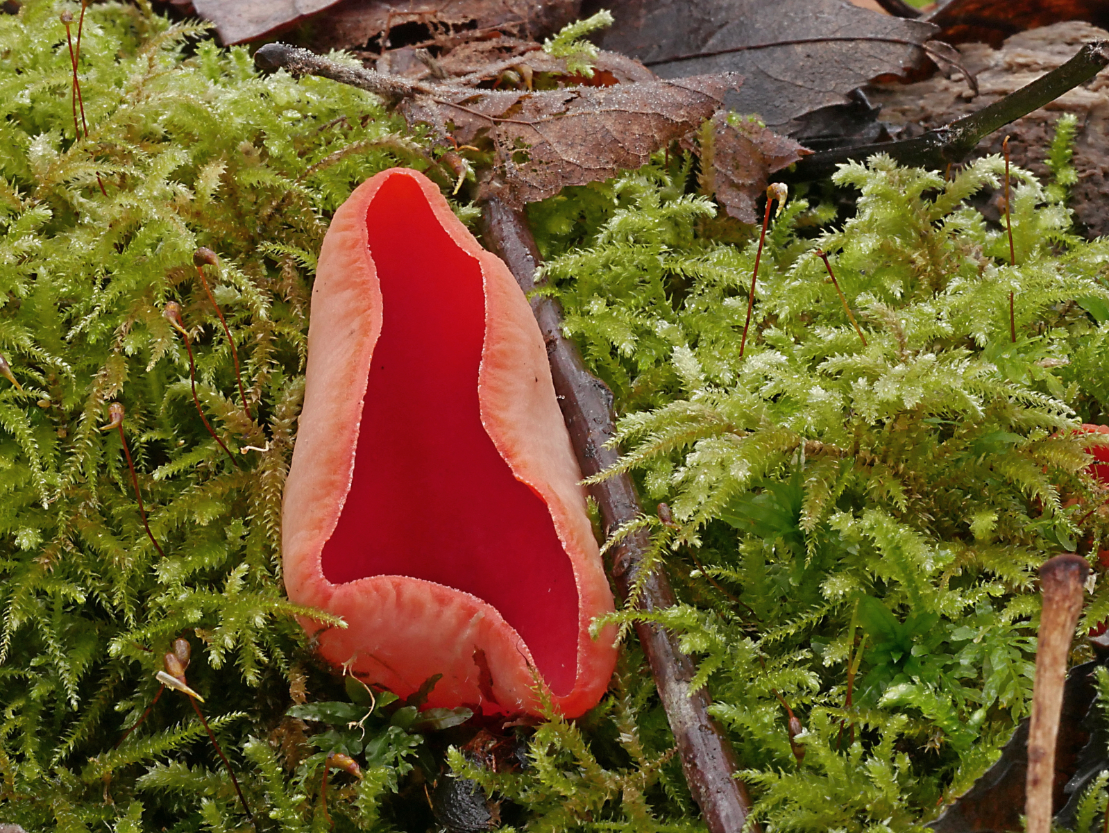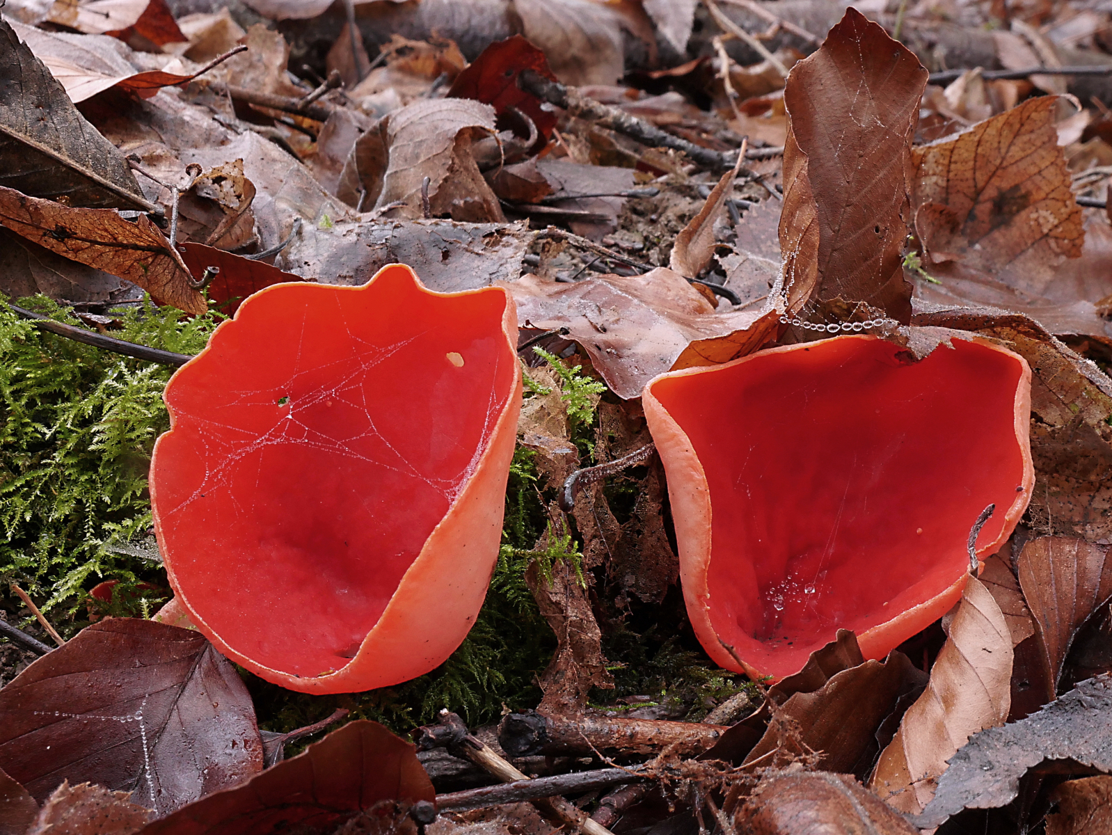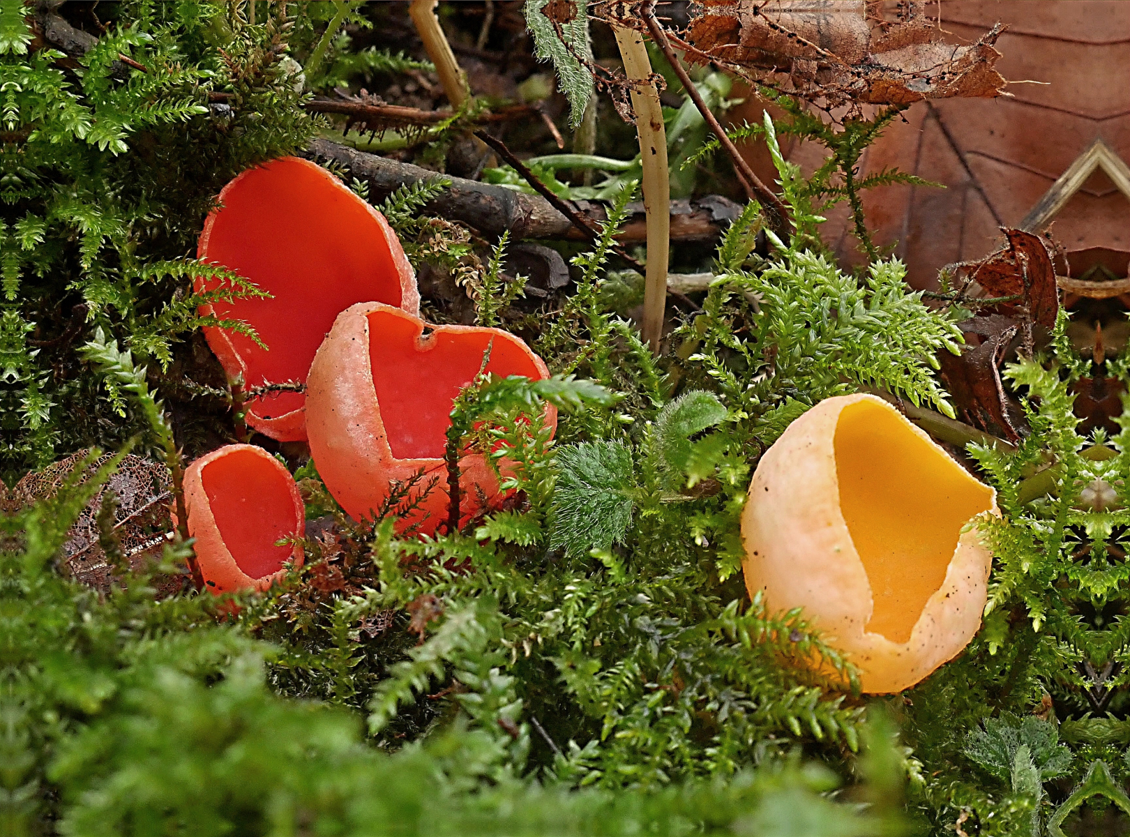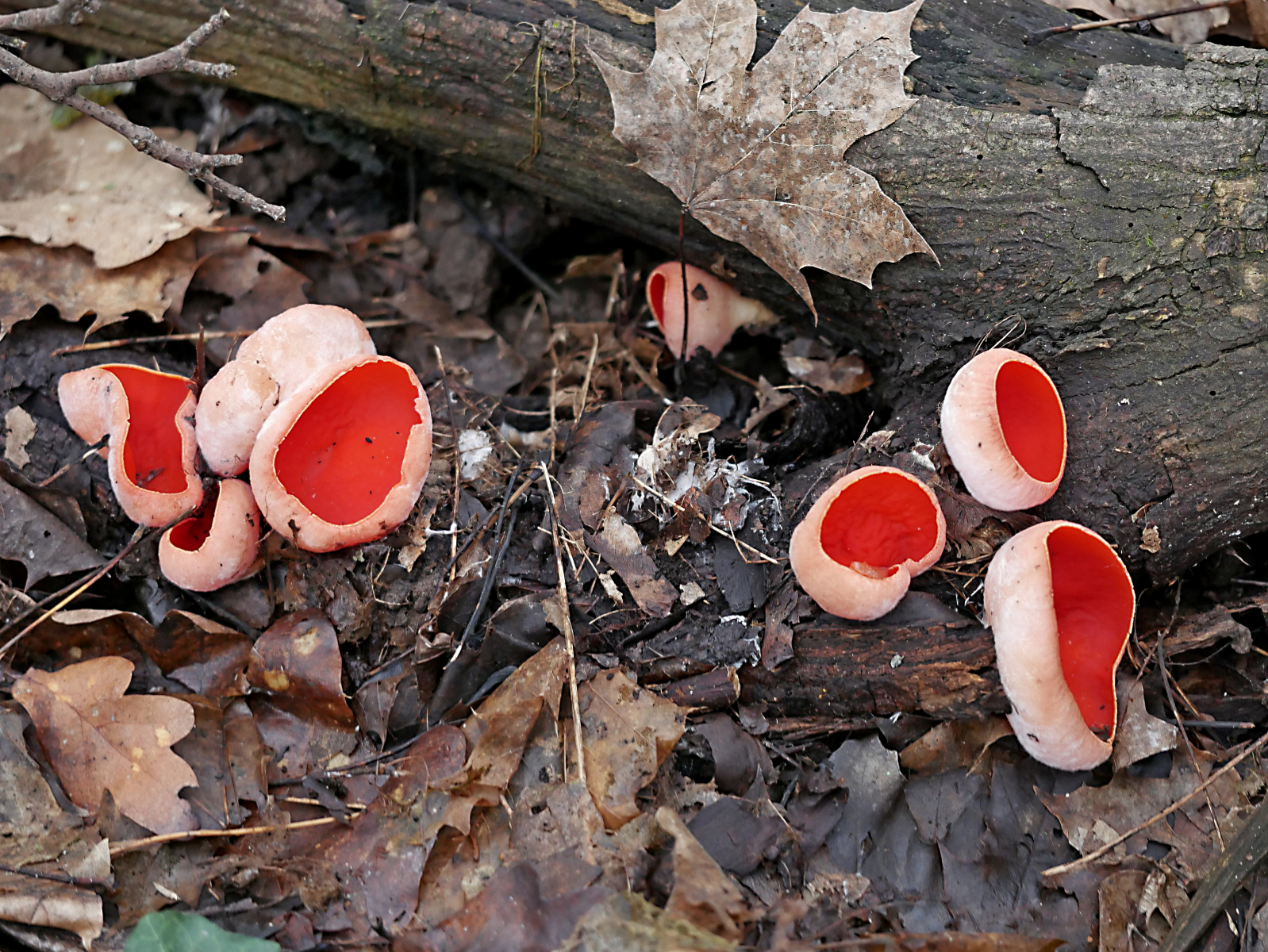 Zusammen mit Melanie Schoppe und Rainer Wald ging es zu Günter in Richtung Mosel zu einem Fundort von Sarcoscypha jurana. Vor Ort wurden alle Erwartungen übertroffen. Sarcoscypha wohin man auch blickte. Eine schöner als die andere. Und dazu auch noch die Farbvarianten von rot über orange, gelb bis zu reinweiß.