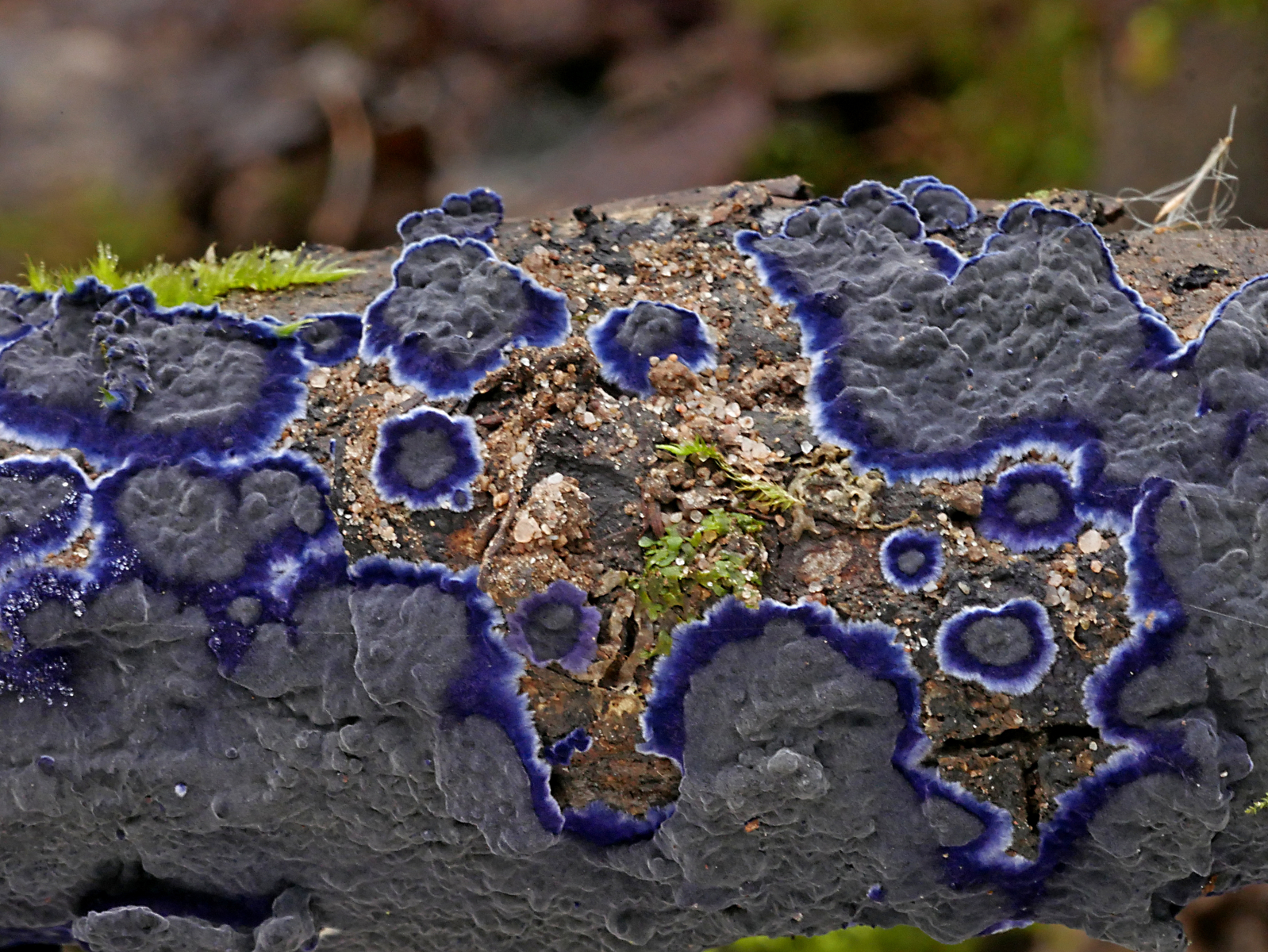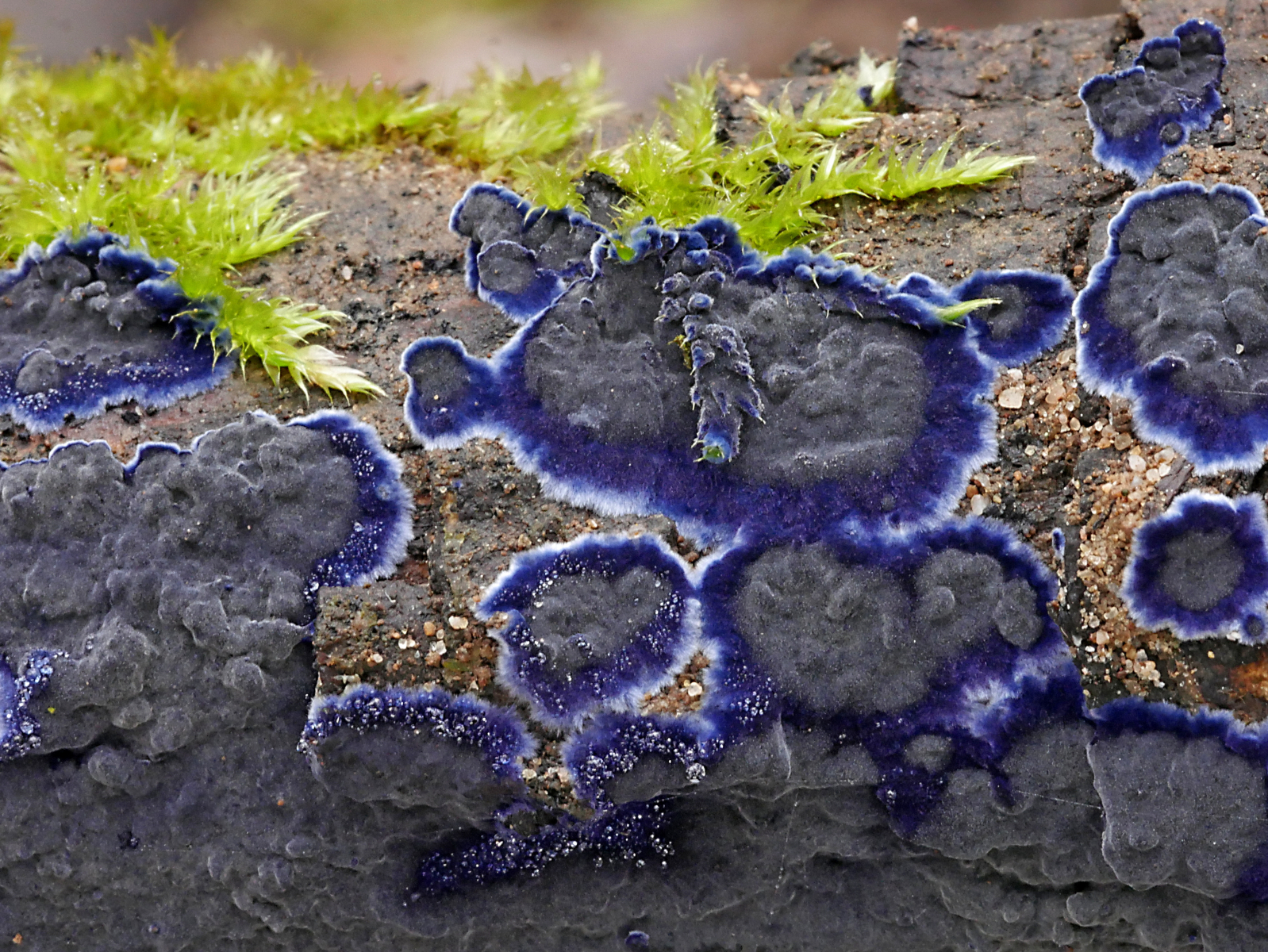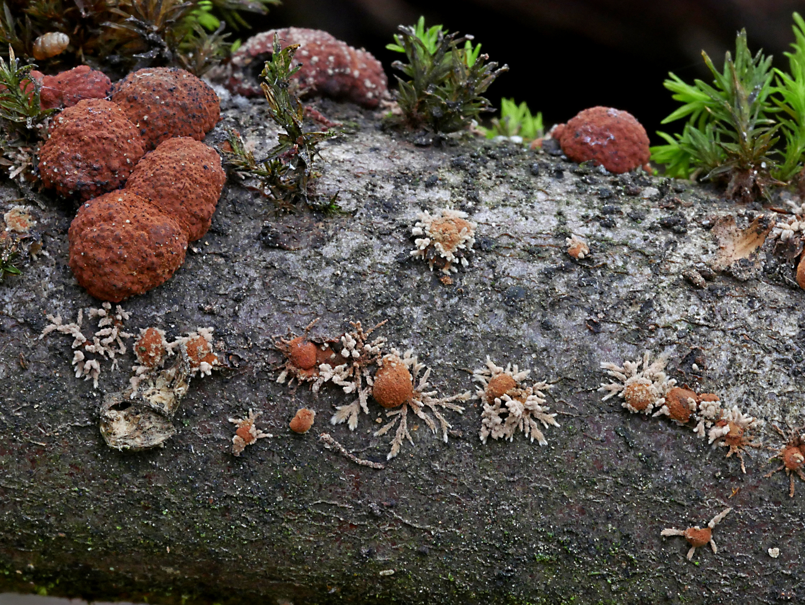 Nach gefühlten 1000 Fotos und einmal in der Gegend fuhren wir noch andere Fundpunkte an. Dort gab es weiße Judasohren, den blauen Rindenpilz, die Zimtbraune Kohlenbeere samt "Pilzspinnen", der Nebenfruchtform der Kohlenbeere, Plectania melastoma und zuletzt auch noch sehr schöne Exemplare von Sarcoscypha austriaca.
