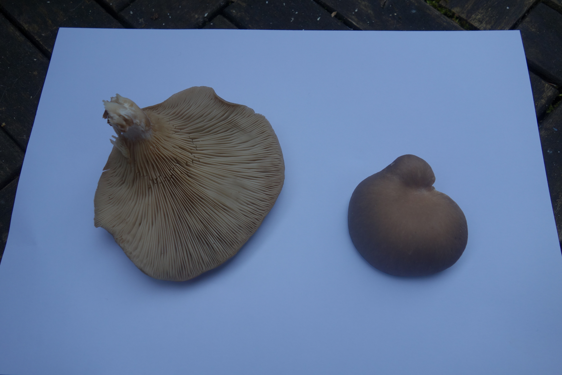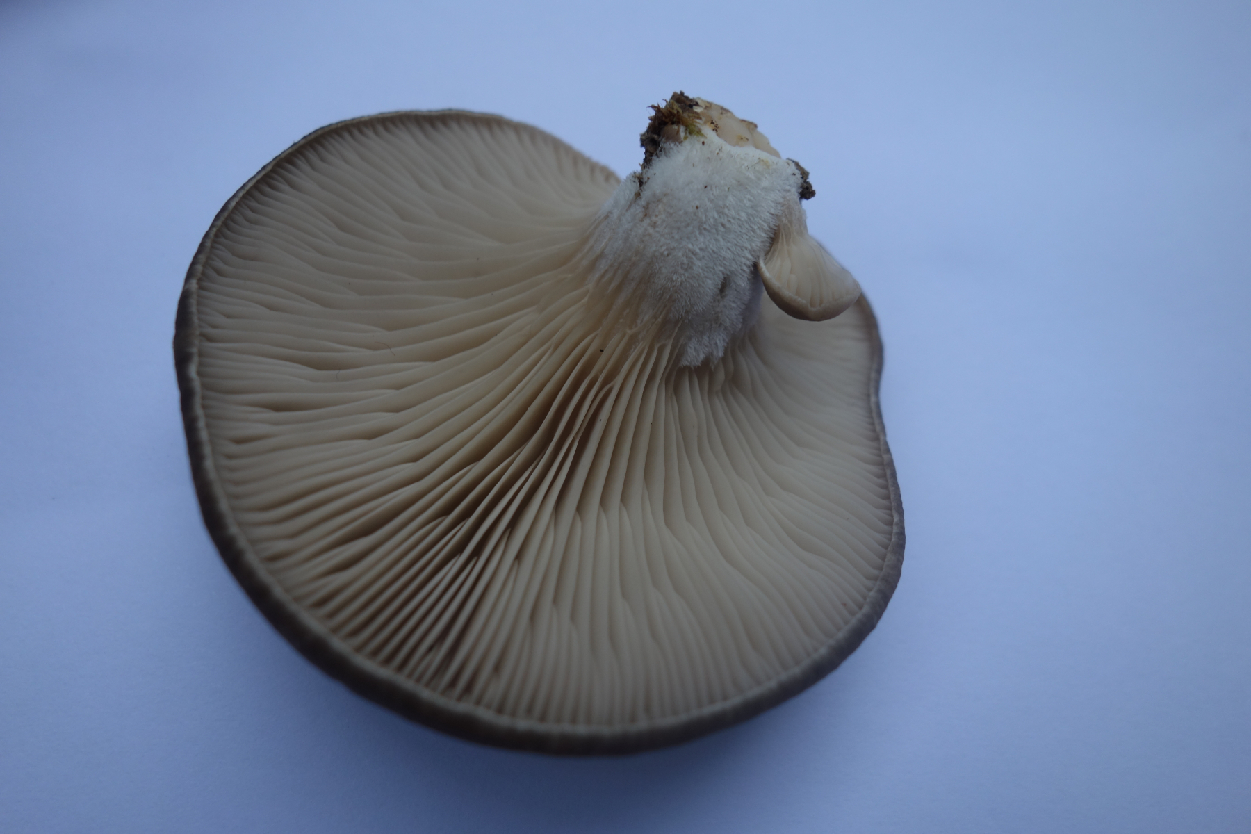 Der Pilz ist von oben braungrau, die Lamellen sind weißlich-cremefarben (mit vielen Zwischenlamellen, am Stiel herablaufend). Stiel weiß, feinfilzig.