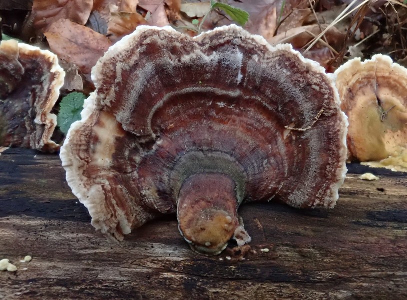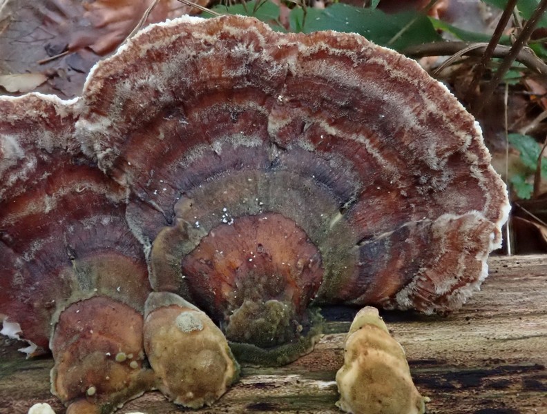• Bei diesem Pilz auf liegendem Laubholz (Buche oder Eiche) dachte ich gleich an Trametes versicolor: 7 cm breit, dünn, Rand relativ scharf, elastisch und irgendwann brüchig.