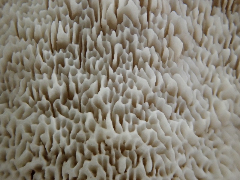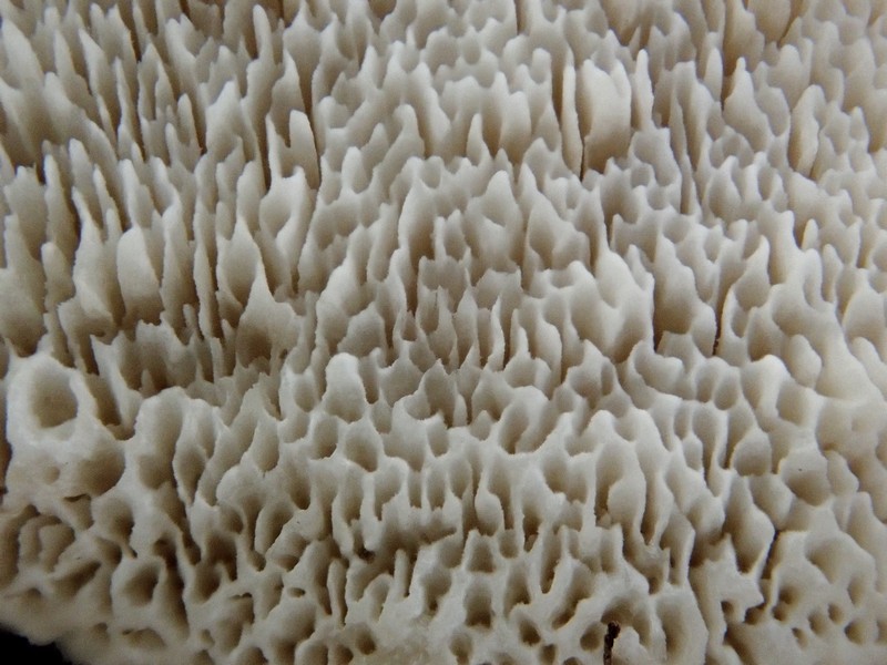 • Die Poren rundporiger Porlinge können übrigens gerne mal aufgeschlitzt und ungleichmäßig sein, wenn die Fruchtkörper a) recht jung sind oder sie b) nicht ganz horizontal wachsen. Auch Schmetterlings-Trameten können das.