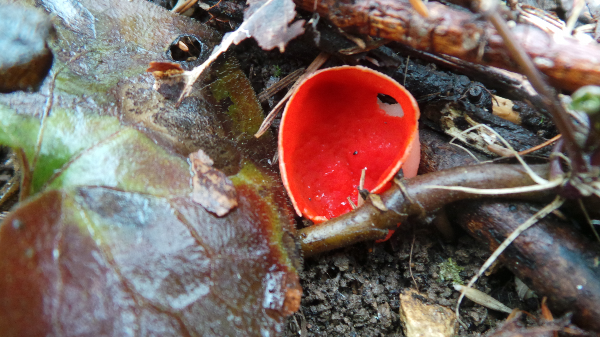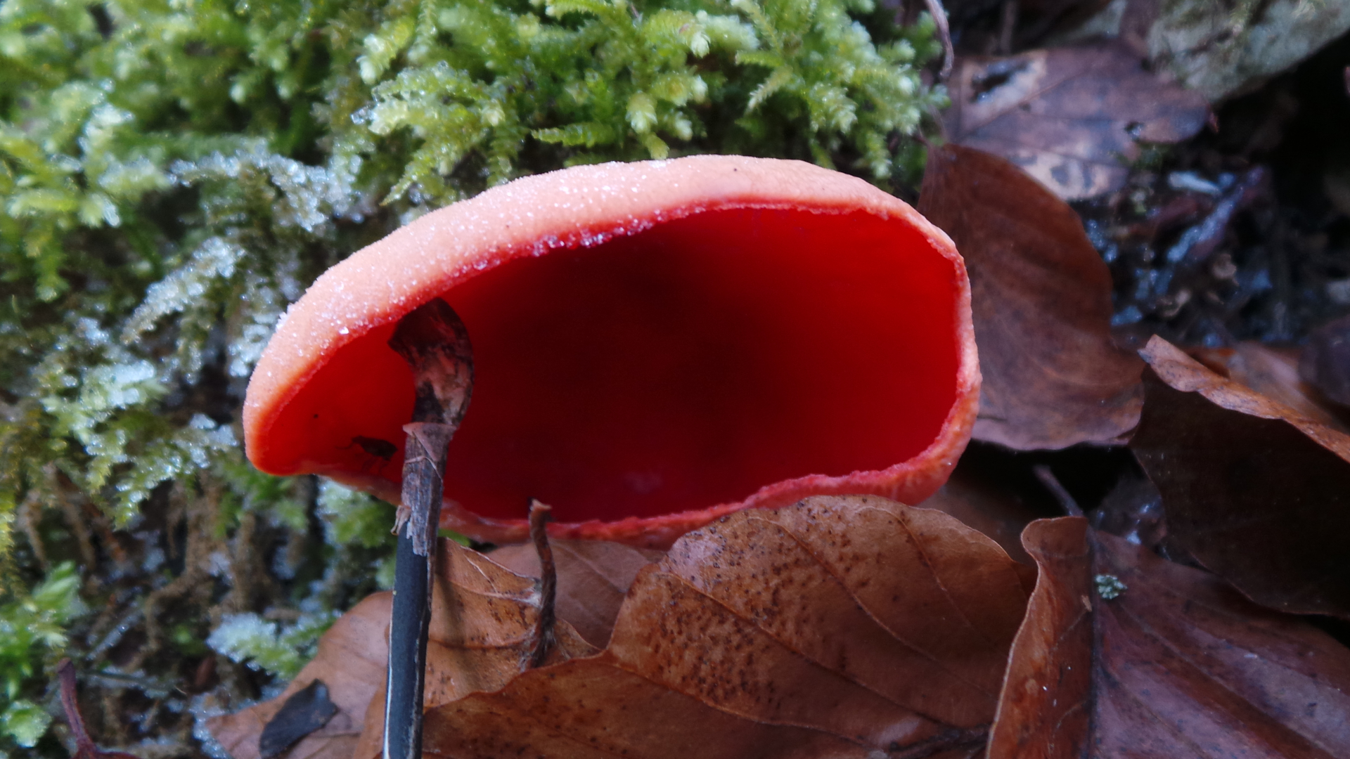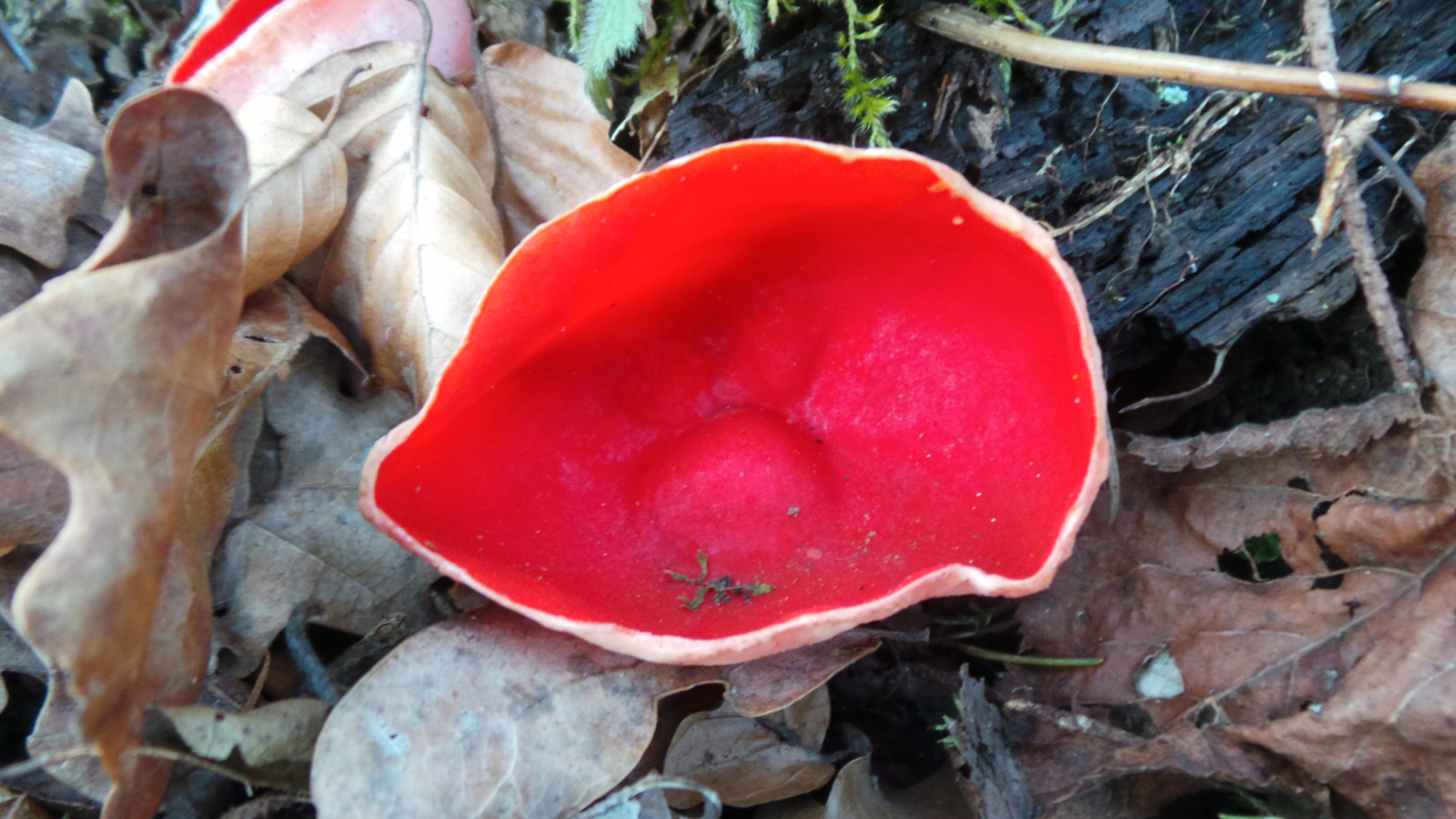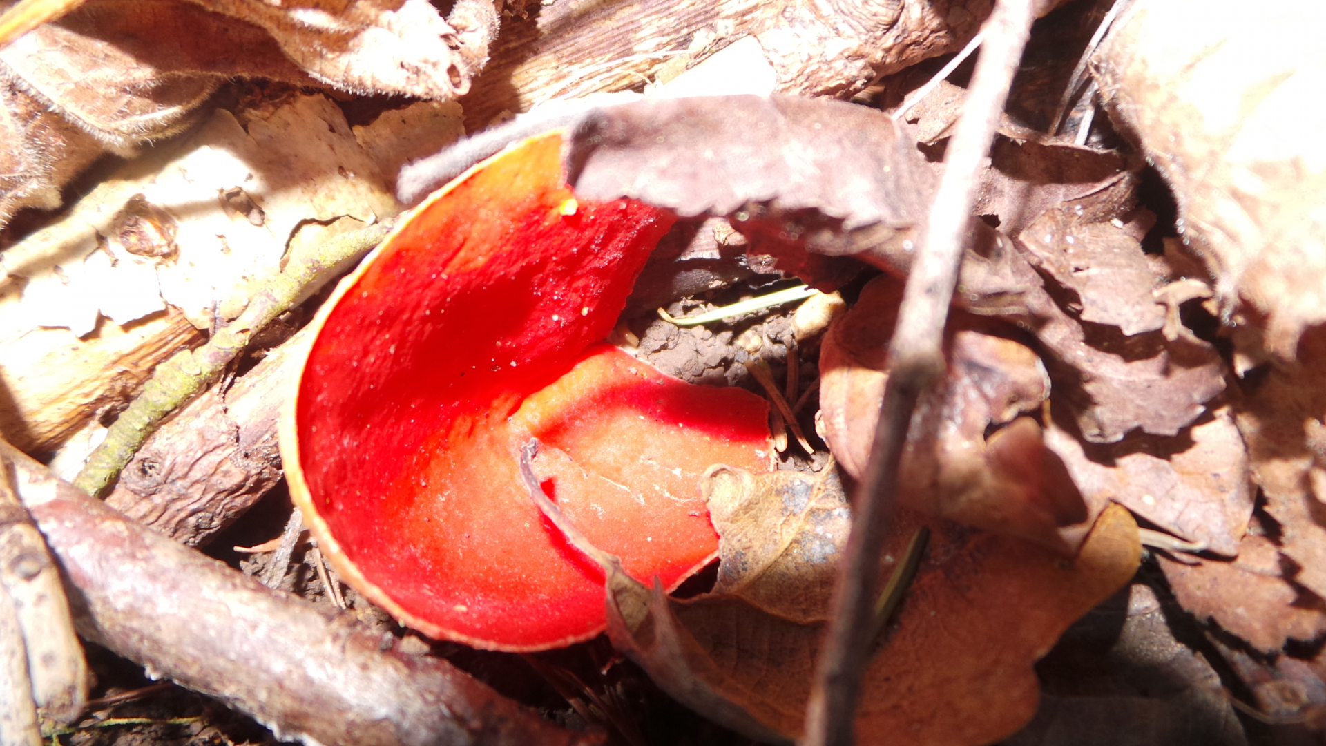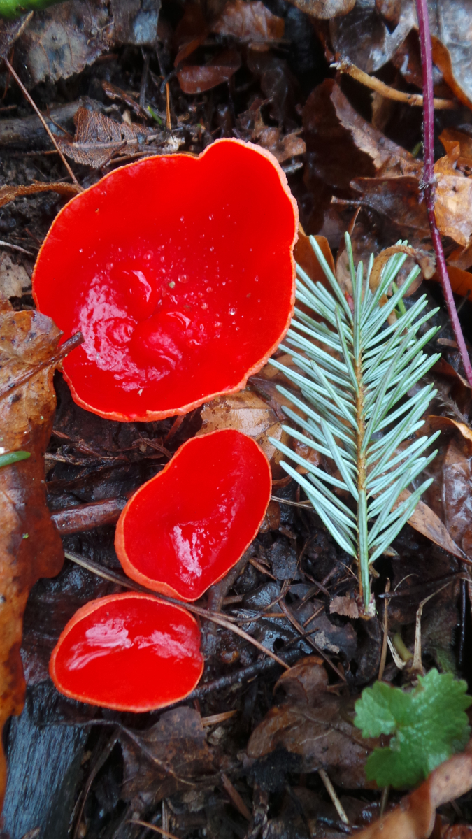 endlich habe ich mal selbst welche gefunden, zinnoberrote Kelchbecherlinge: