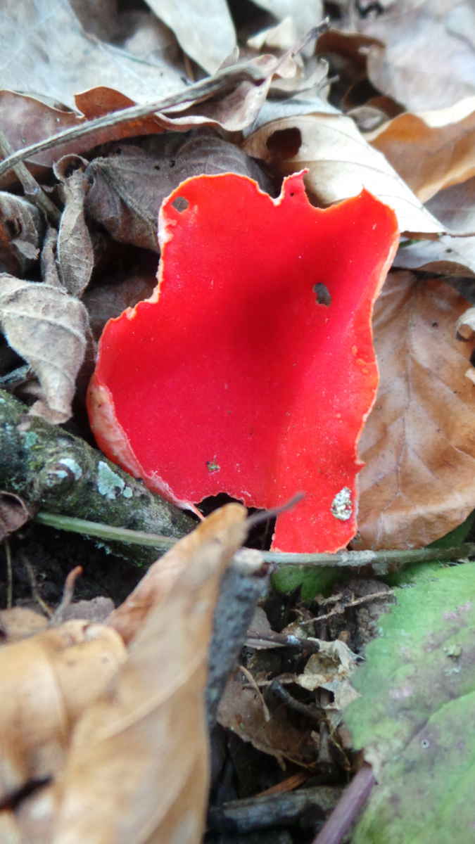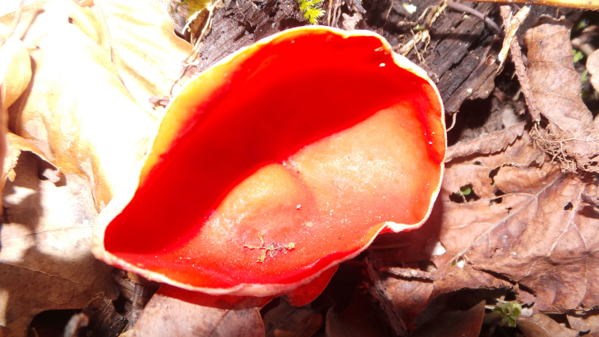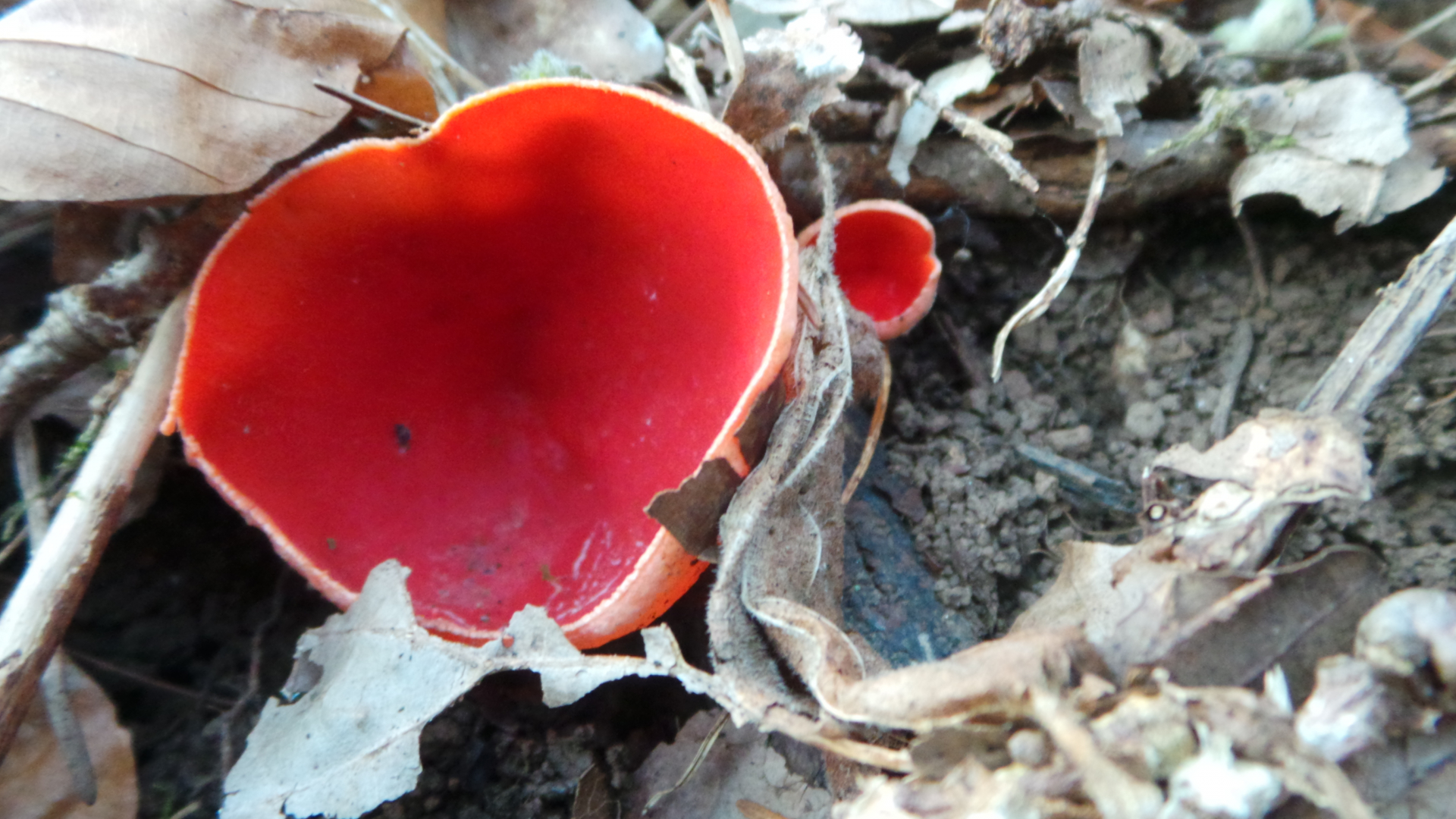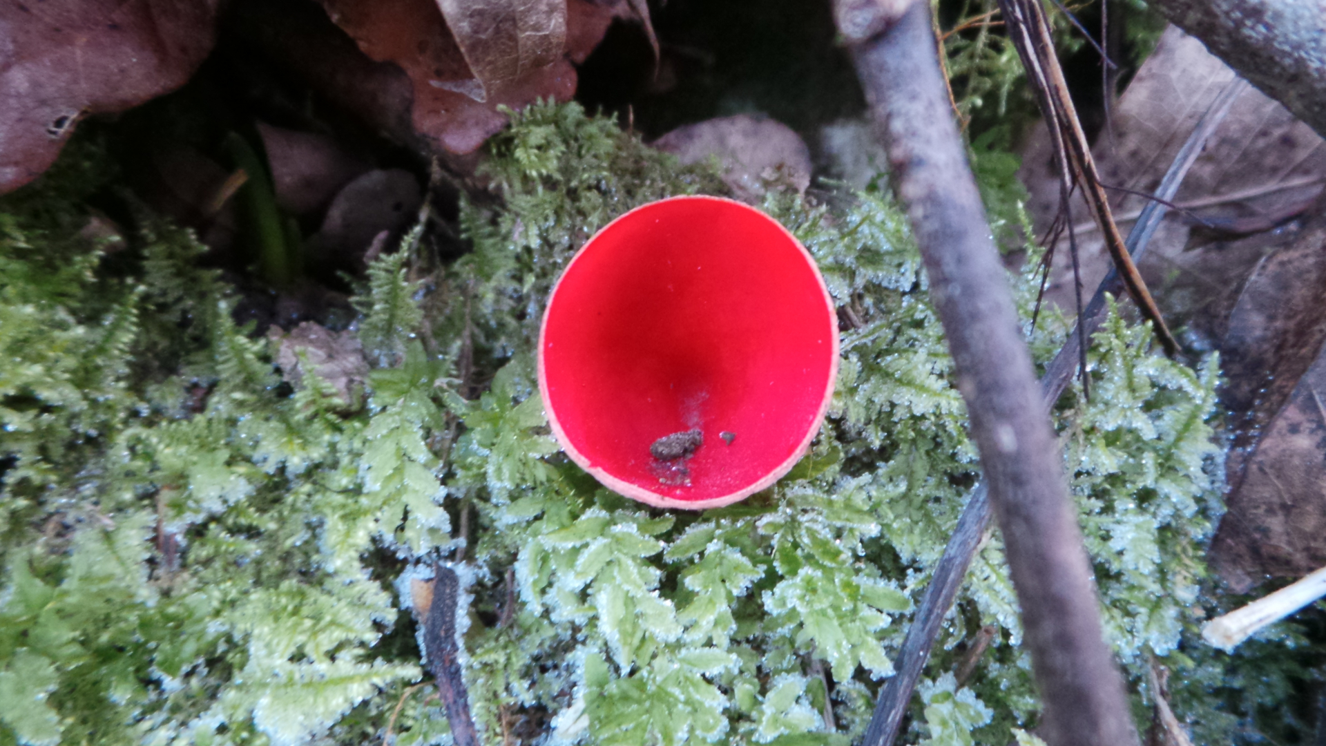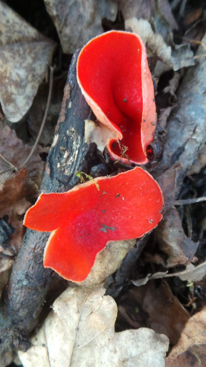 endlich habe ich mal selbst welche gefunden, zinnoberrote Kelchbecherlinge: