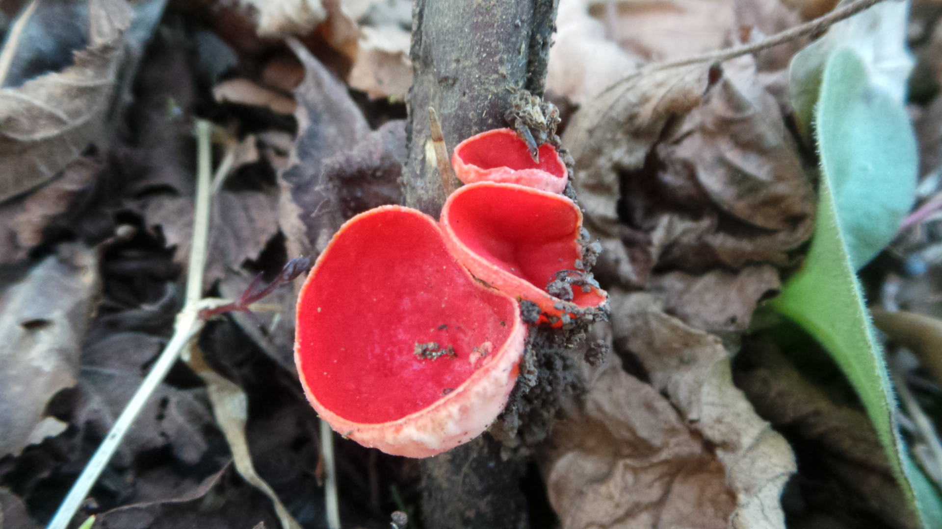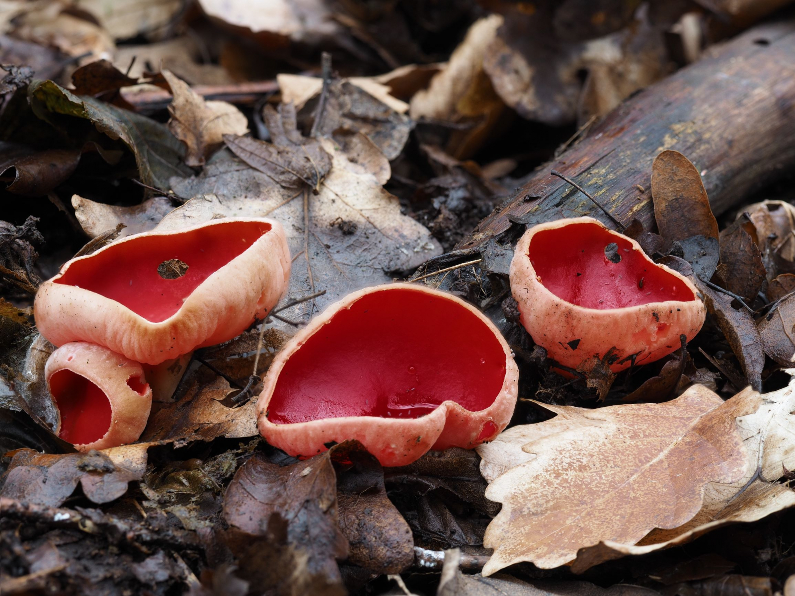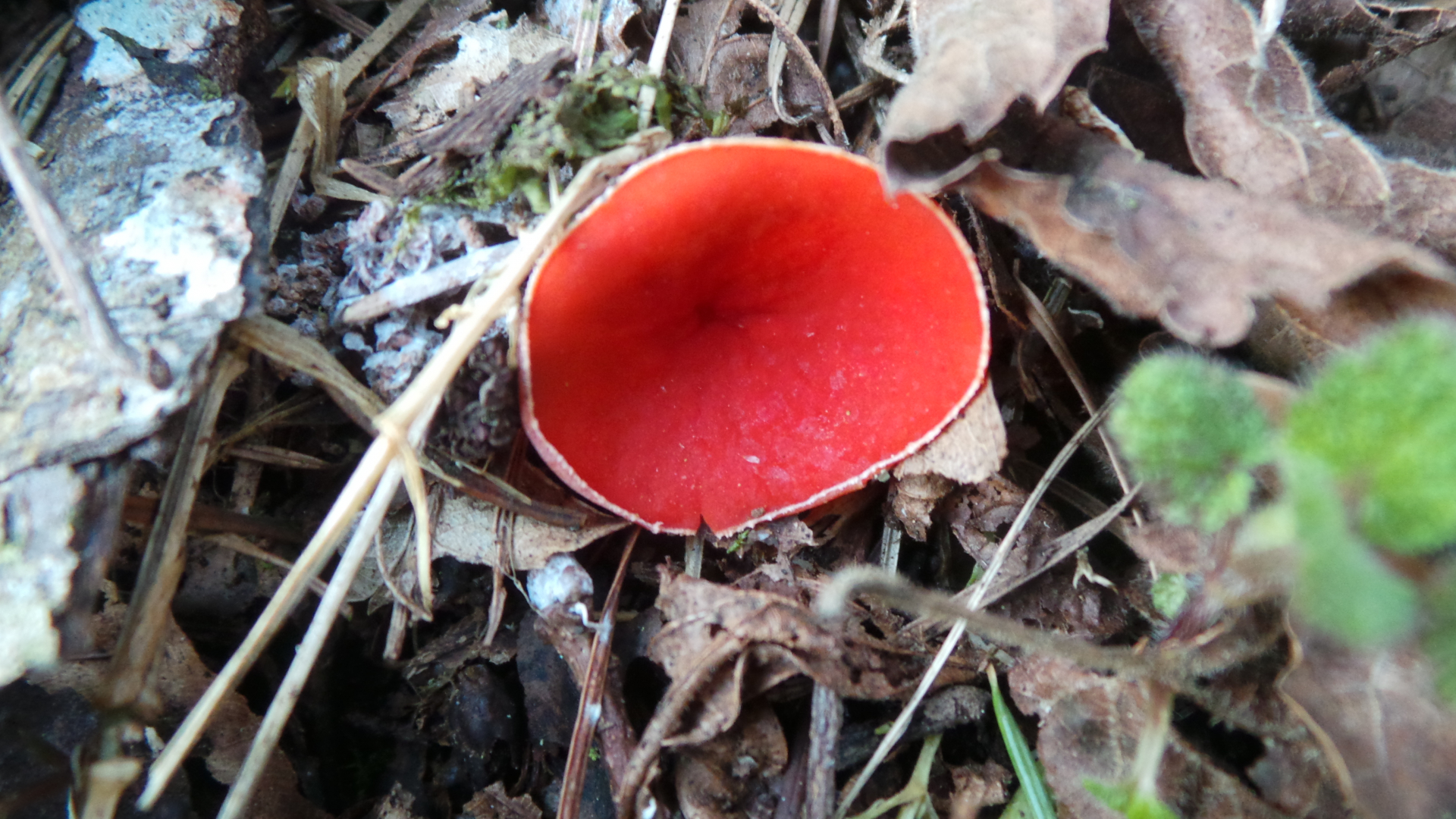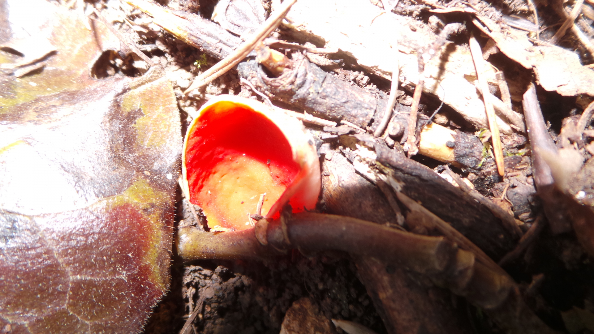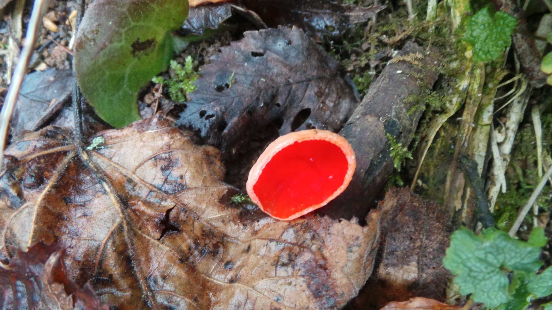 endlich habe ich mal selbst welche gefunden, zinnoberrote Kelchbecherlinge: