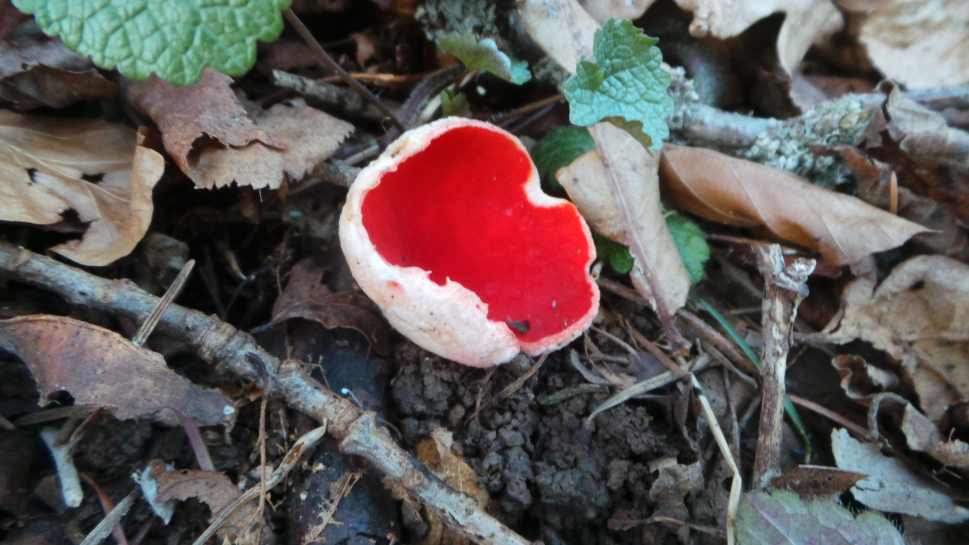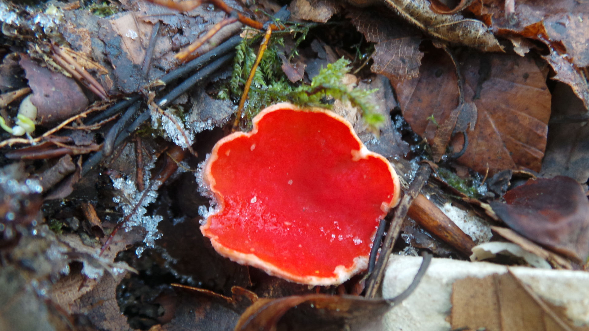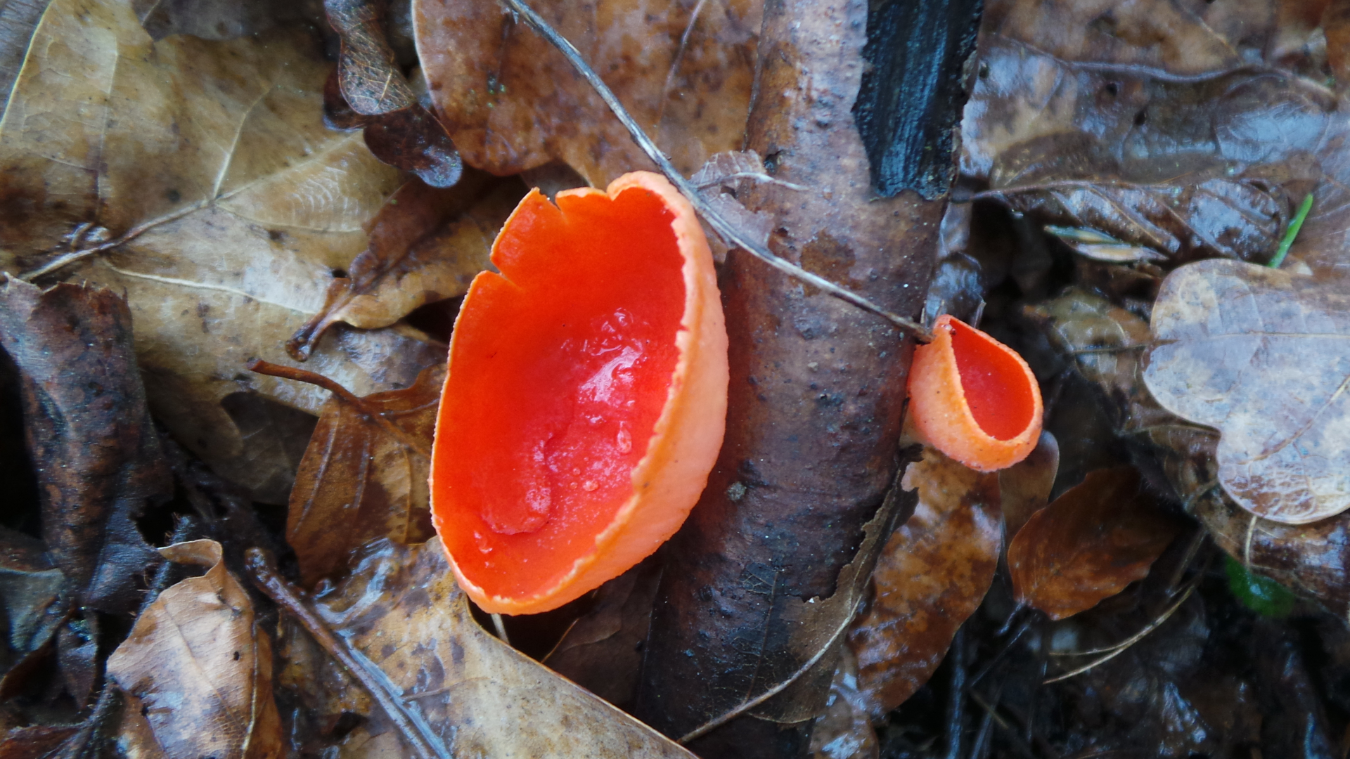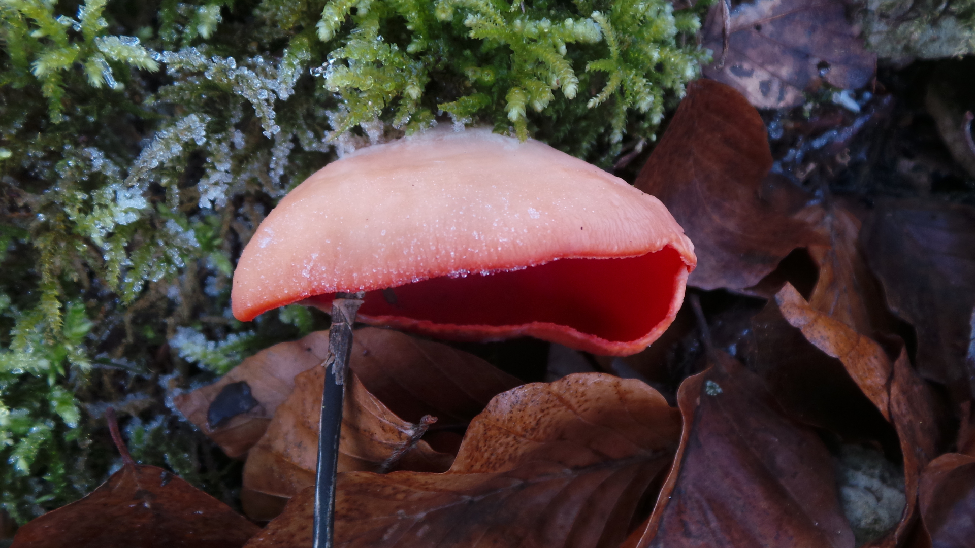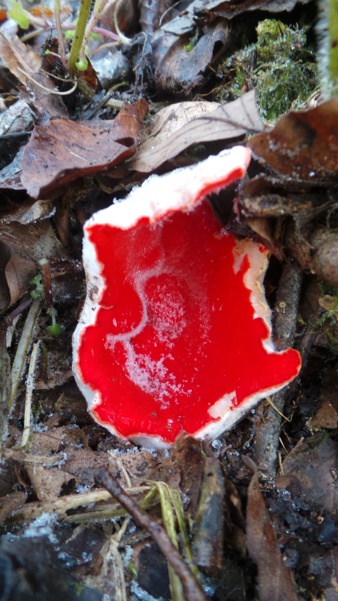 endlich habe ich mal selbst welche gefunden, zinnoberrote Kelchbecherlinge:
