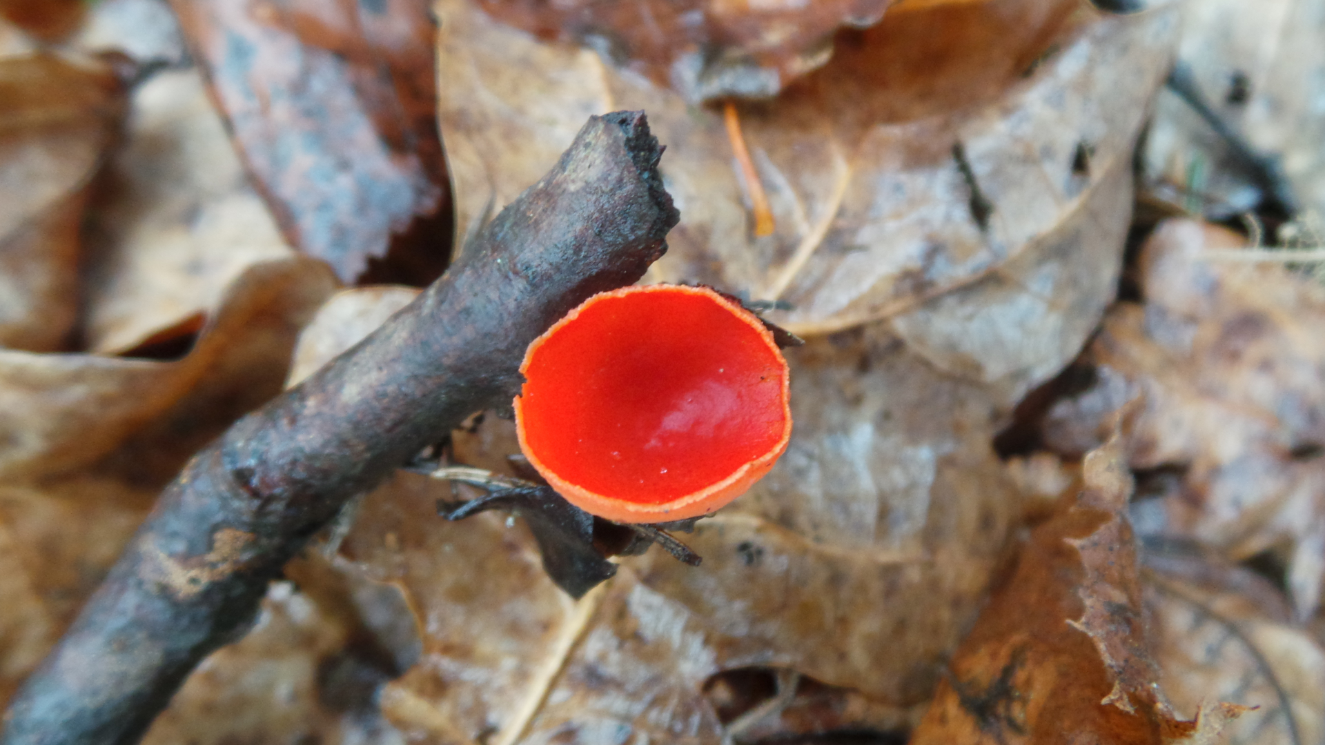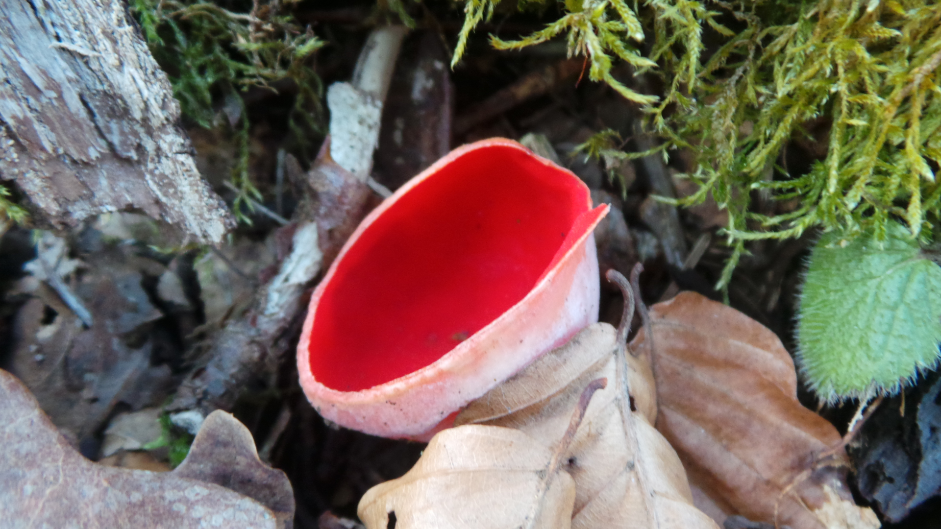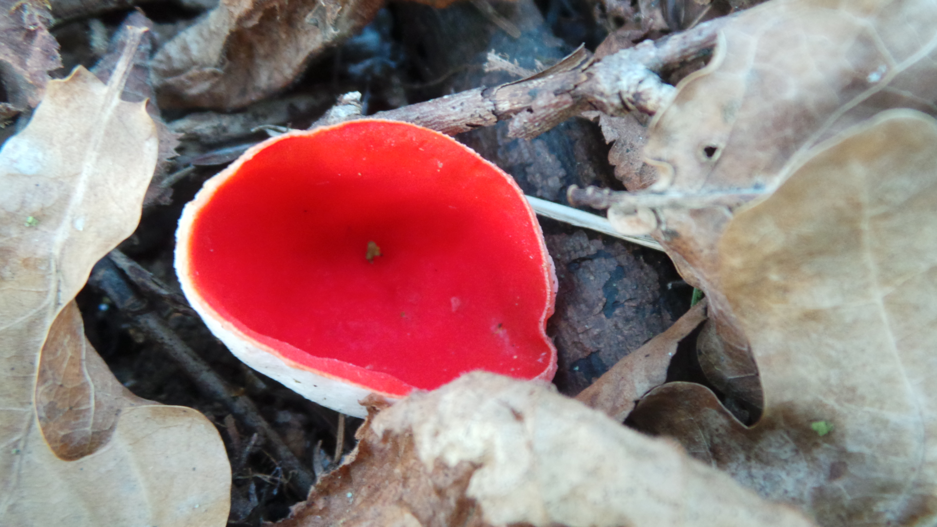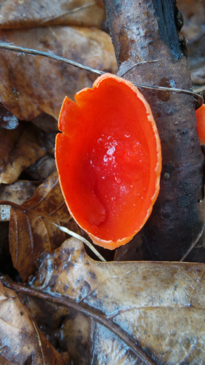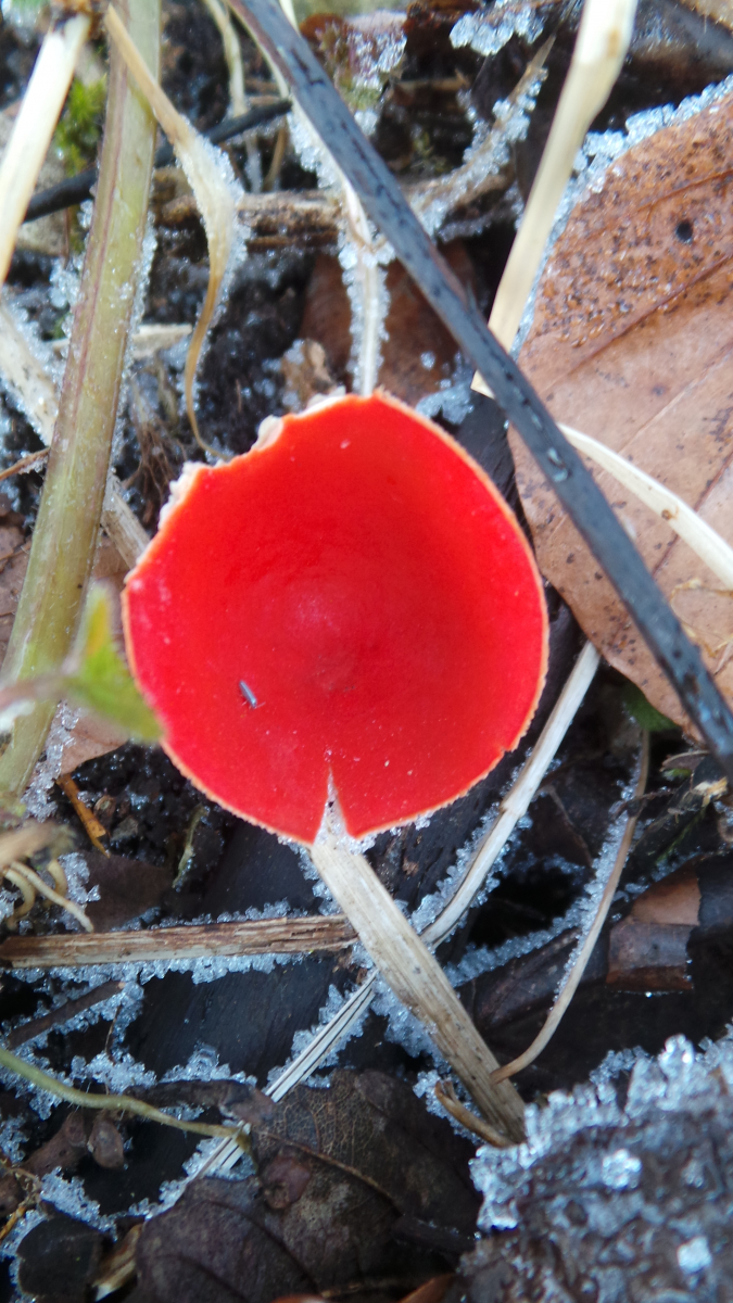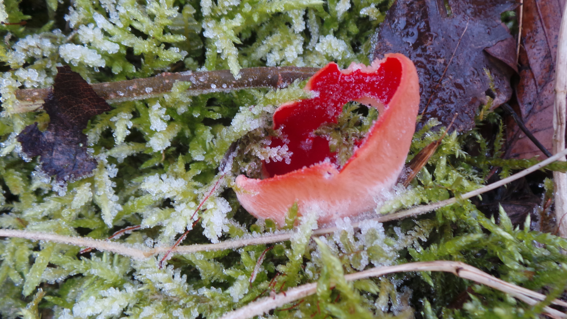 endlich habe ich mal selbst welche gefunden, zinnoberrote Kelchbecherlinge: