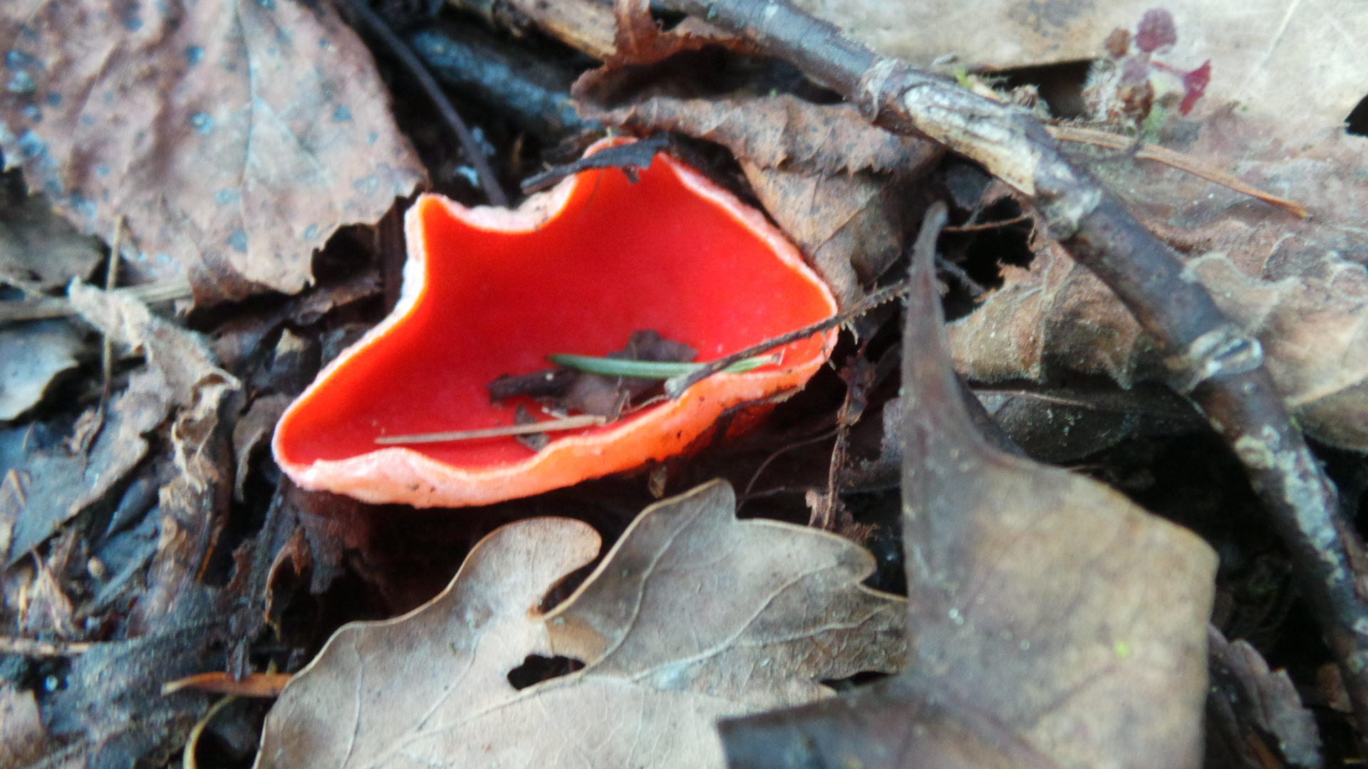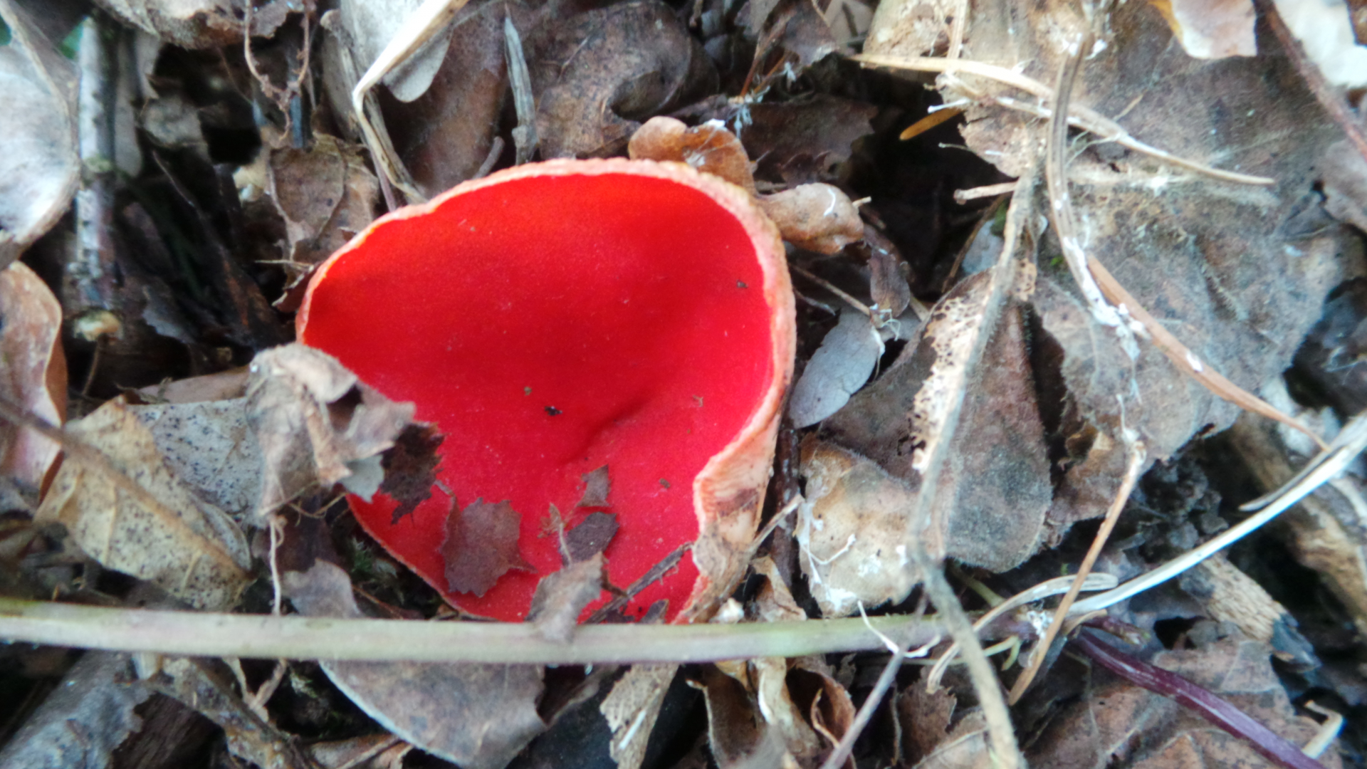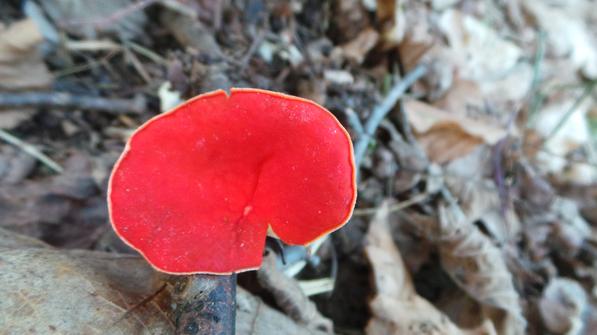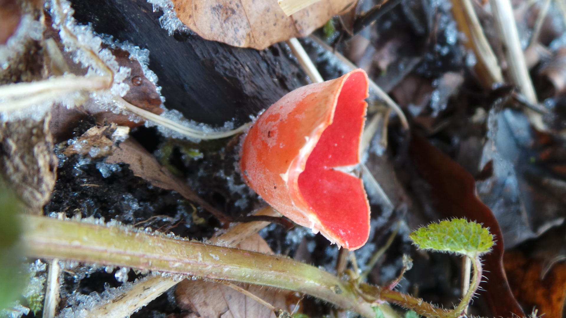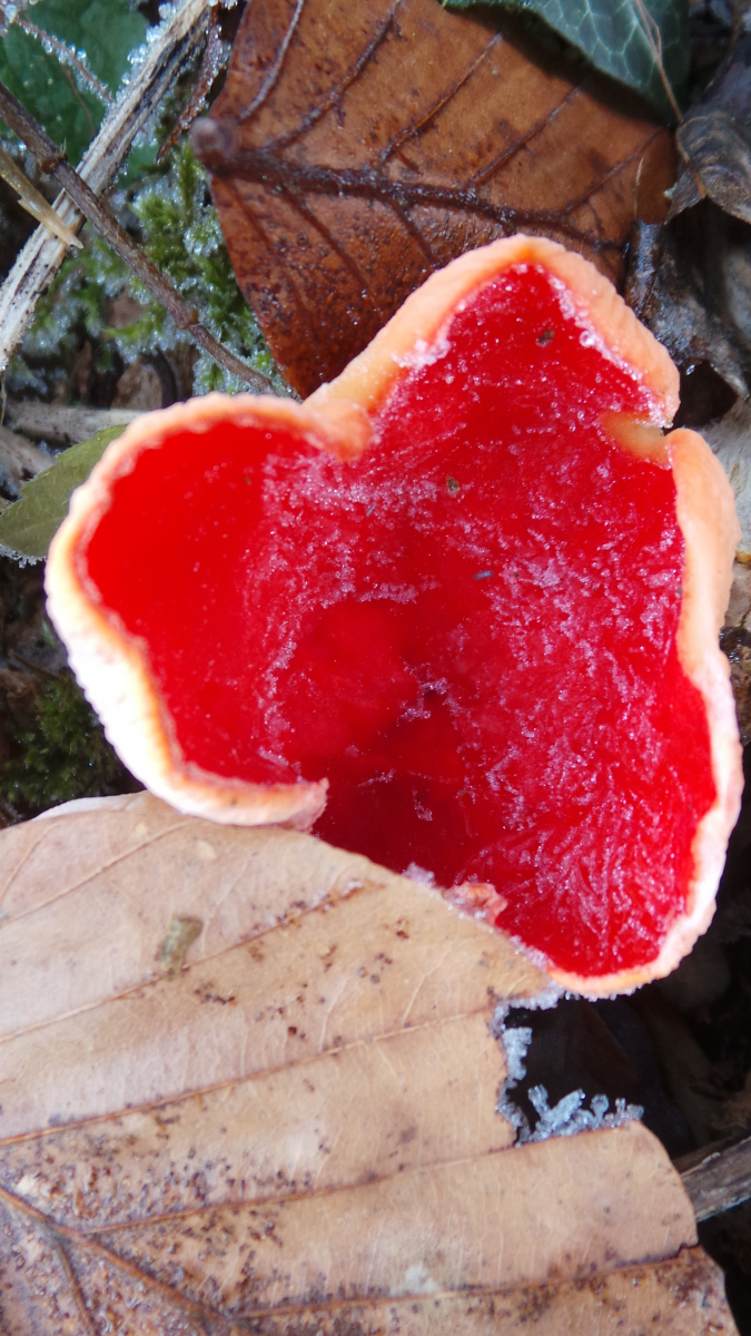 endlich habe ich mal selbst welche gefunden, zinnoberrote Kelchbecherlinge: