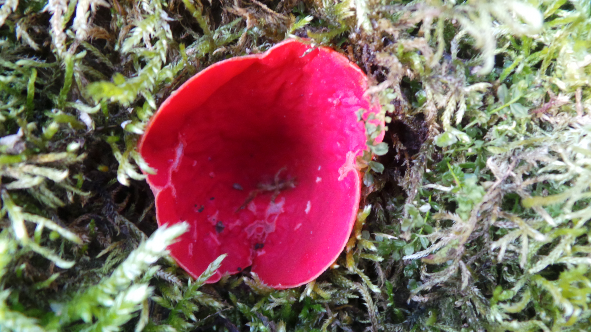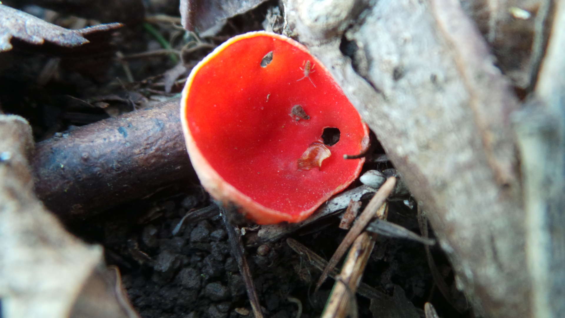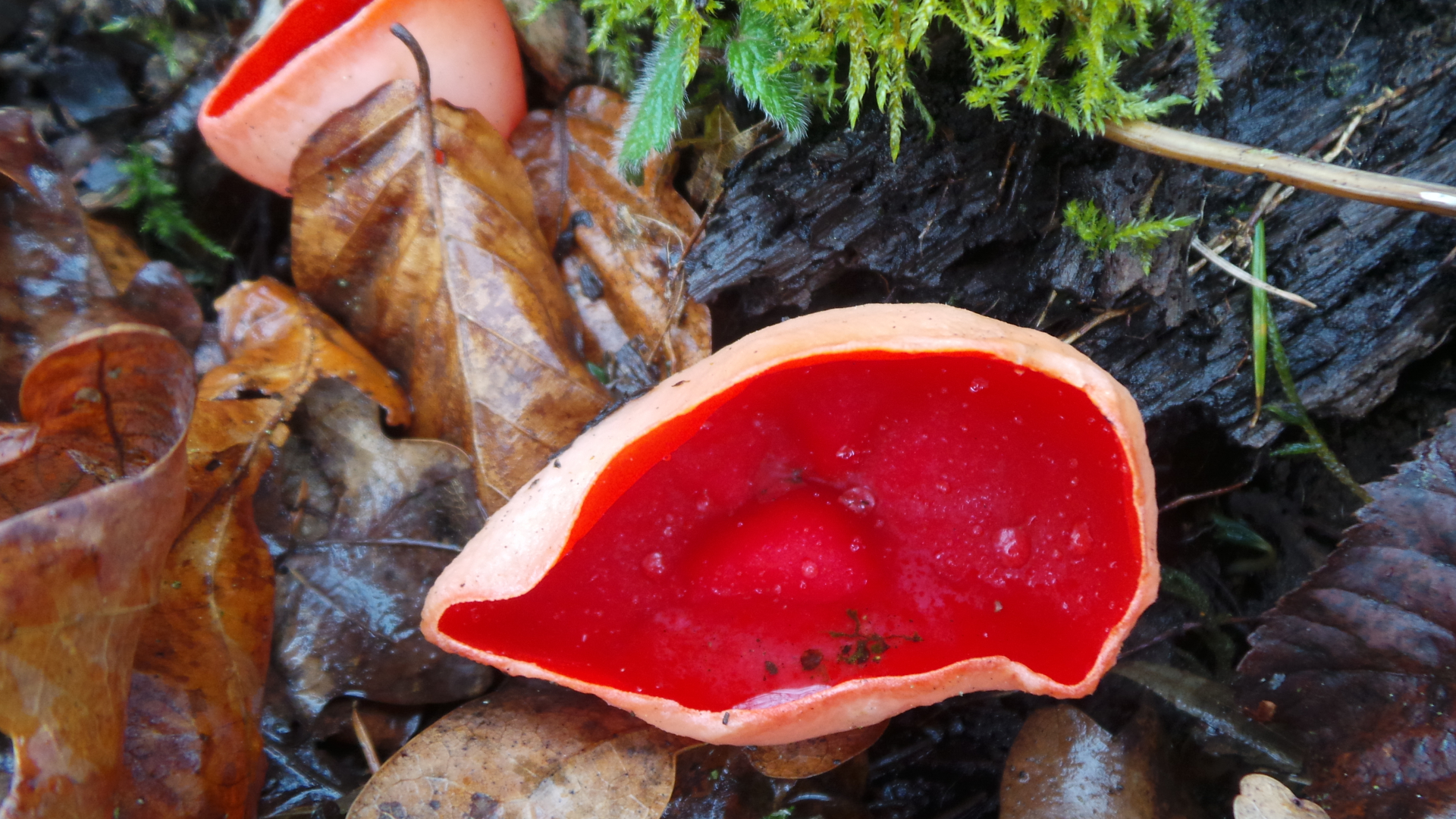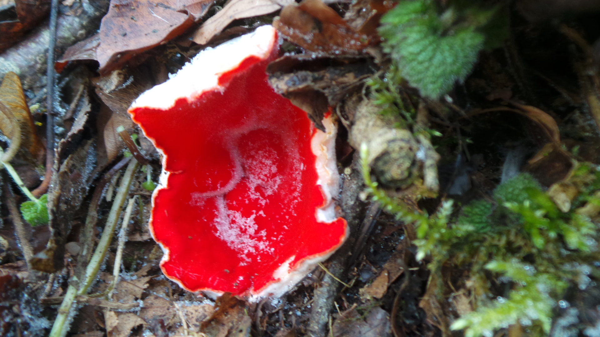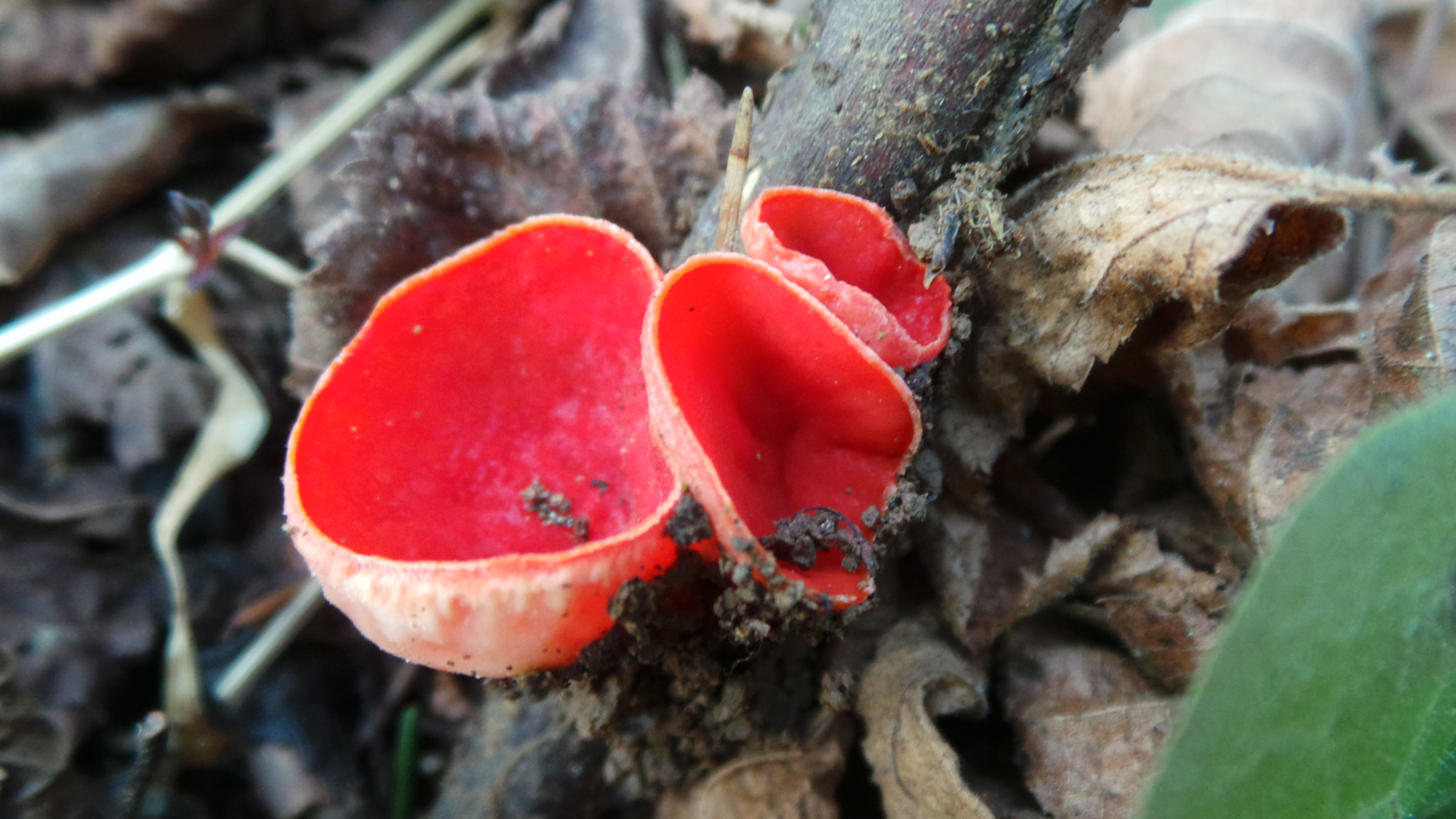 endlich habe ich mal selbst welche gefunden, zinnoberrote Kelchbecherlinge: