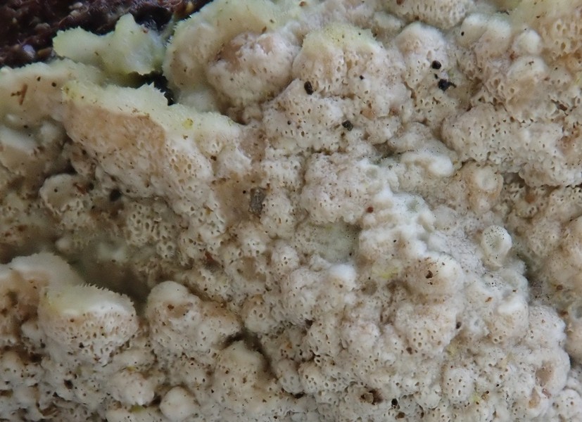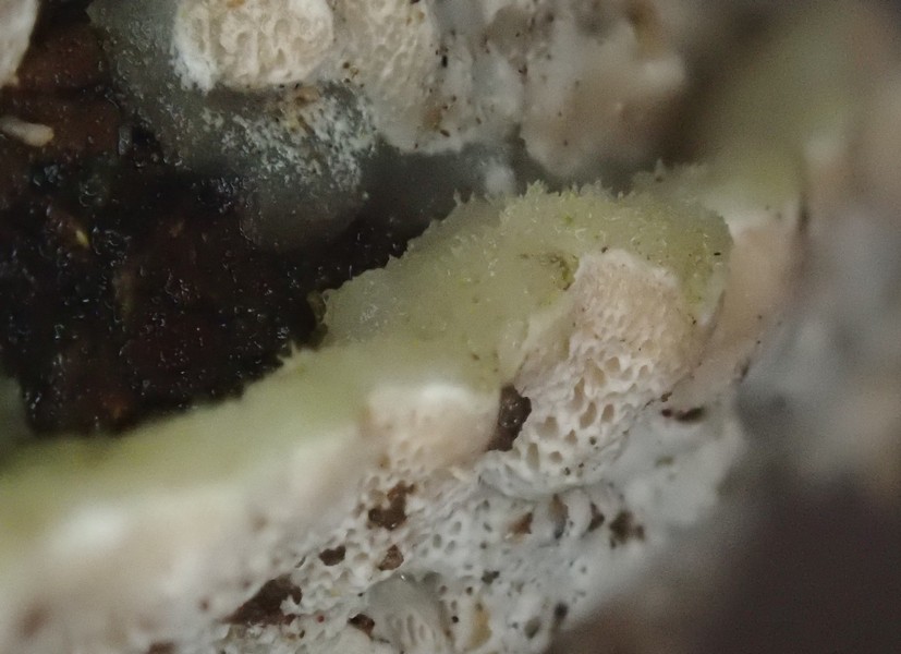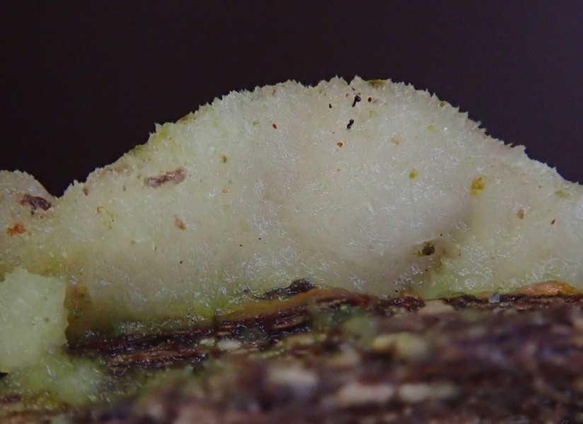Der fast resupinate, sich eher weich bis wachsig anfühlende kleine Porling bildet schmale filzige Hutkanten aus, die nur wenige Millimeter abstehen und - wohl von Algen - leicht grünlich aussehen.