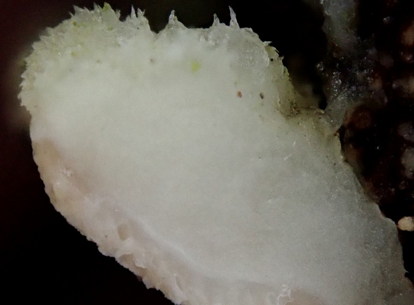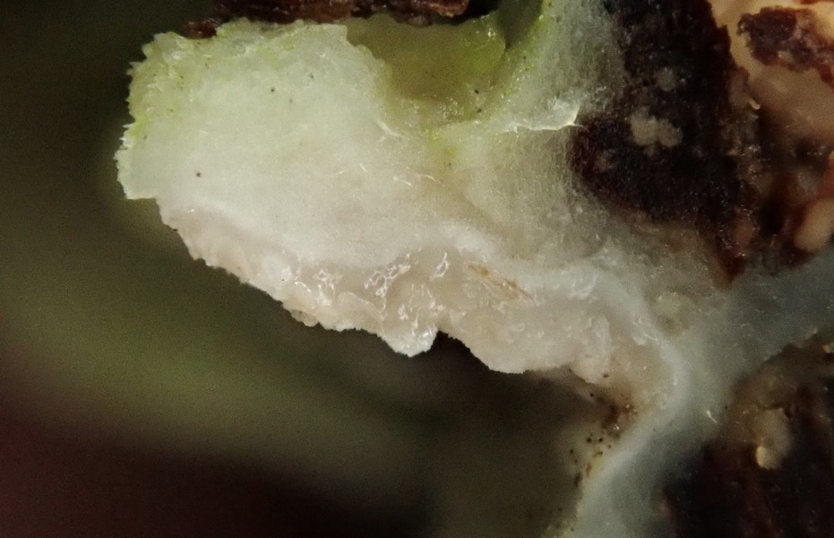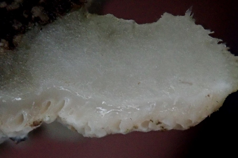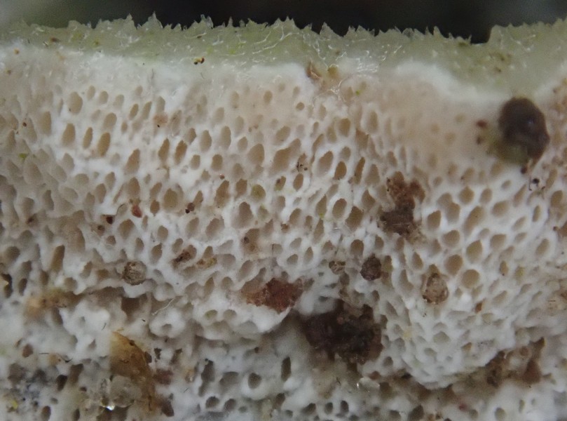 Der fast resupinate, sich eher weich bis wachsig anfühlende kleine Porling bildet schmale filzige Hutkanten aus, die nur wenige Millimeter abstehen und - wohl von Algen - leicht grünlich aussehen.