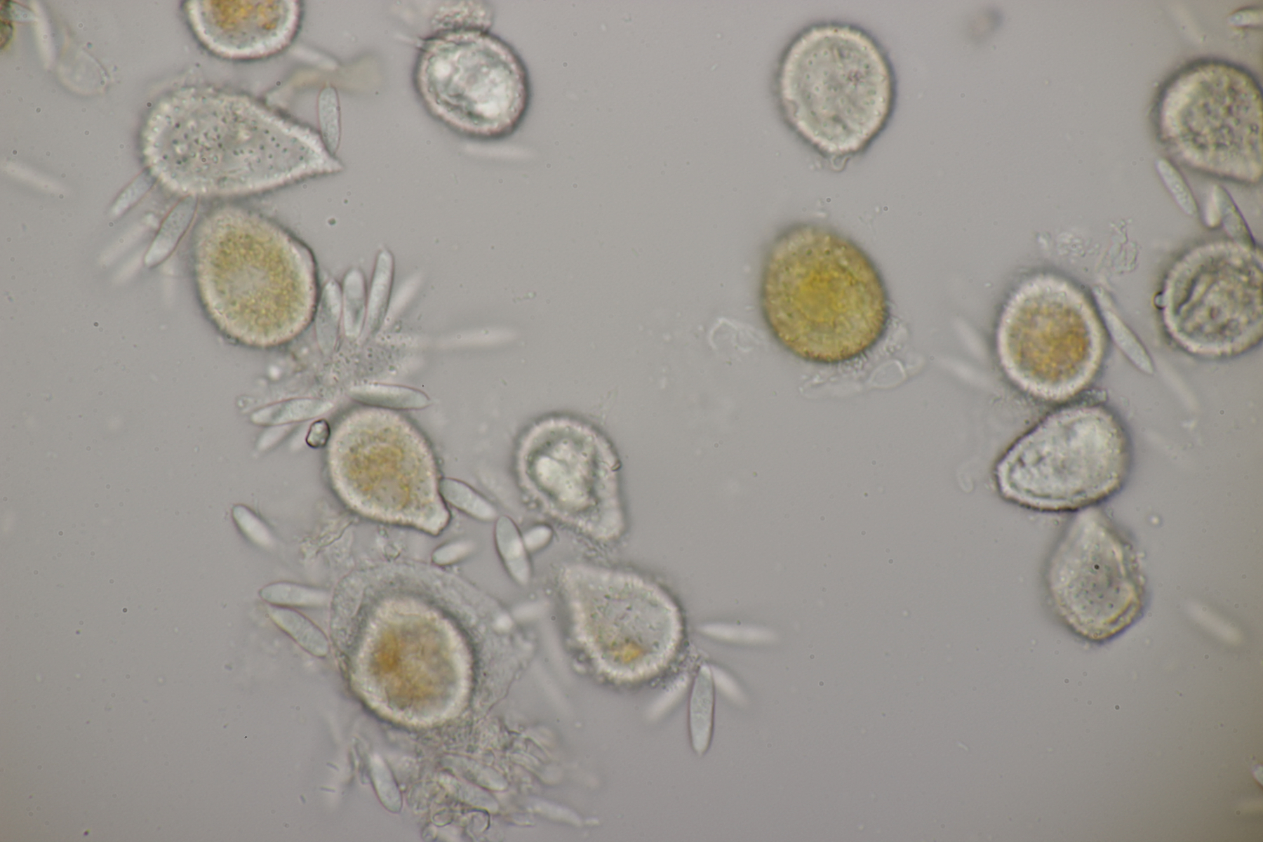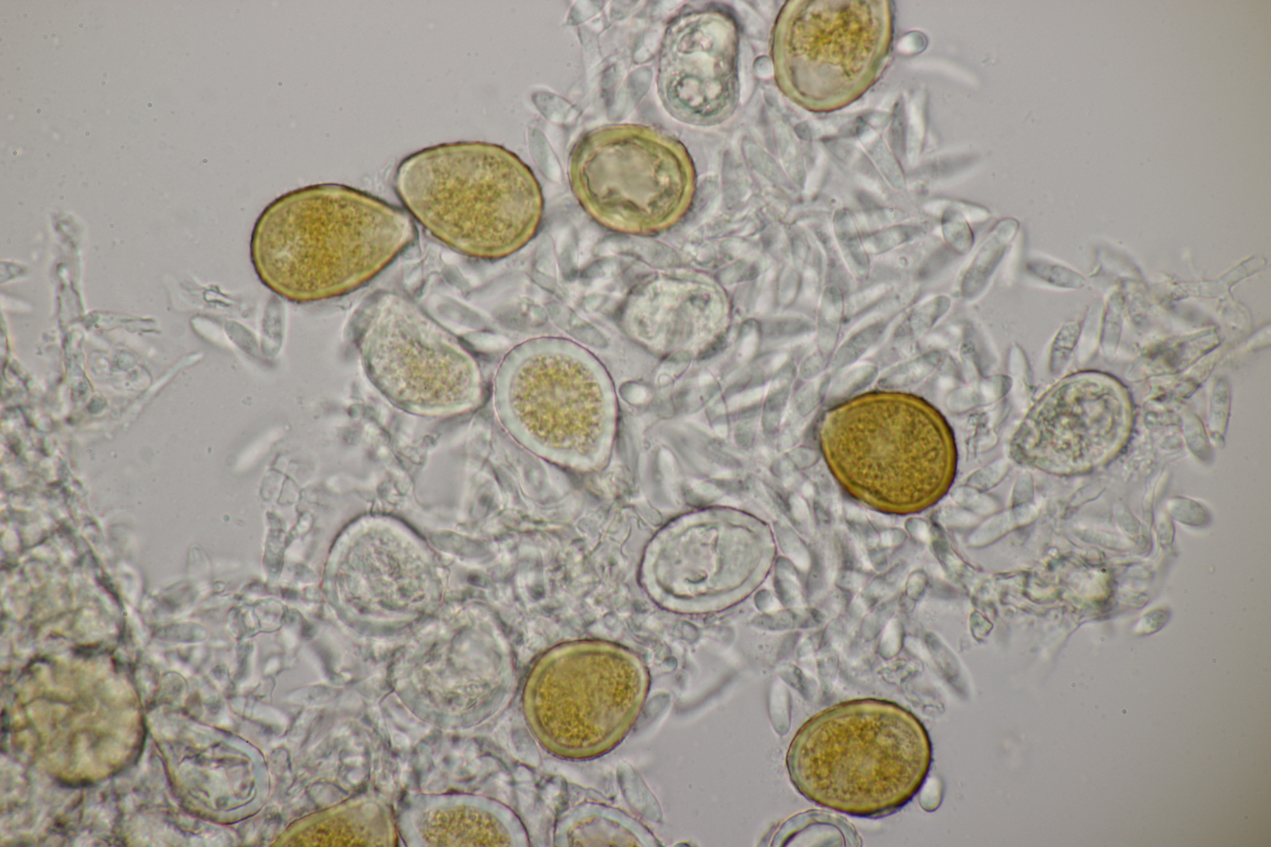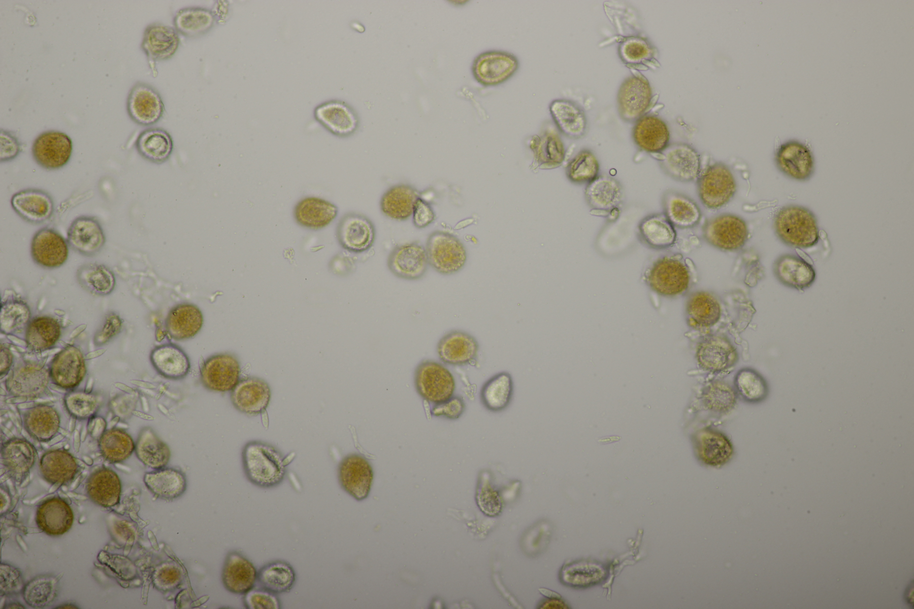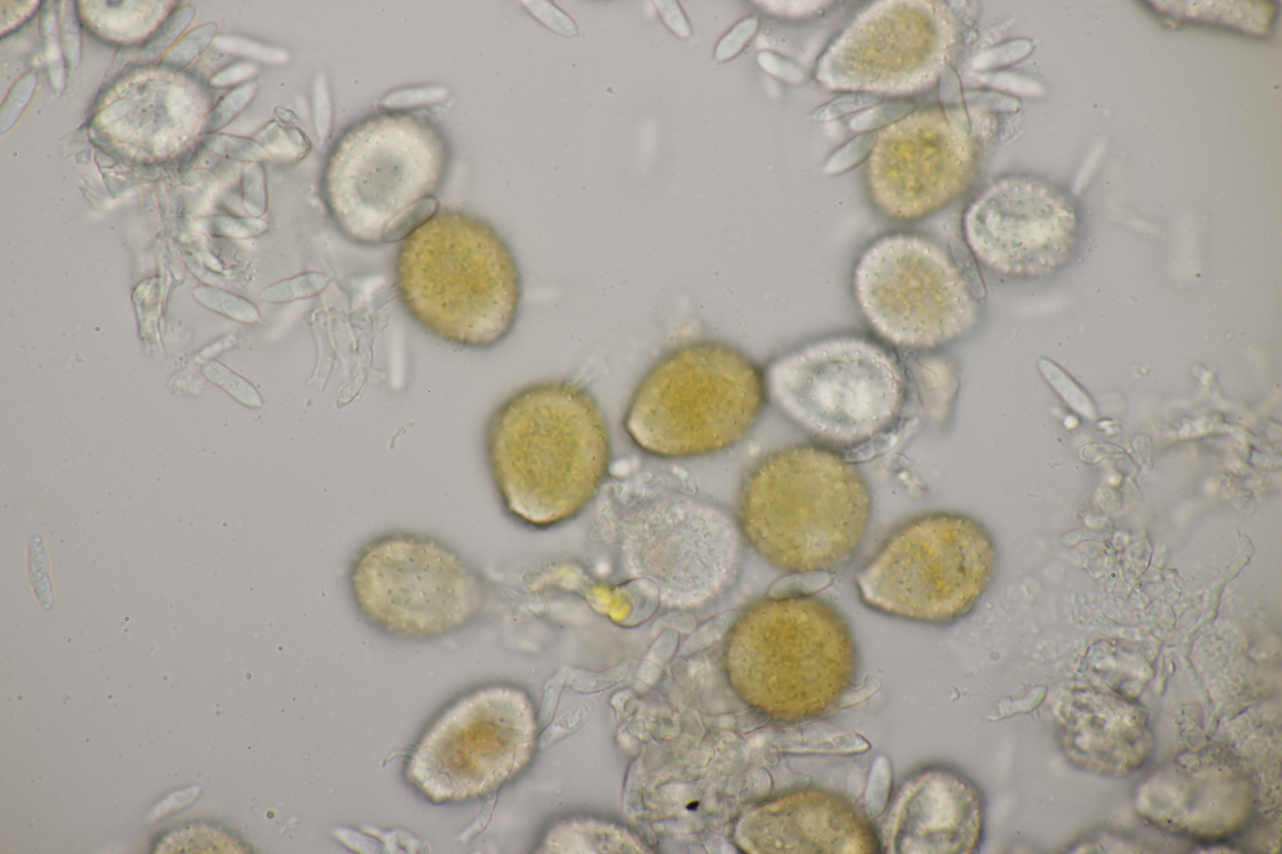 8. Nach jeder Menge Frühsport dann endlich die heißersehnten Flecken auf Bellis! Im Mikroskop fanden sich auch Sporen, die aber alle um die 10 µm groß sind. Also nicht der gesuchte Protomycopsis sondern Entyloma bellidis ex Bellis perennis. Aber auch das ein Erstfund für mich.