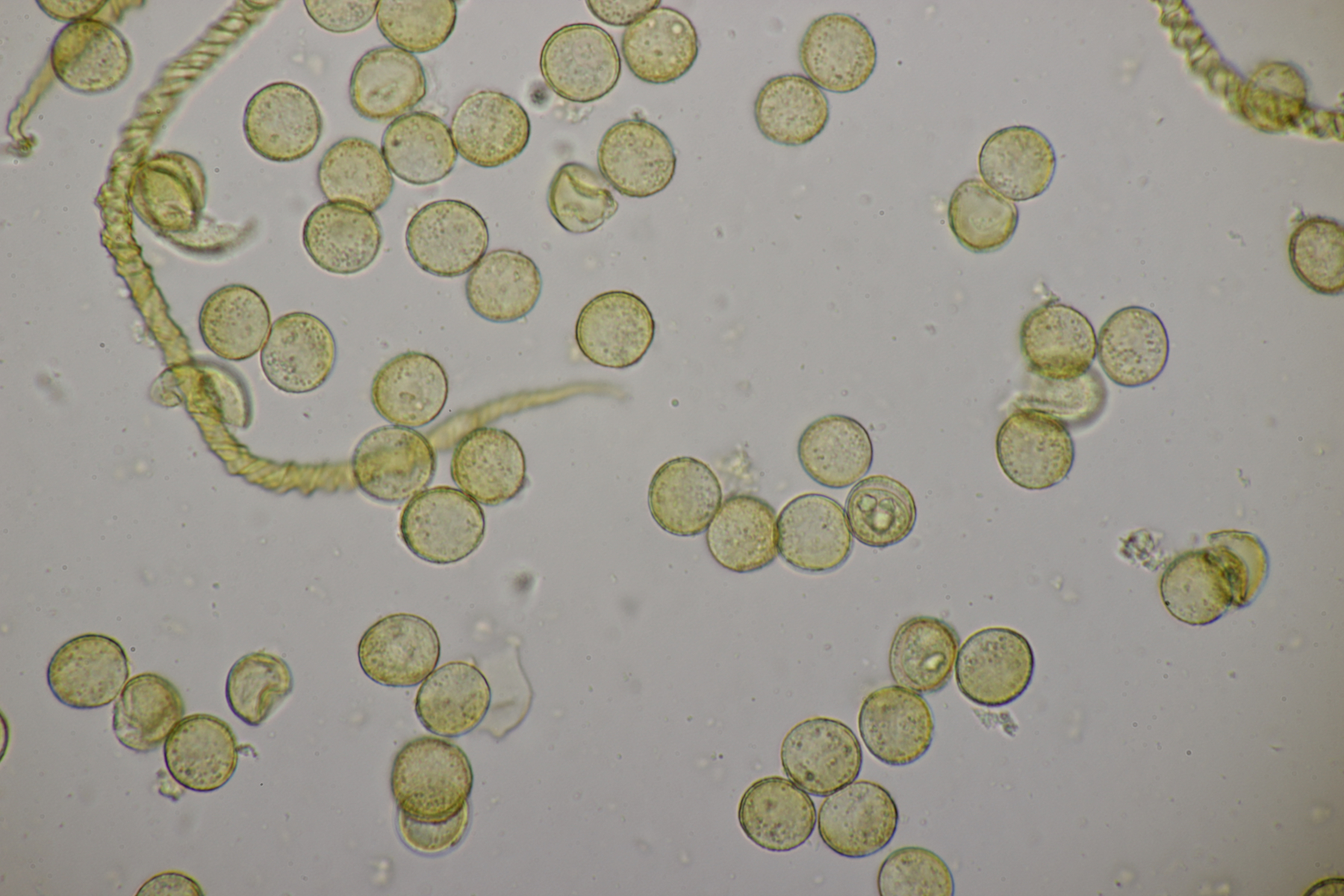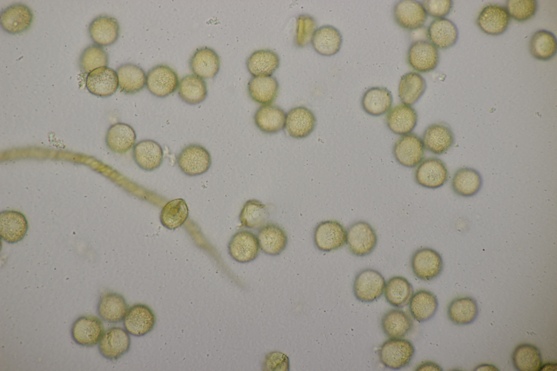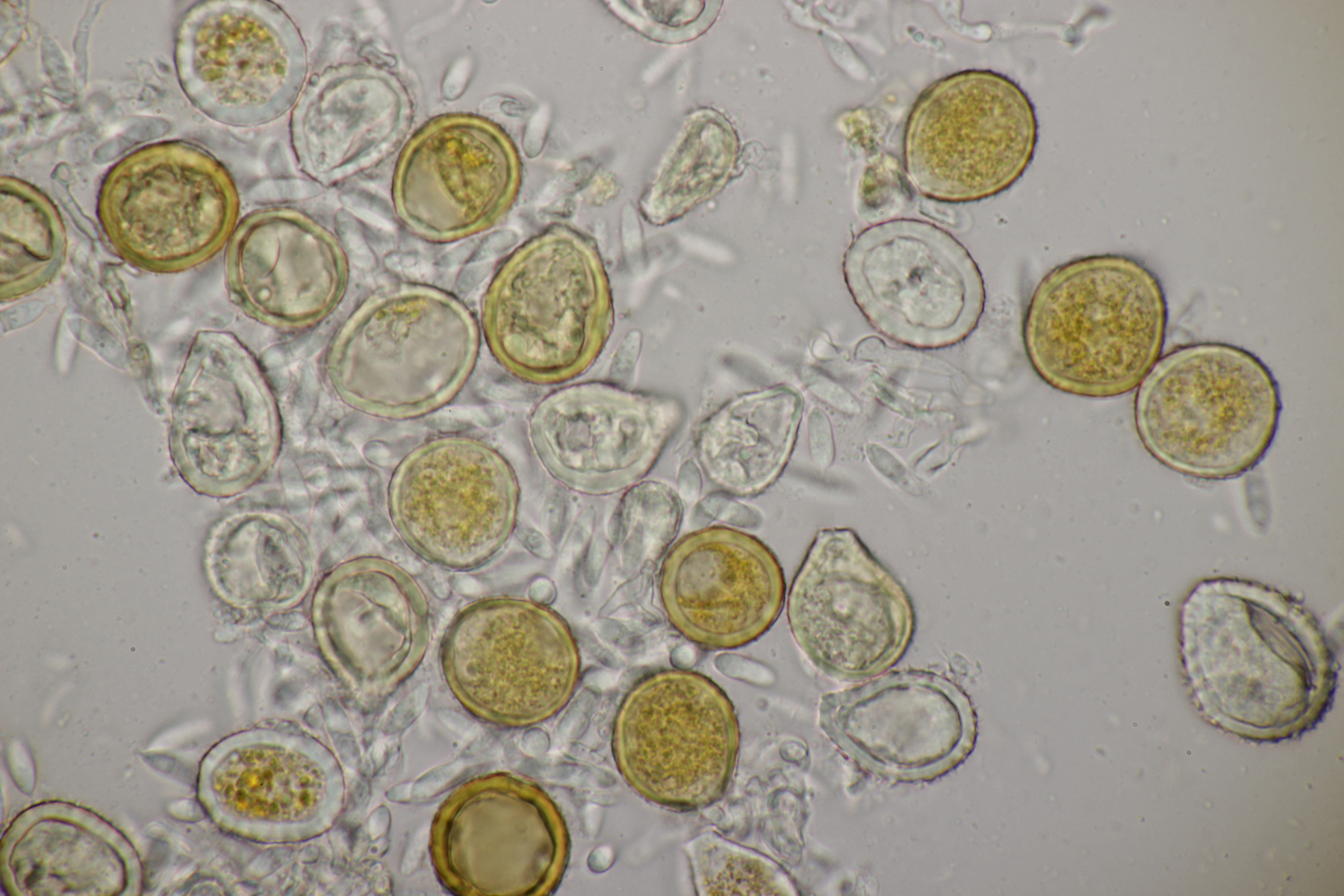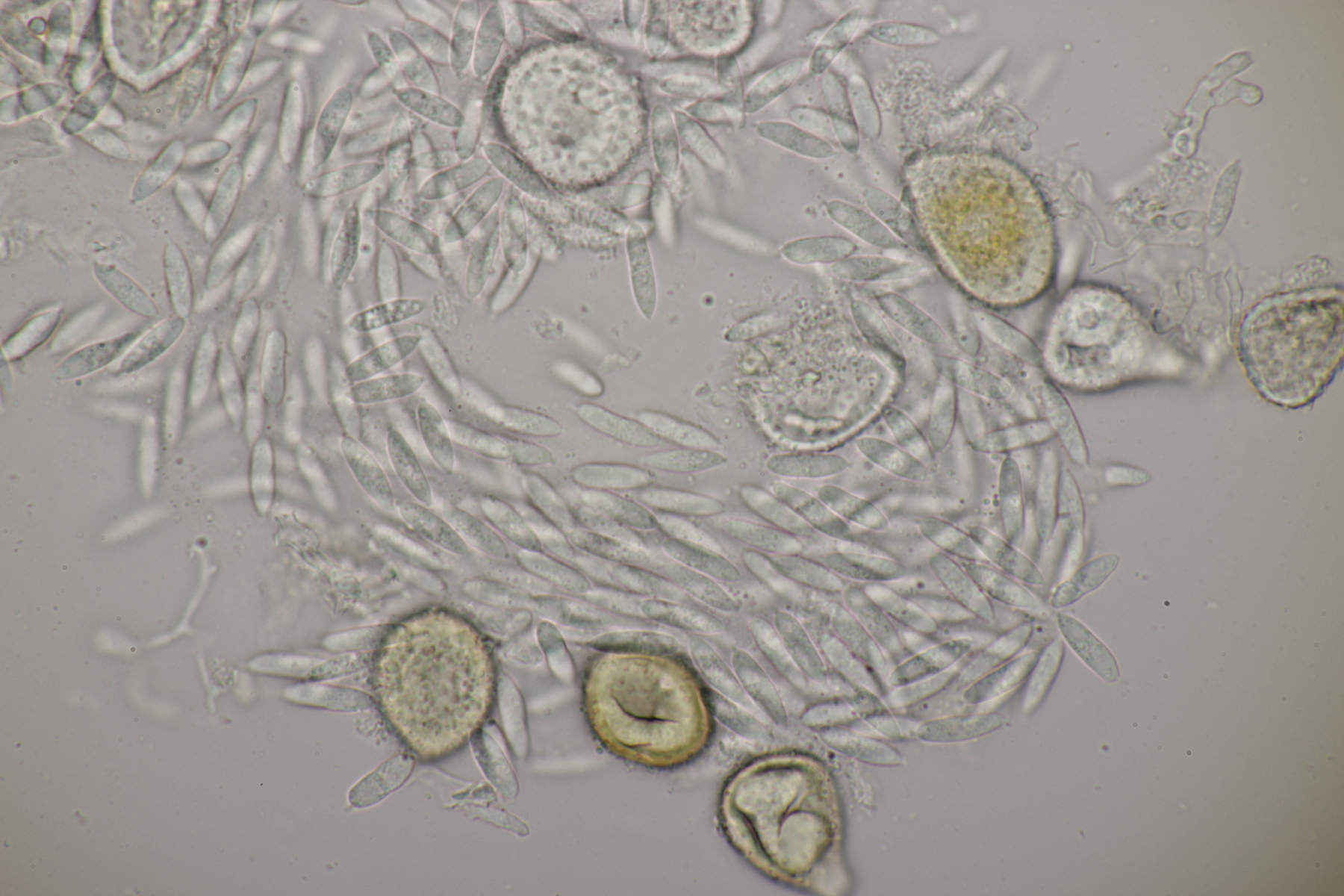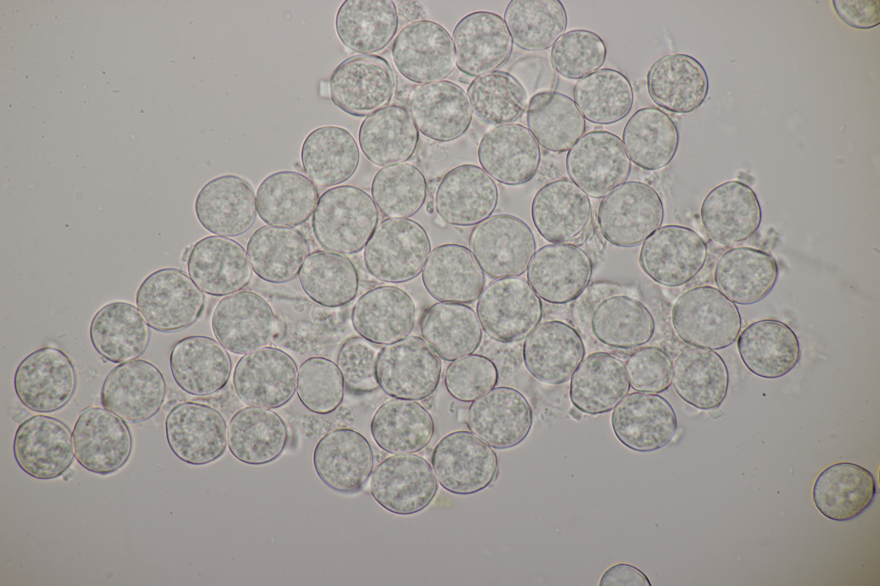8. Nach jeder Menge Frühsport dann endlich die heißersehnten Flecken auf Bellis! Im Mikroskop fanden sich auch Sporen, die aber alle um die 10 µm groß sind. Also nicht der gesuchte Protomycopsis sondern Entyloma bellidis ex Bellis perennis. Aber auch das ein Erstfund für mich.